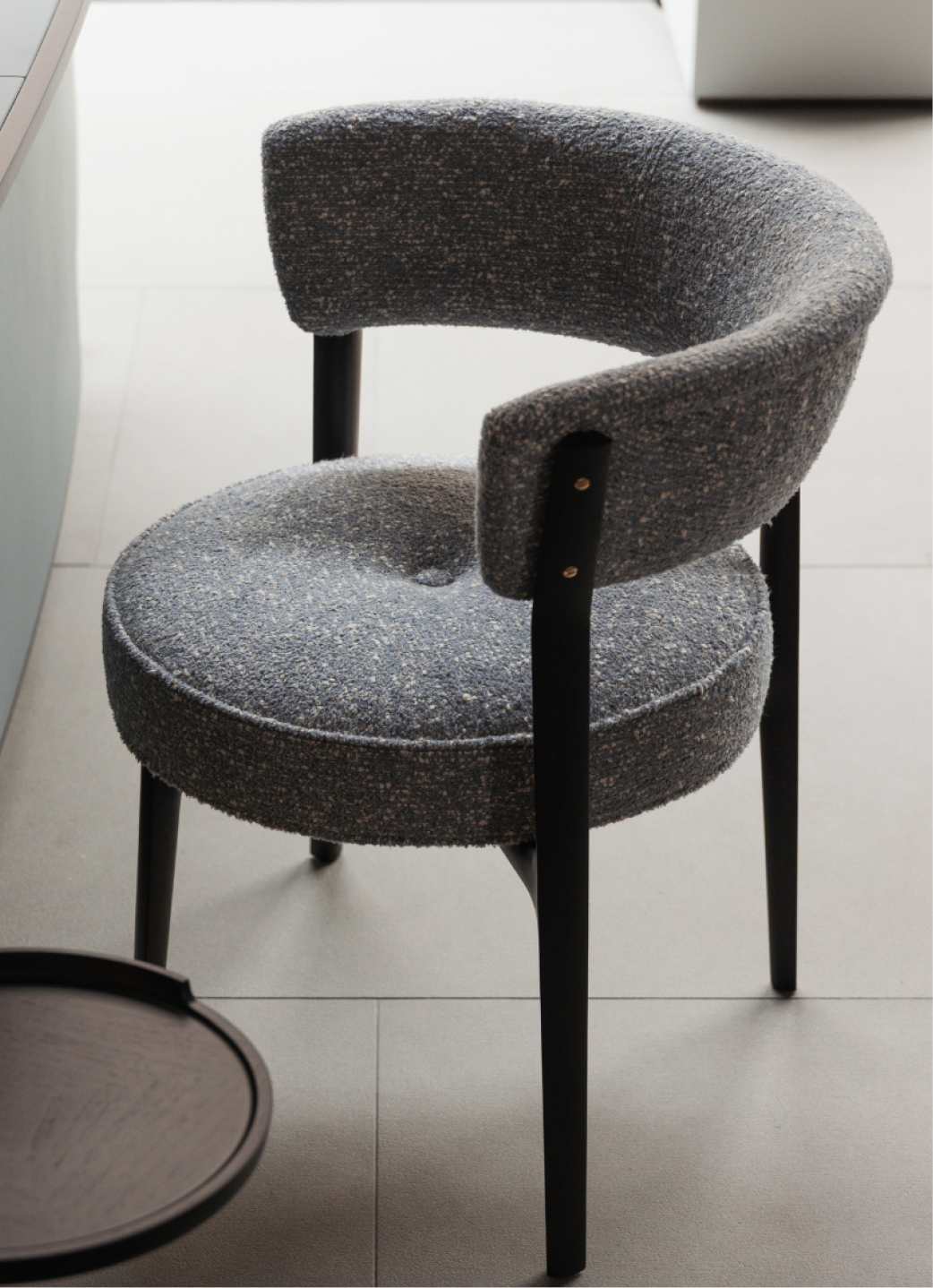DRAW Studio's Eugene Armchair for Ceccotti Collezioni caught us early and held our attention. A joyful reinterpretation of mid-century form, it channels the rounded shapes and enveloping comfort of 1950s and '60s design through a decidedly contemporary lens. The construction is quietly rigorous, circular in plan, grounded on a solid wood cross base, with a generous round seat finished by a single, elegant button.