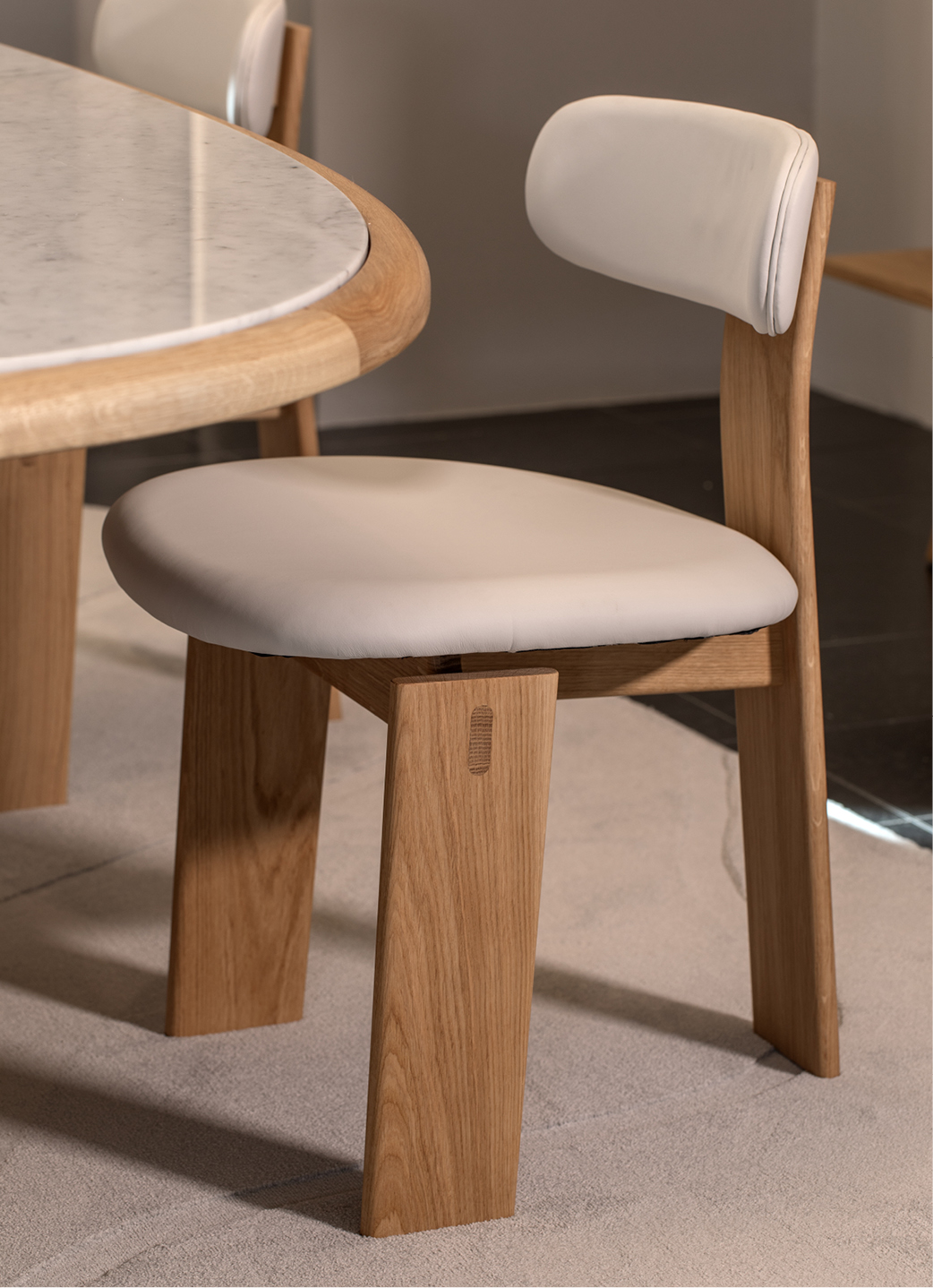 Pieter Maes's Bracci armchair is a study in the language of embrace. The designer continues his exploration of sculptural seating with this piece, where the delicately curved backrest gathers leather naturally at its centre, as though inviting the body to settle in. Built around a solid oak frame in Coal brushed finish, with Lenis Amber leather, the Bracci exemplifies the kind of emotional restraint that marks excellent design.