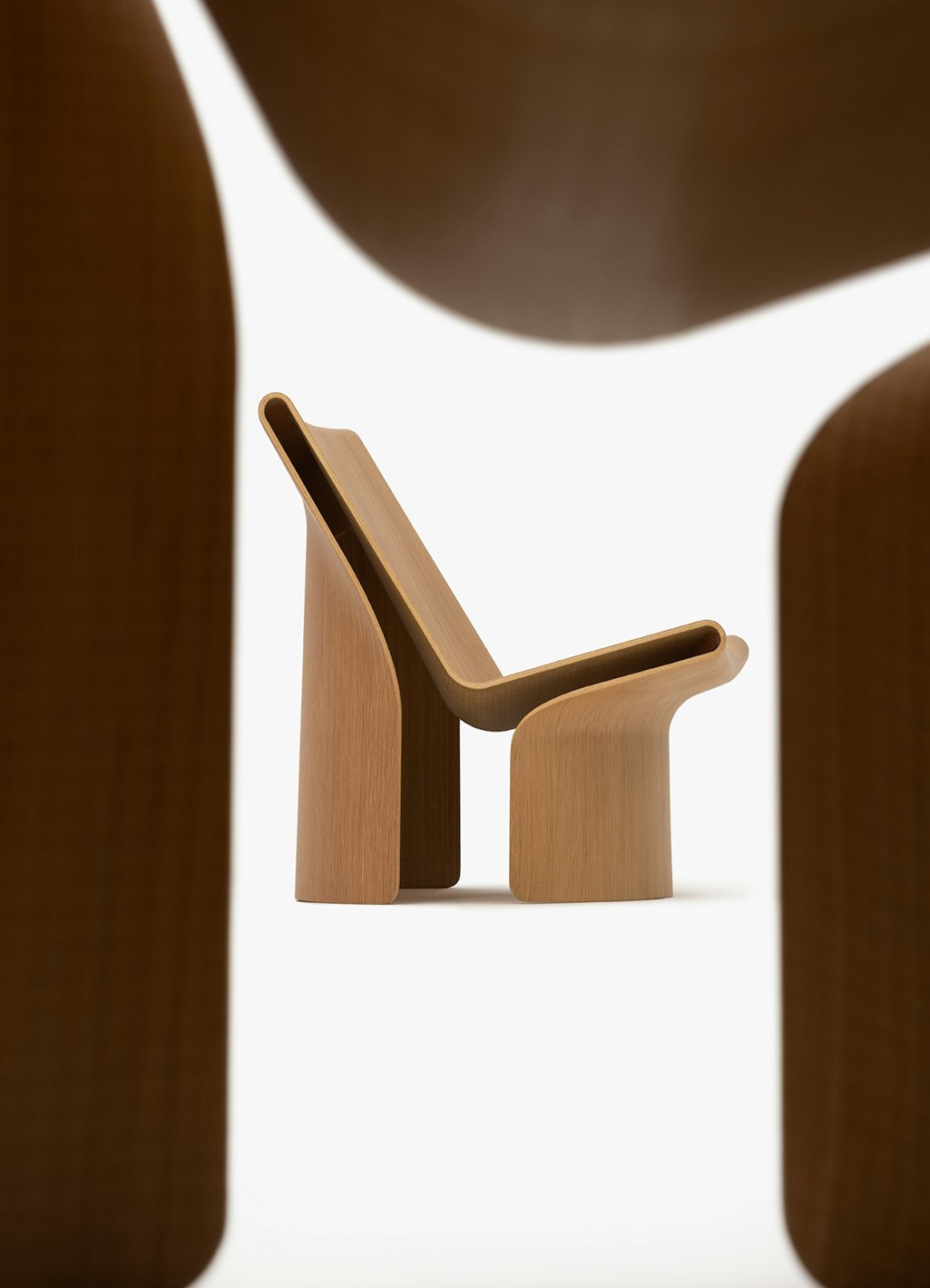 Nathan Martell's collaboration with Established & Sons explores the evolving possibilities of 3D veneer formin, a technique that allows complex sculptural silhouettes to emerge from layered wood construction. What appears as a single, sinuous form is in fact a multi-part moulded veneer assembly, seamlessly joined. British design pushing the boundaries of what wood can become.