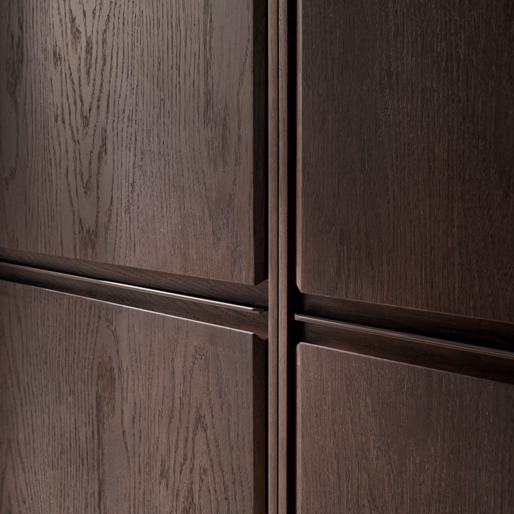 V2 offers façades in light or dark oak veneer, reeded glass or aluminium, all with integrated handles and push-click opening for clean, handle-free surfaces.