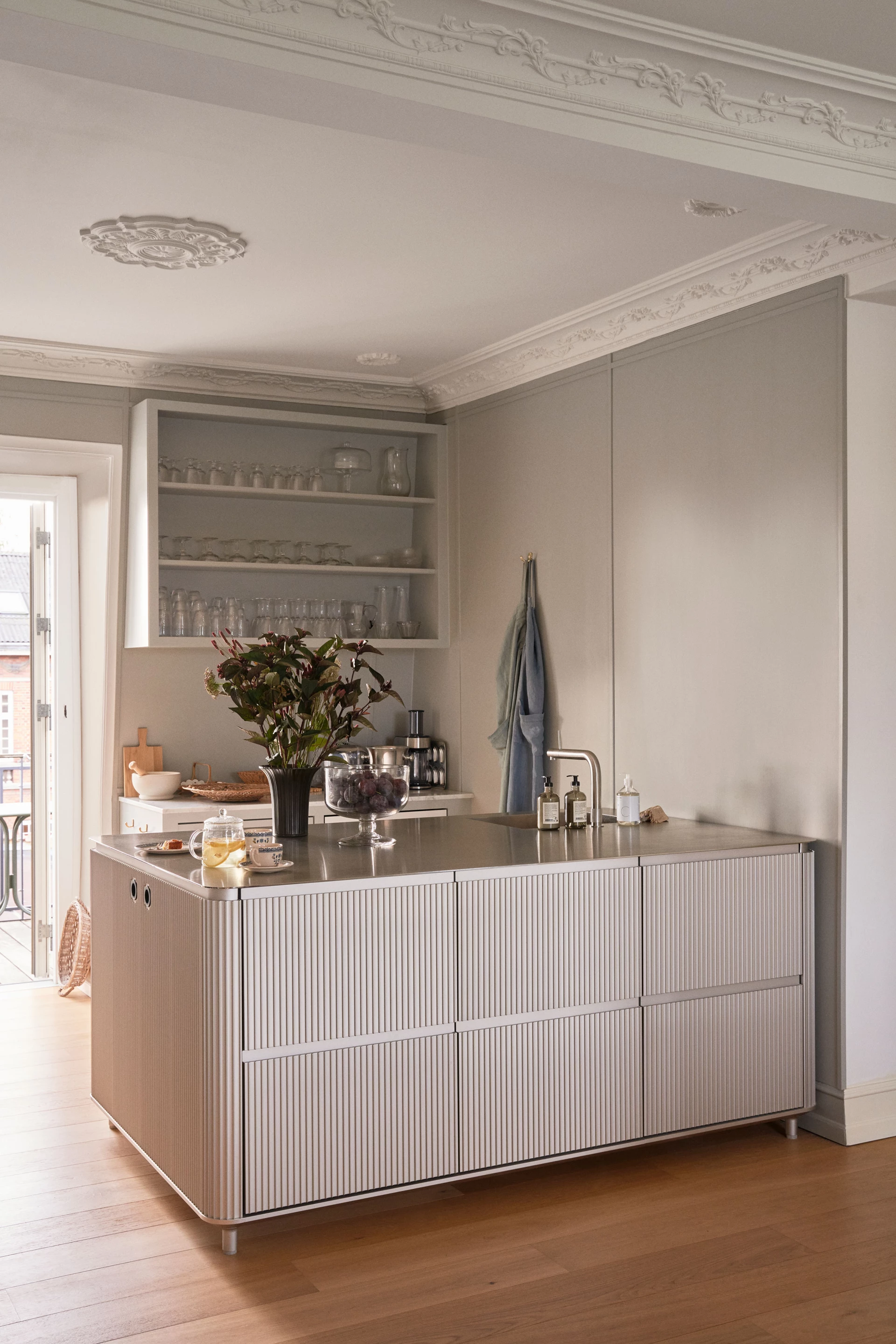 V3 transforms the modular kitchen concept with freestanding modules wrapped in naturally anodized aluminium — delivering a sleek, light metallic aesthetic while keeping full flexibility for islands, wall or tall units.