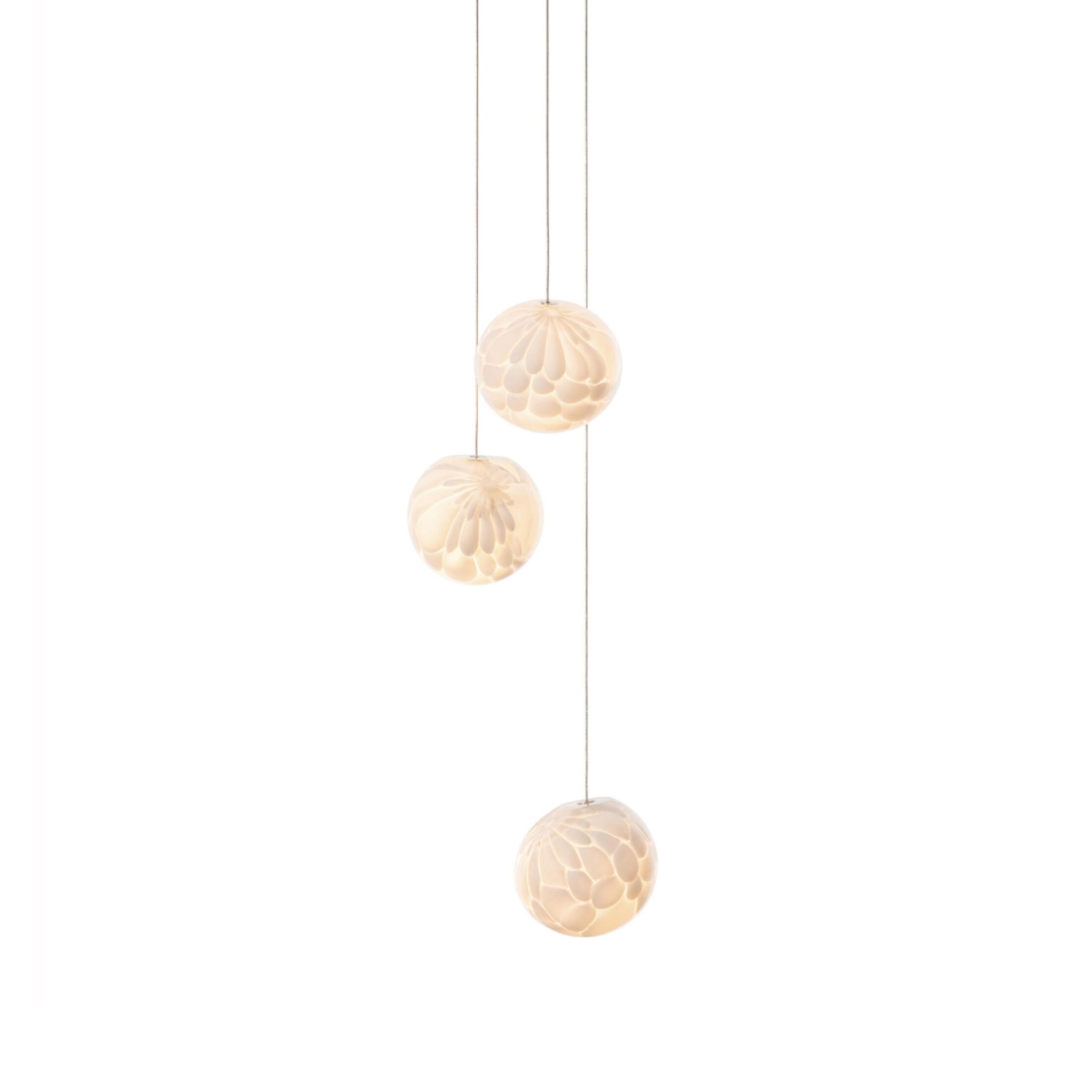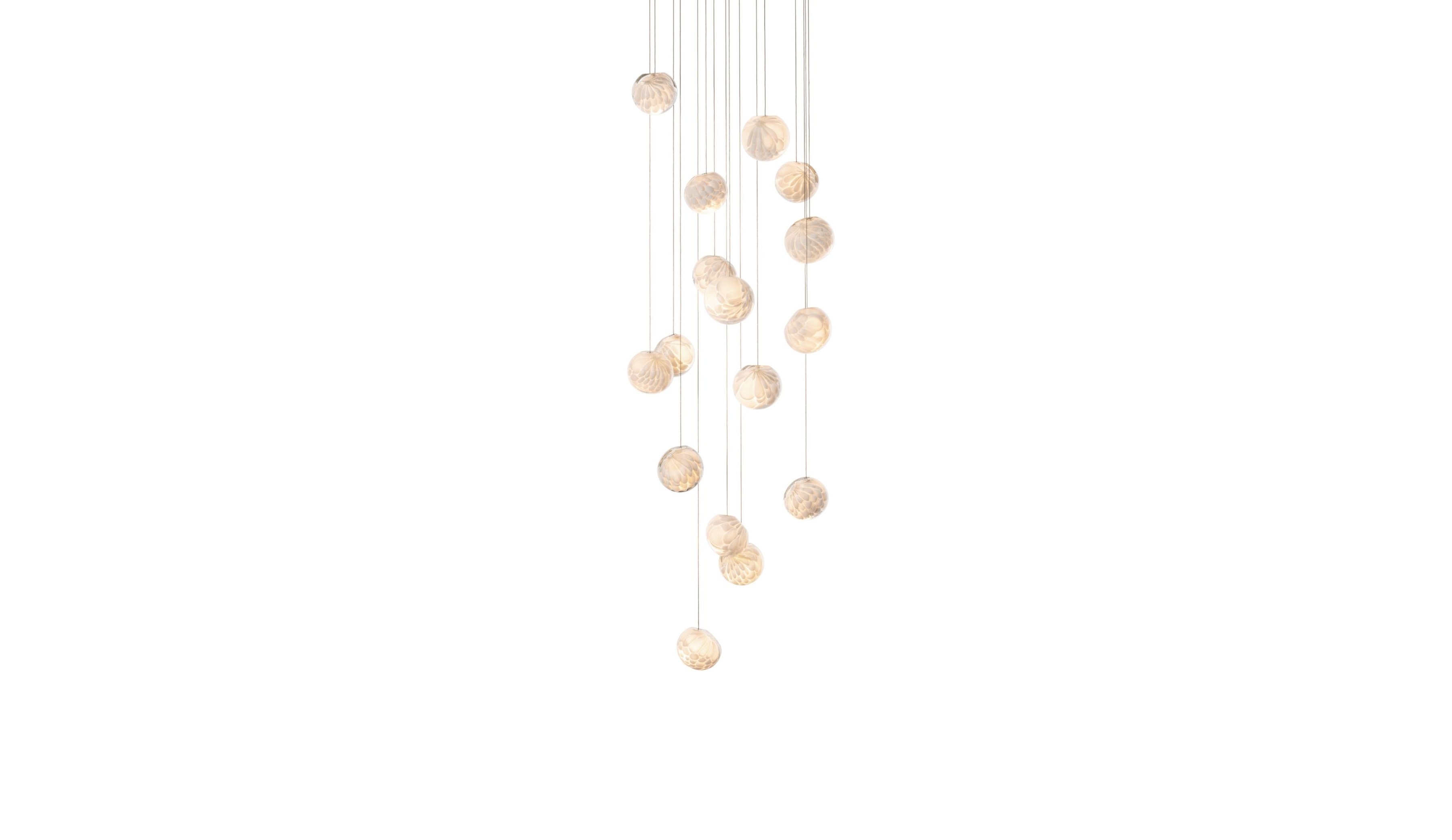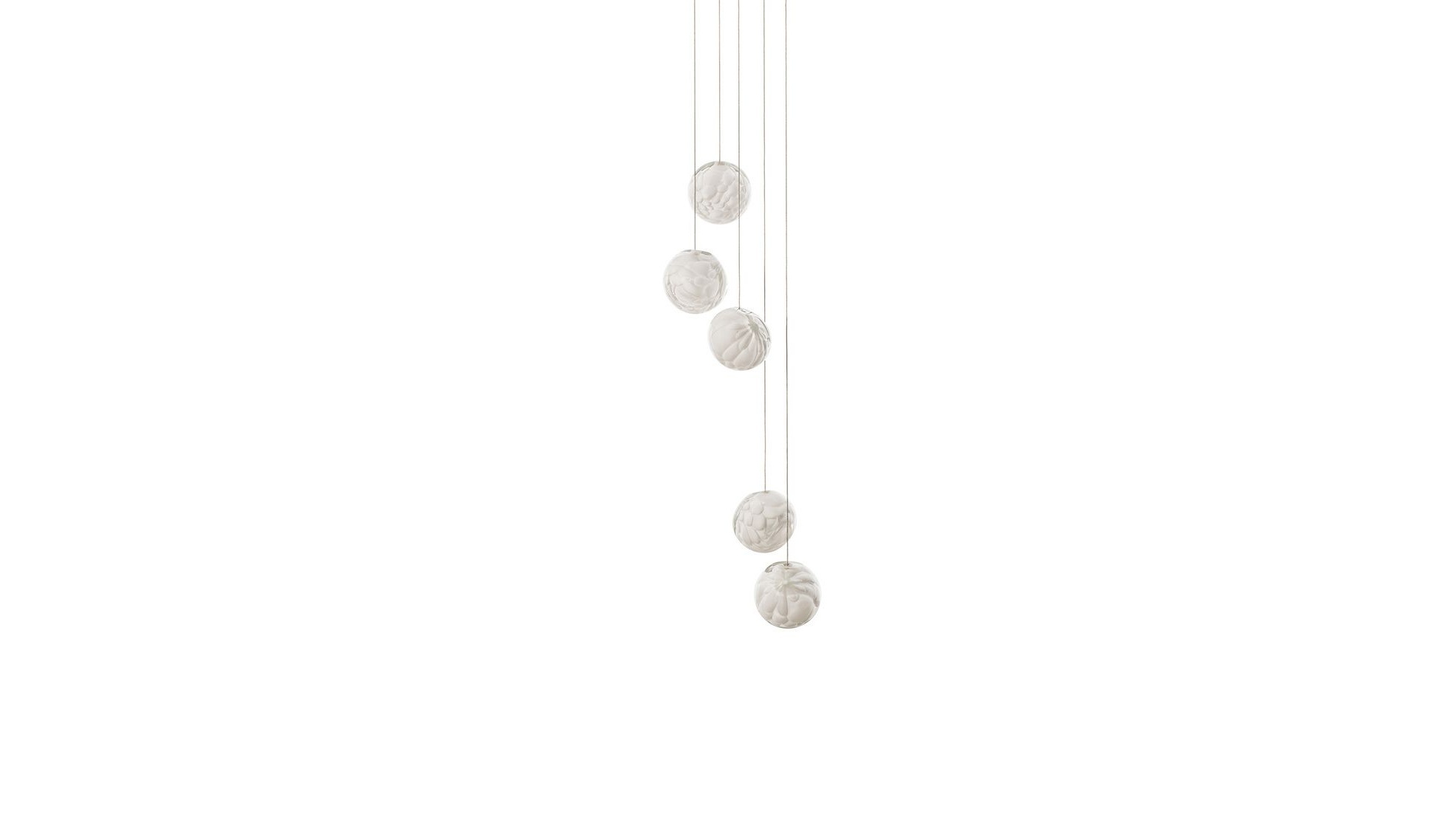 The random arrangement uses coaxial cables to suspend the pendants in ambient groupings.