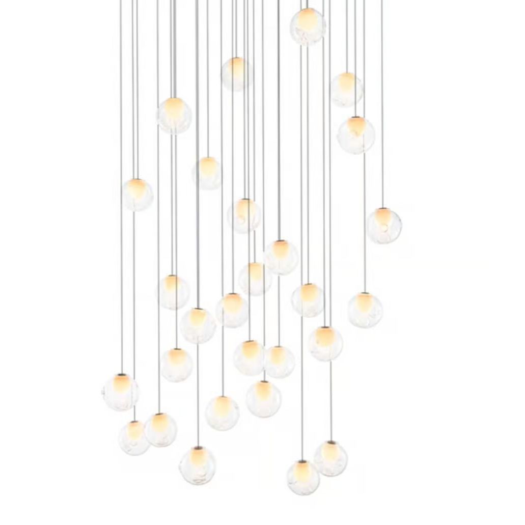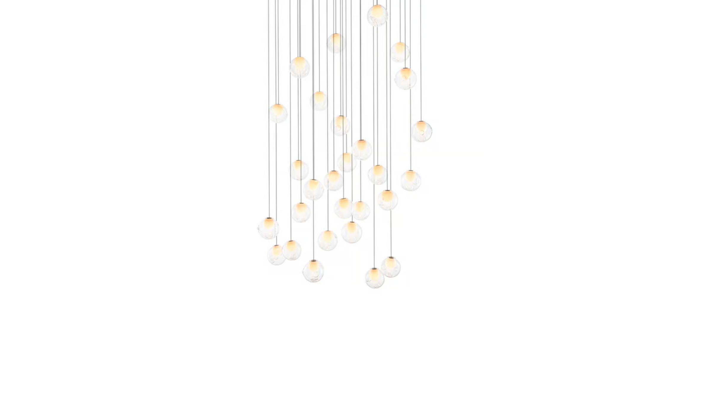 The random arrangement uses coaxial cables to suspend the pendants in ambient groupings.