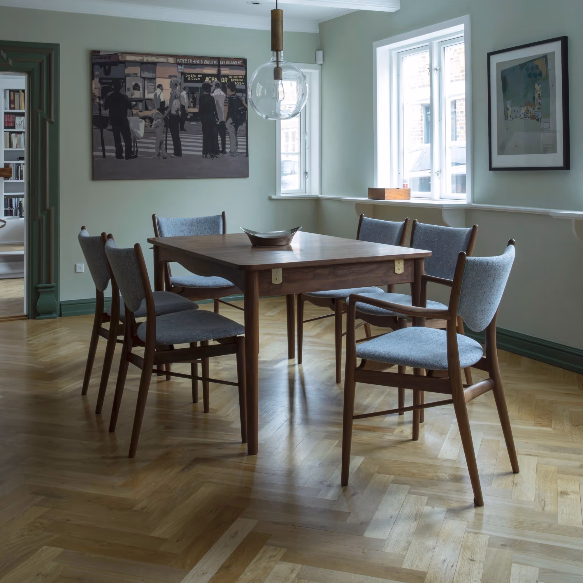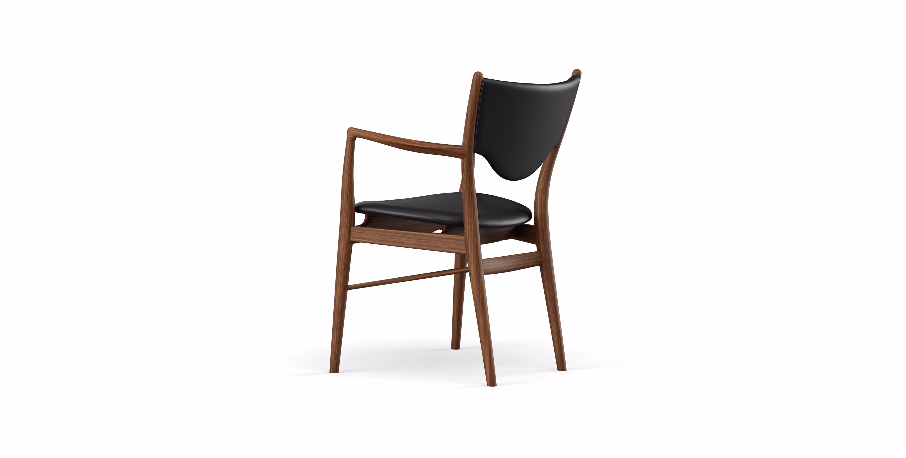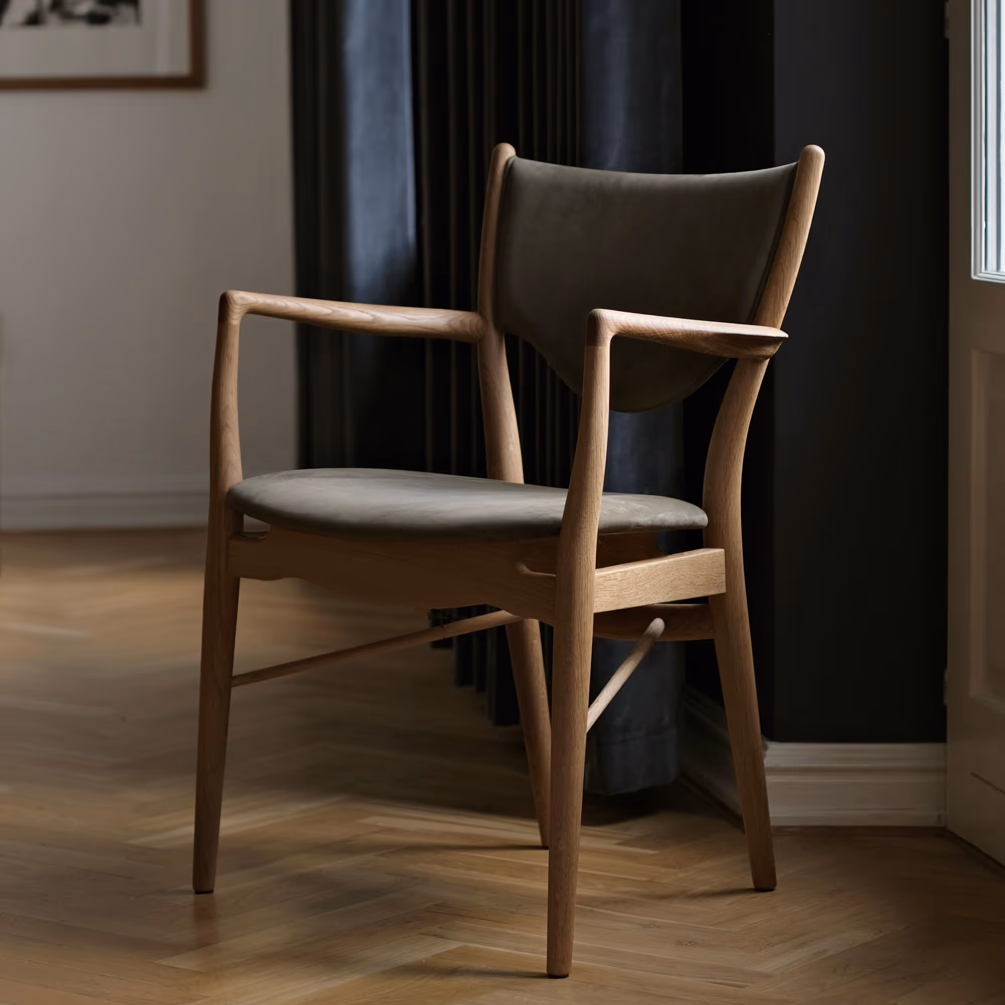 The 46 Armchair consists of a solid wooden frame in oak or walnut, combined with a seat and backrest upholstered in textile or leather.