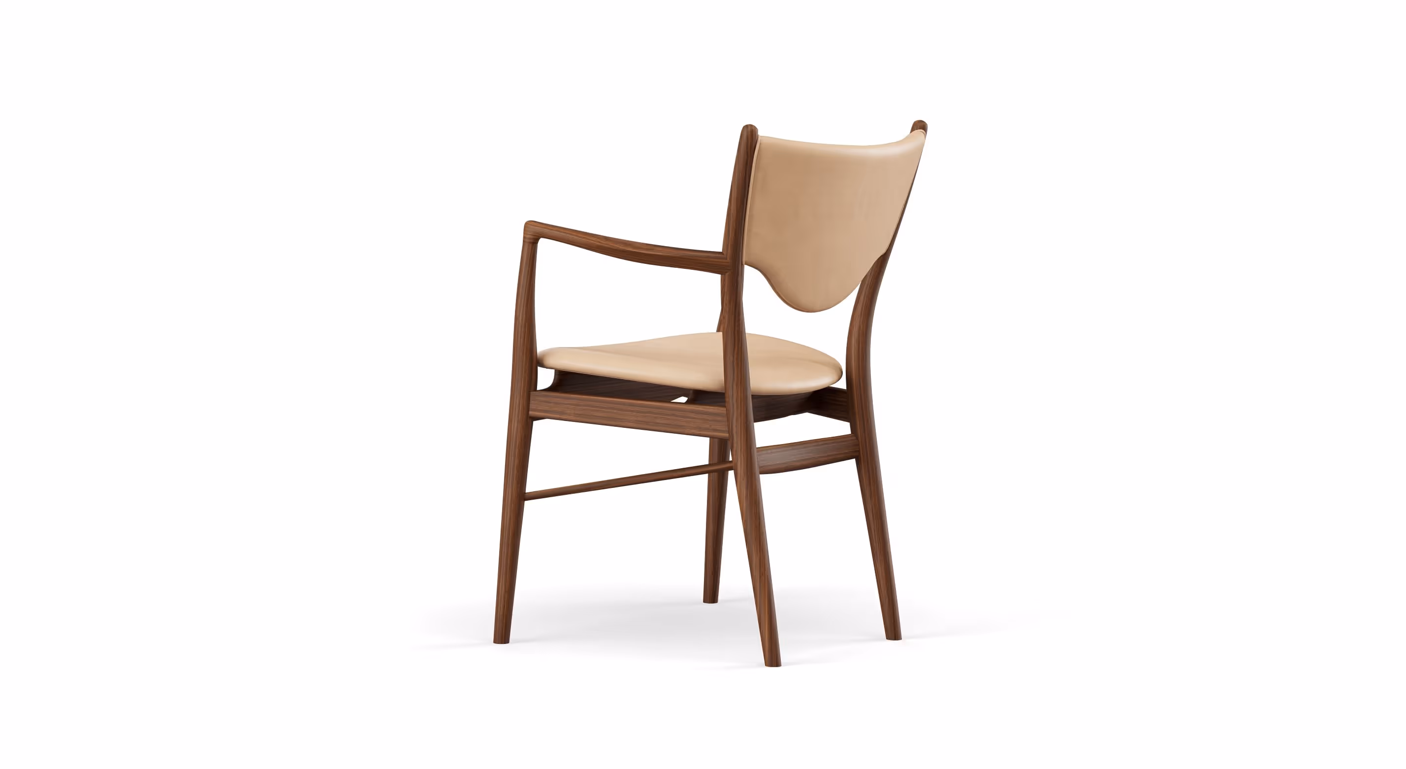 The lightness of the 46 Armchair is emphasized by the distinct separation between the supporting and supported elements. Originally designed in 1946 for the Copenhagen Cabinetmakers’ Guild Exhibition for master cabinetmaker Niels Vodder, the chair was refined by Finn Juhl between 1947 and 1949 into a simpler, more streamlined version for the furniture manufacturer Bovirke. This refined version is the one in our collection today.