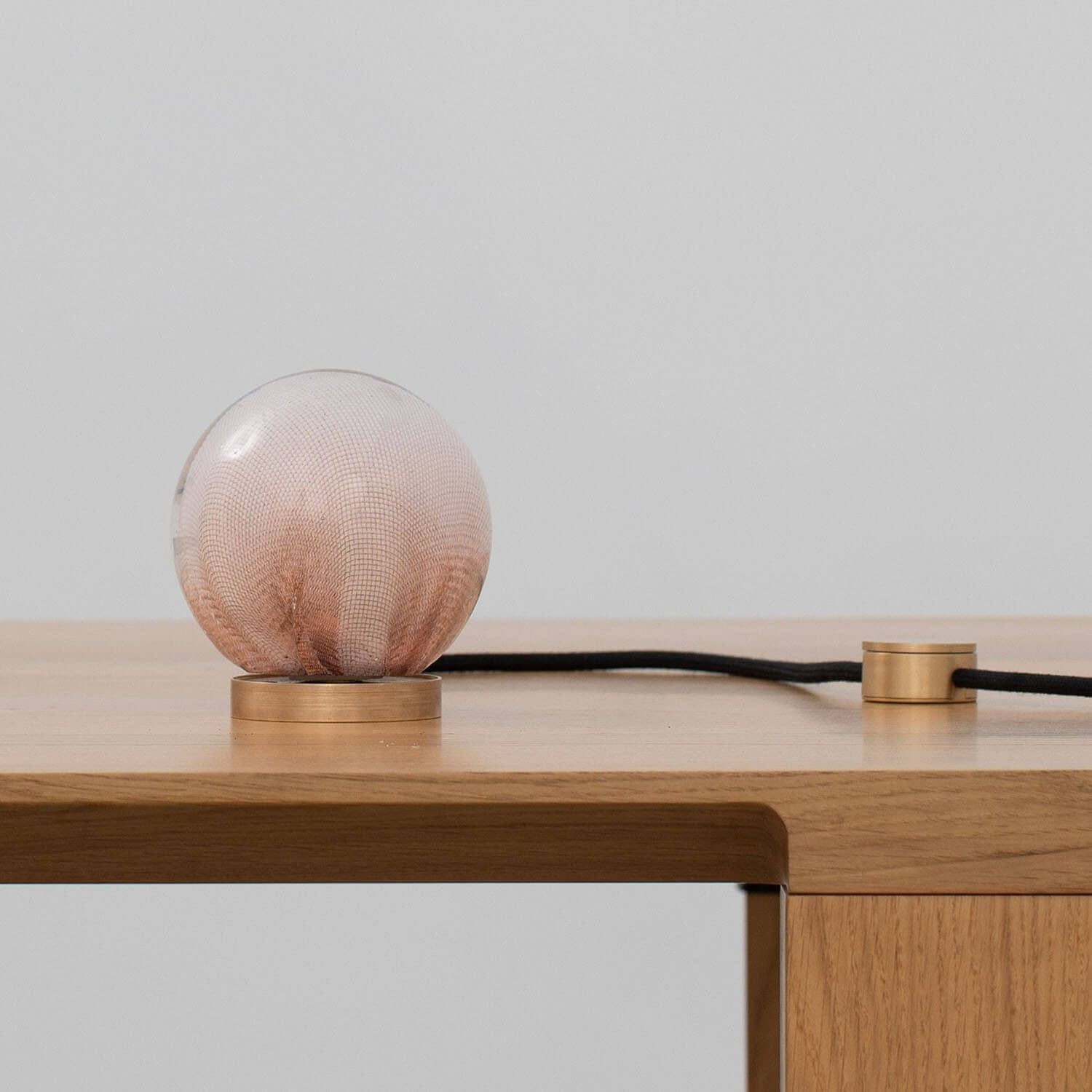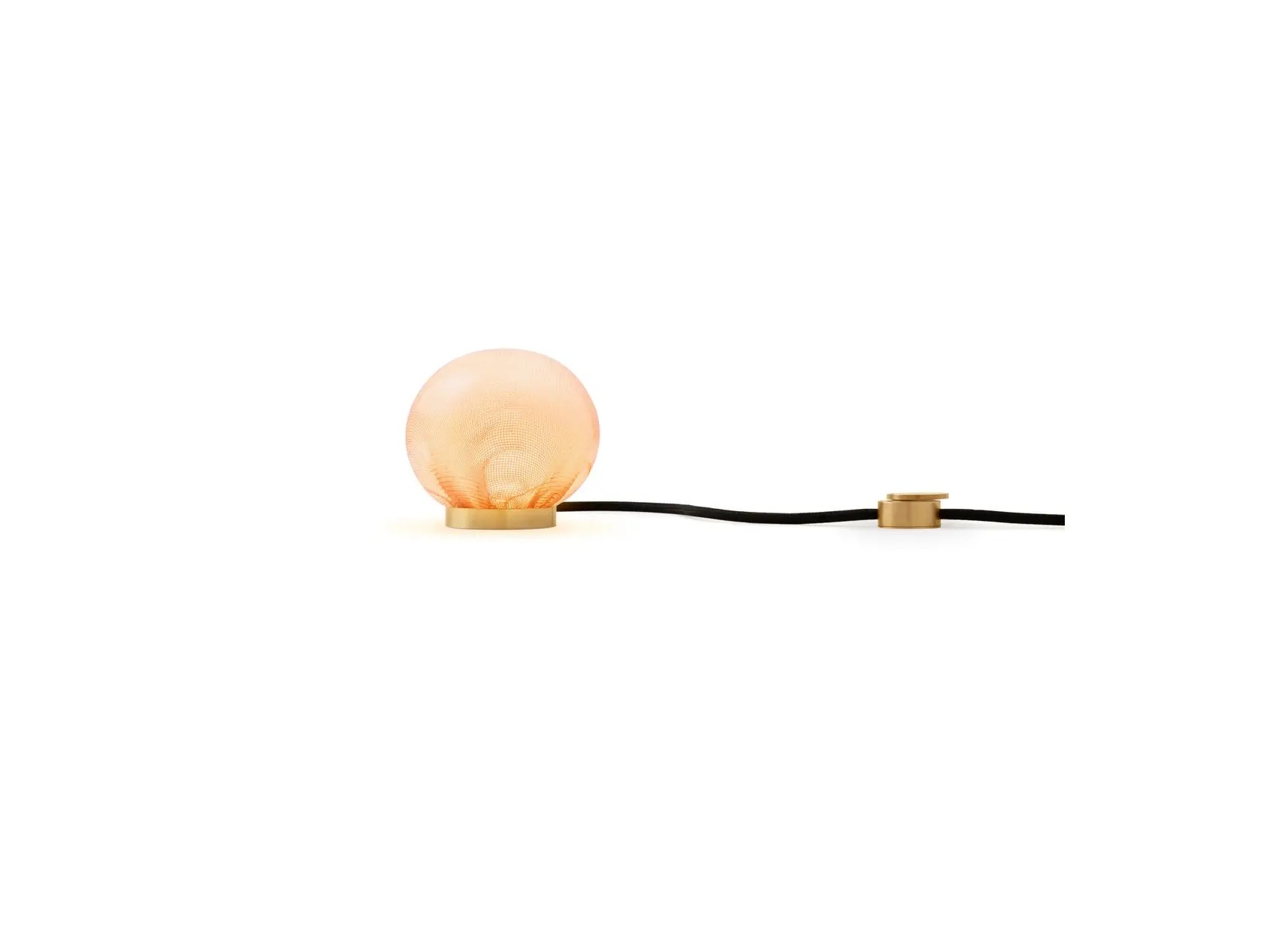 84 series pendants can pair with the table light hardware, which includes an integral dimming system housed within a sleek brass cylinder. The black fabric cord is semi-rigid and may be sculpted to add form. The brass stand has a small notch on the underside, allowing it to be hung on a wall.