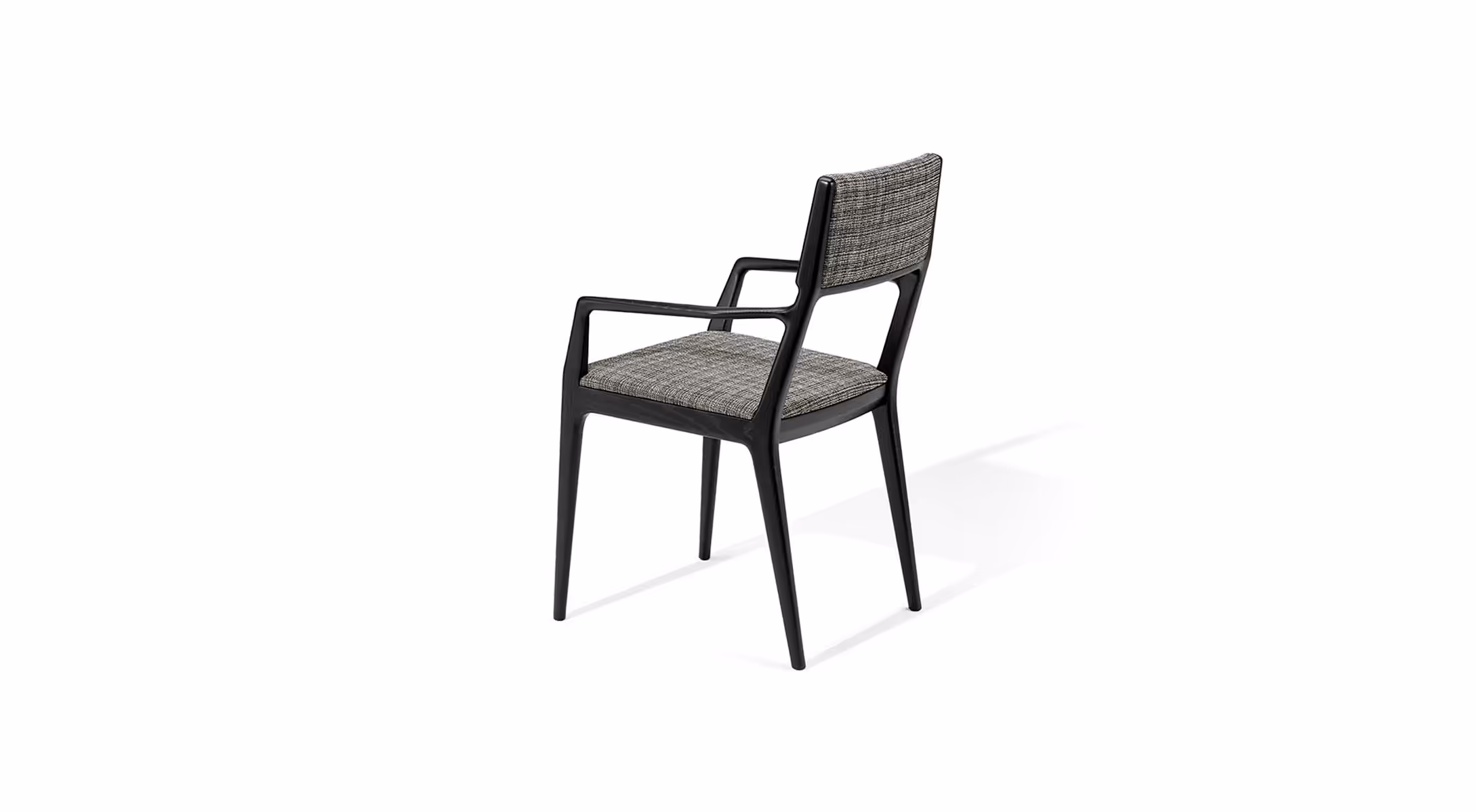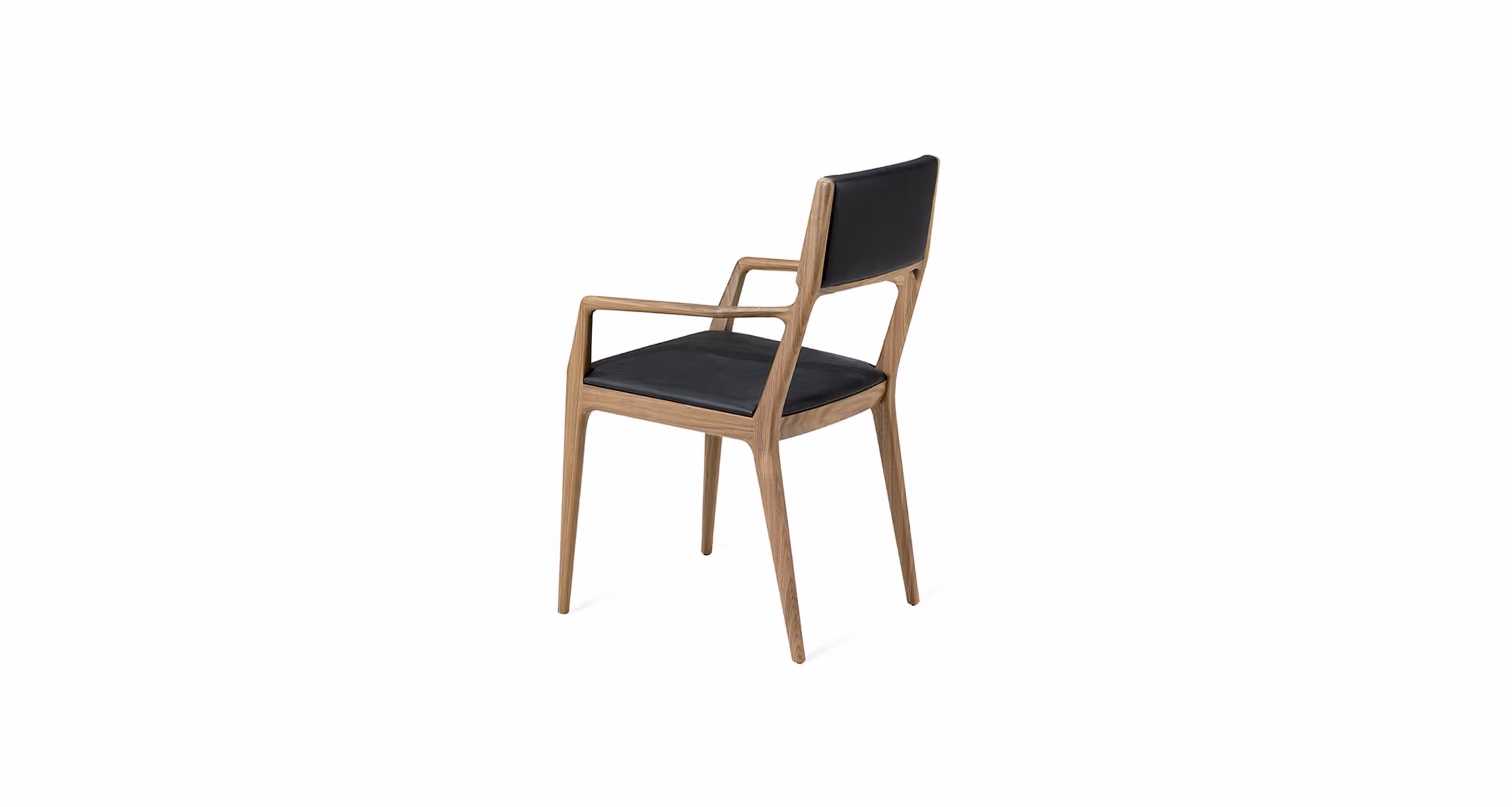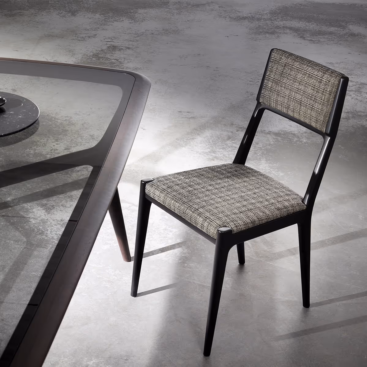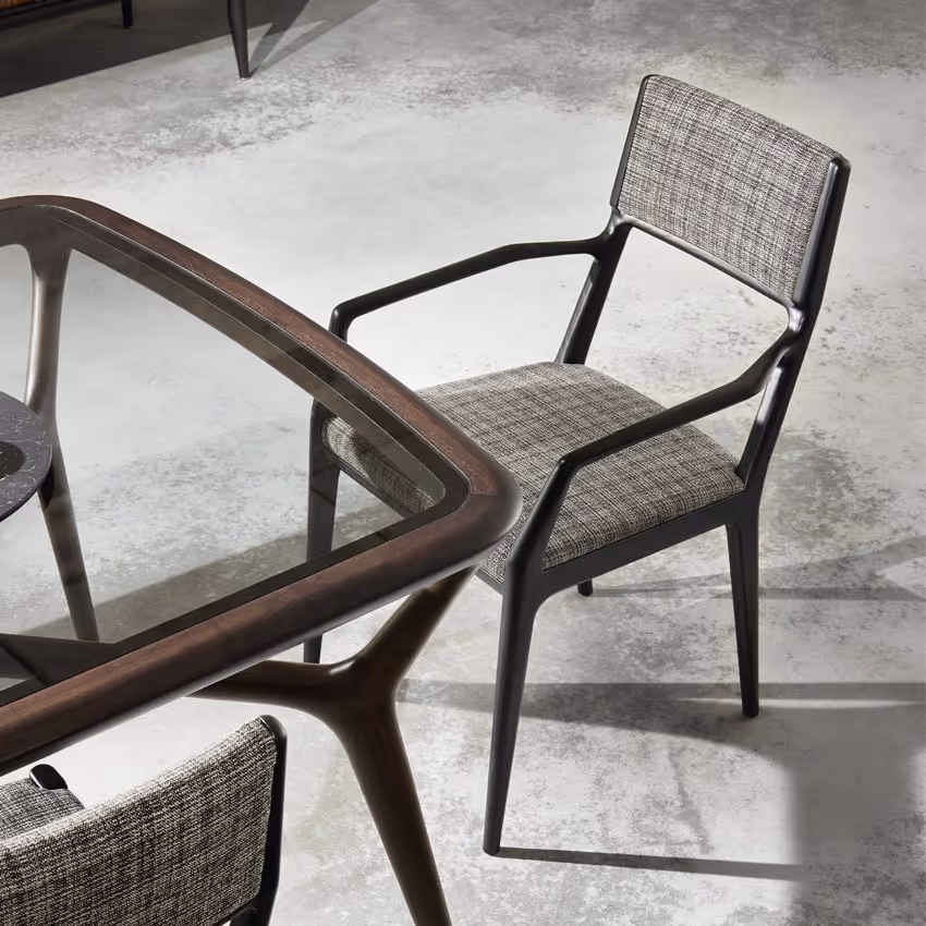 Available in two versions: with or without armrests. In the former one, the armrests are wider at the front than at the back, like an elegant embrace. A multitude of wood finishes and upholstery options - fabric, leather or natural leather - allow for endless expressions of style, making it easy to pair with the table designs from the catalog.
