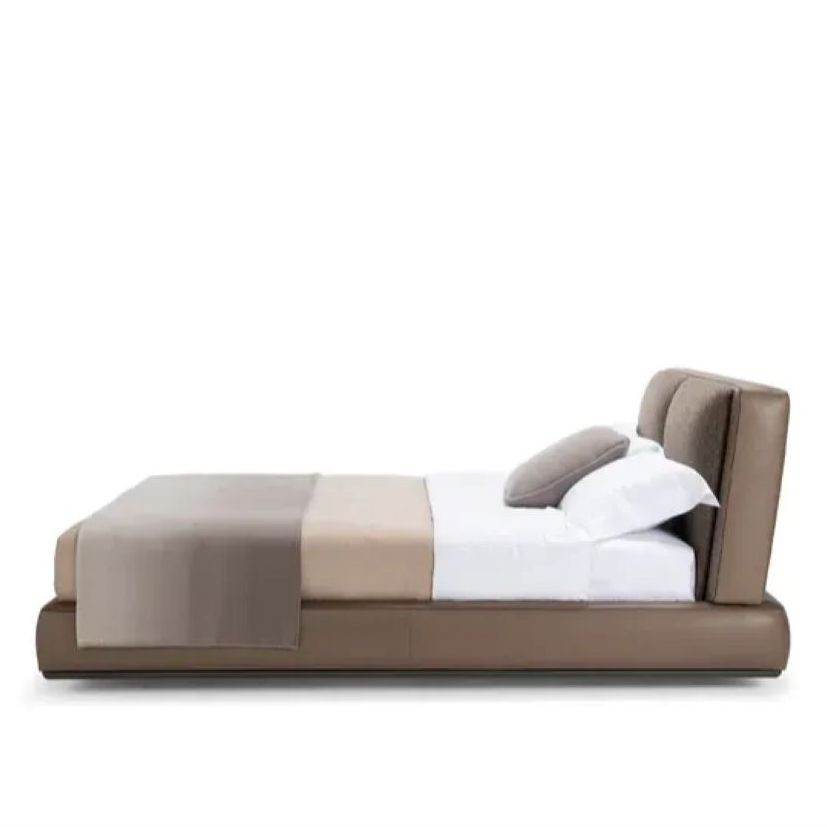 Designed as an isolated element, totally autonomous and self-sufficient, able to fit in with all kinds of bedroom furniture, Aldgate presents carefully designed details and soft, delicate and snug lines. Its heart is a container with rounded edges, unholstered in textiles or in leather and with sartorial finishes, embellished by a surrounding pewter frame that incorporates the bed, which can be positioned at different heights, and the rectangular backrest that recalls a monumental access road to the city. That too is rounded and it features two comfy cushions to lean back on.