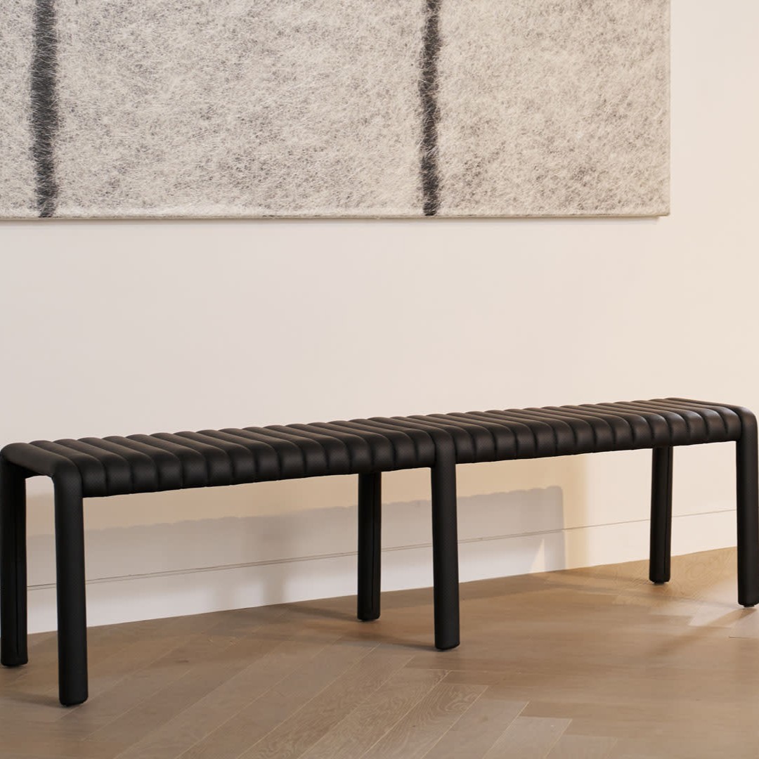 The perforated leather, lines, and ribs are evocative of the iconic leather seats of sports cars from the 20th century that the designer grew up with on Alexander Street in Montreal. This bench balances nostalgia with modernity.