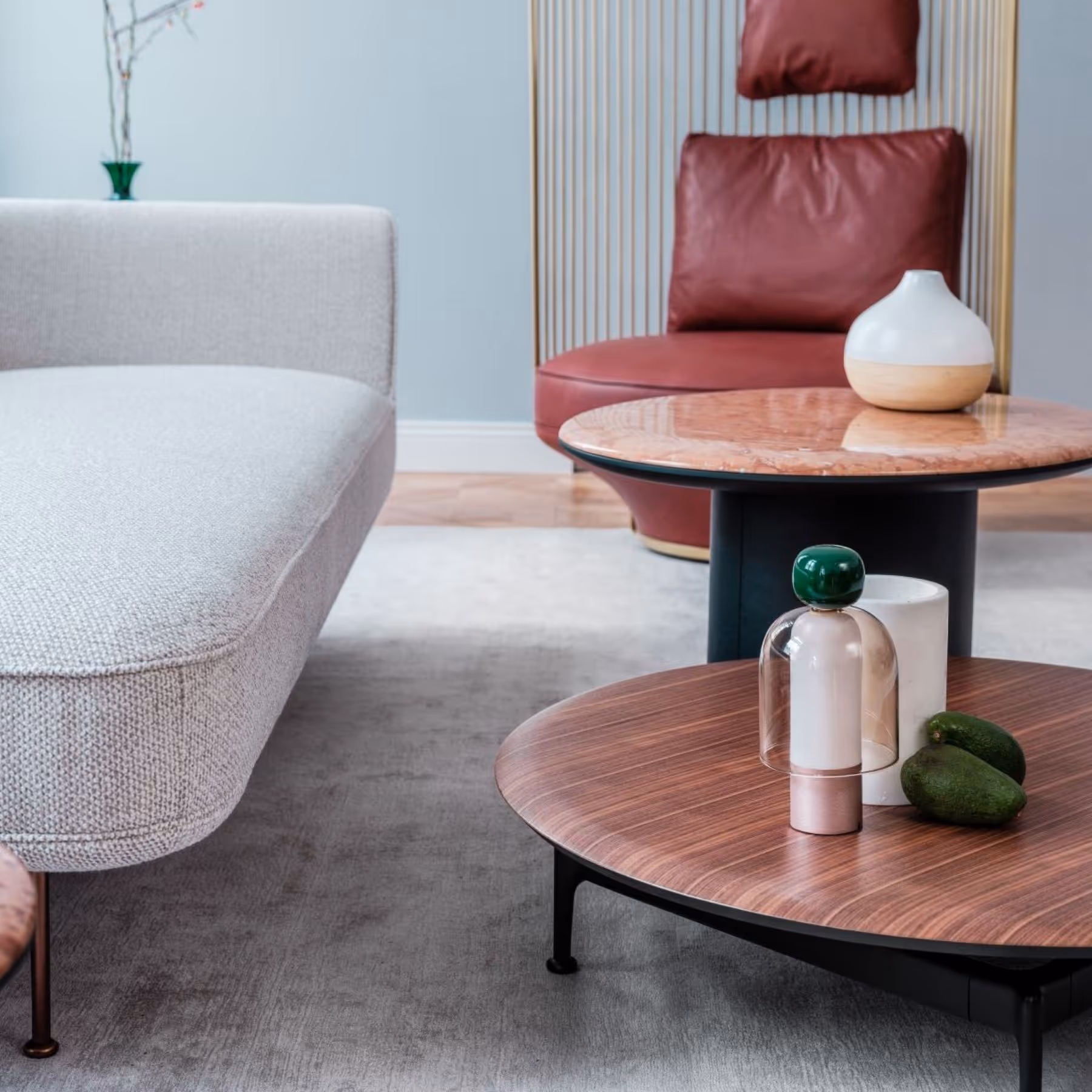 There are matching Andes tables to go with the Andes sofa collection. The bases are available in the same finishes as the sofas. The tabletops are available in either circular form or square with rounded corners, and come in a range of materials.