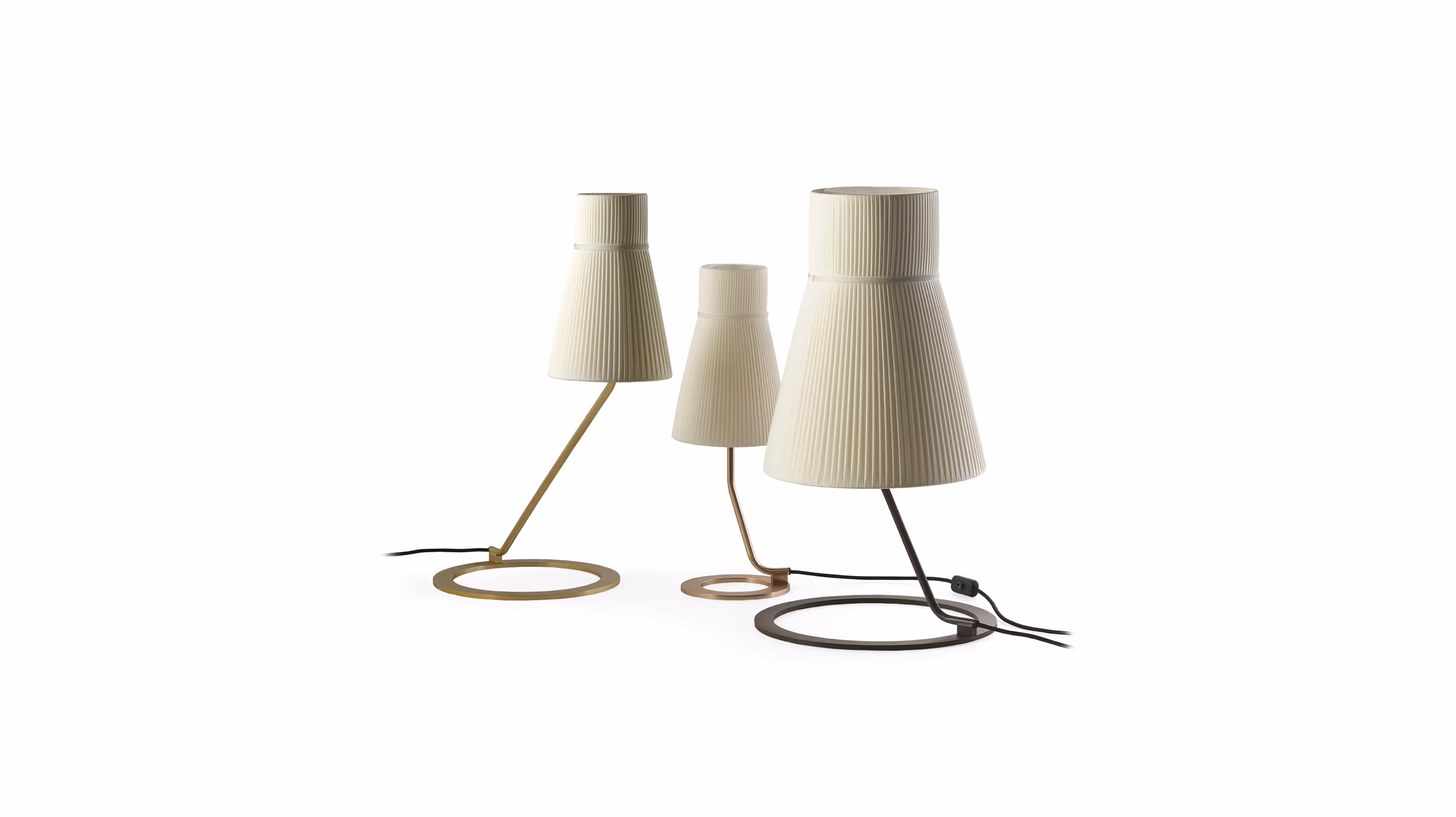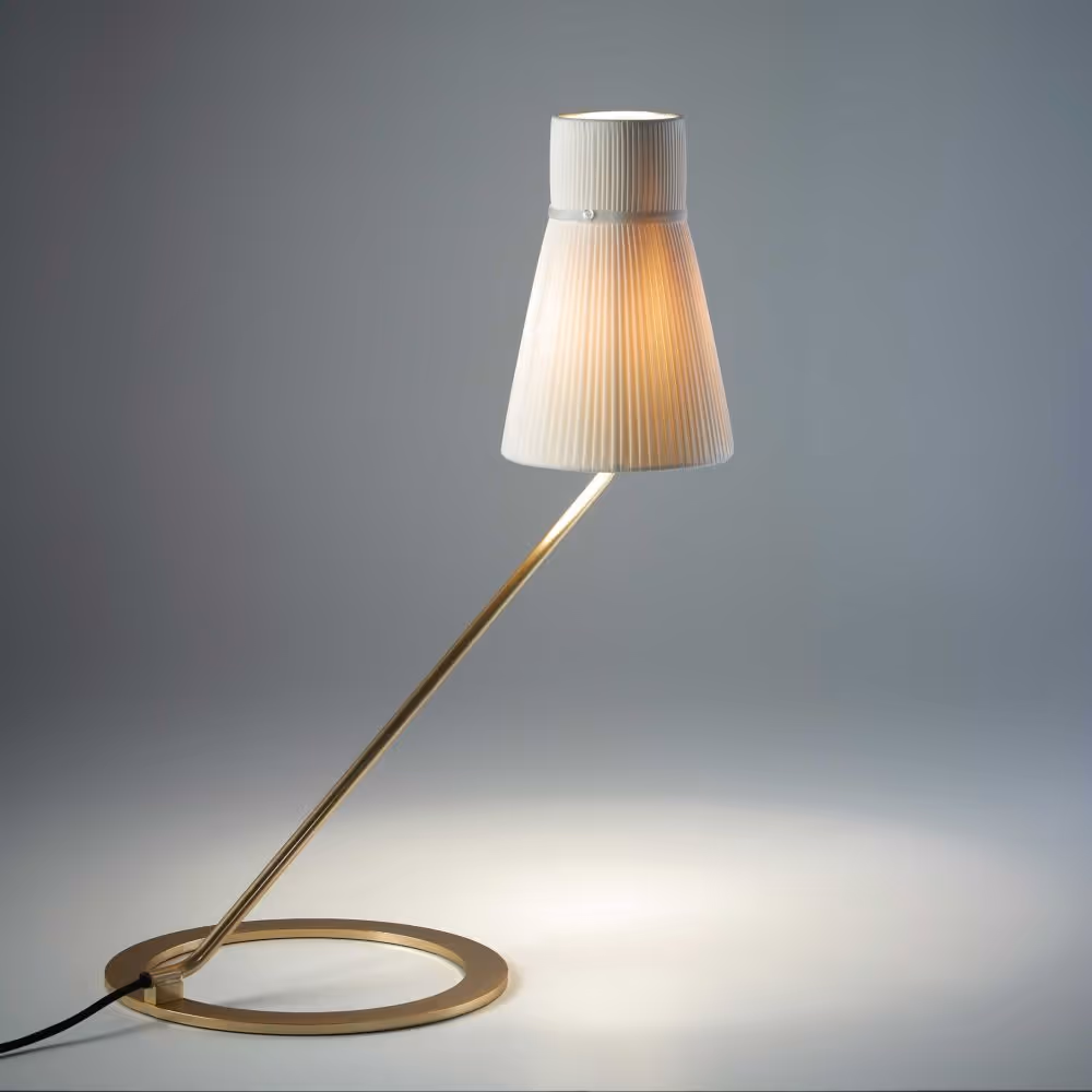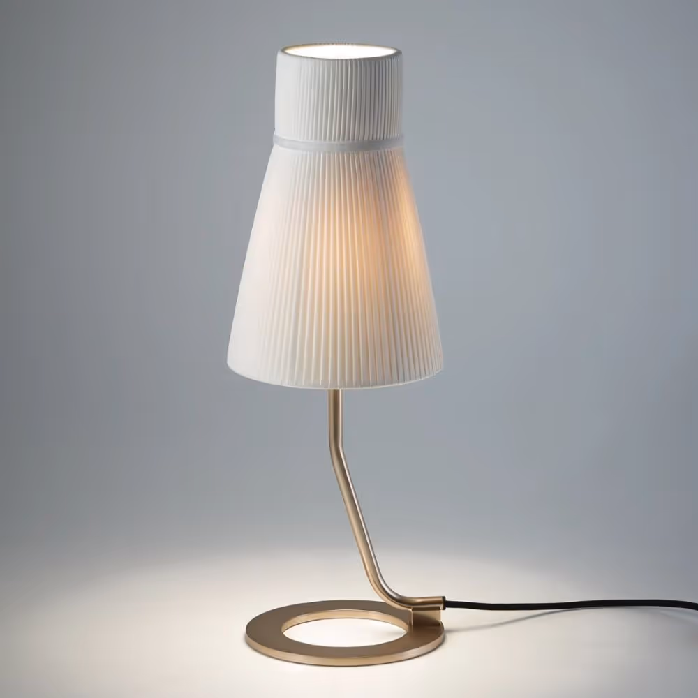 Audrey is a collection comprising bedside lamps, desk lamps, table lamps and floor standing fixtures. Their simple linear structure consists of a metal shaft resting on which is a lampshade in pleated fabric and white frosted glass whose original shape recalls that of a hat used by British actress Audrey Hepburn.