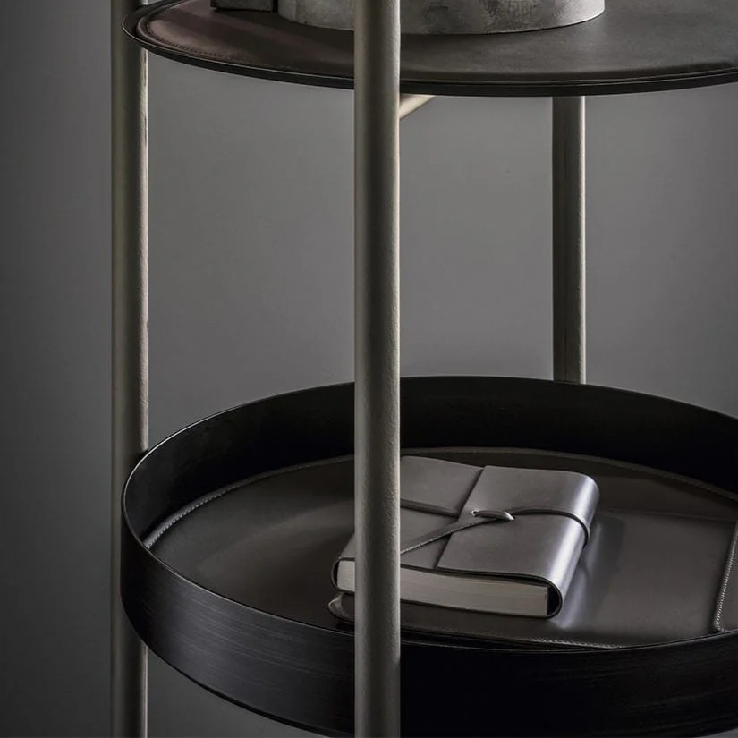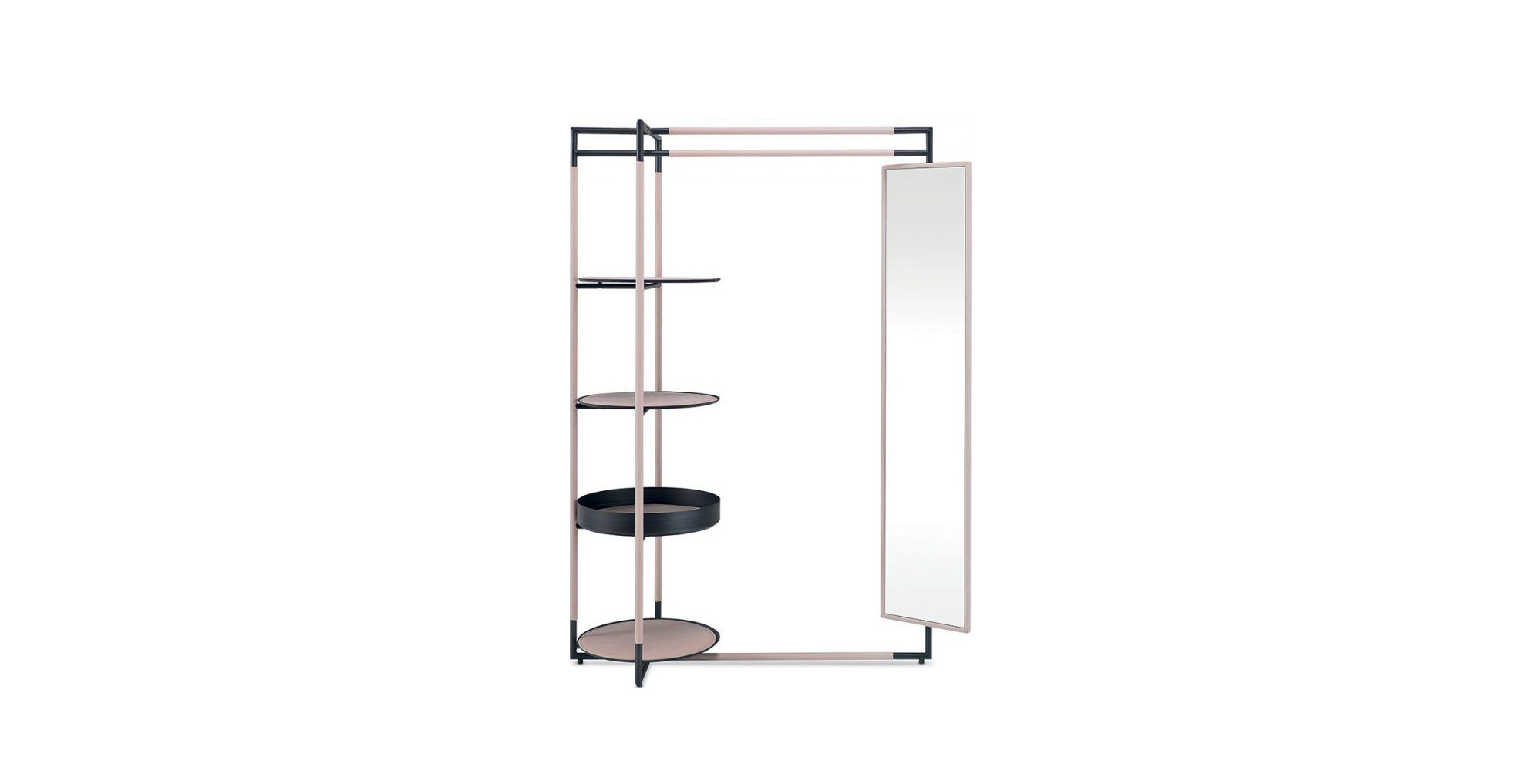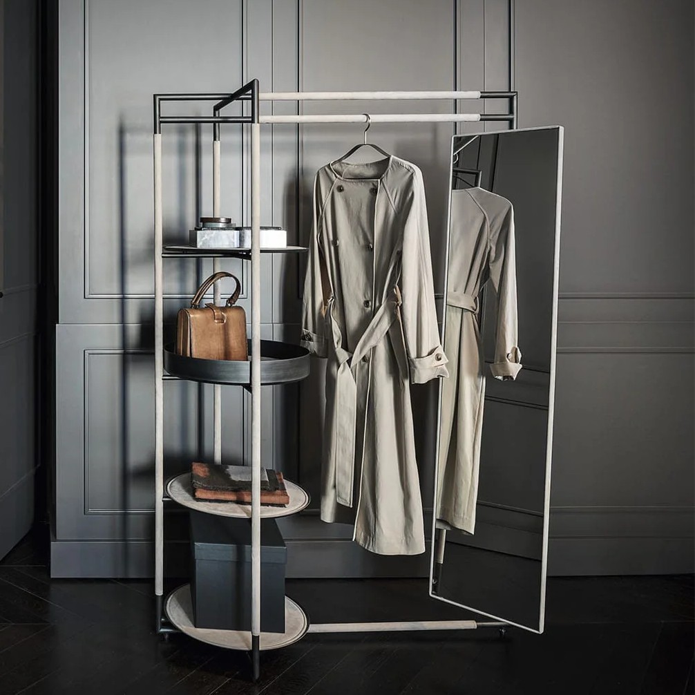 The Bak Valet Stand Mirror maintains the design of the Bak collection, with the addition of a mirror in this version. This model has a lacquered brushed steel frame with leather inserts, and round steel shelves, lightly padded and partially covered in leather. The mirror is upholstered in leather around the frame and on the back