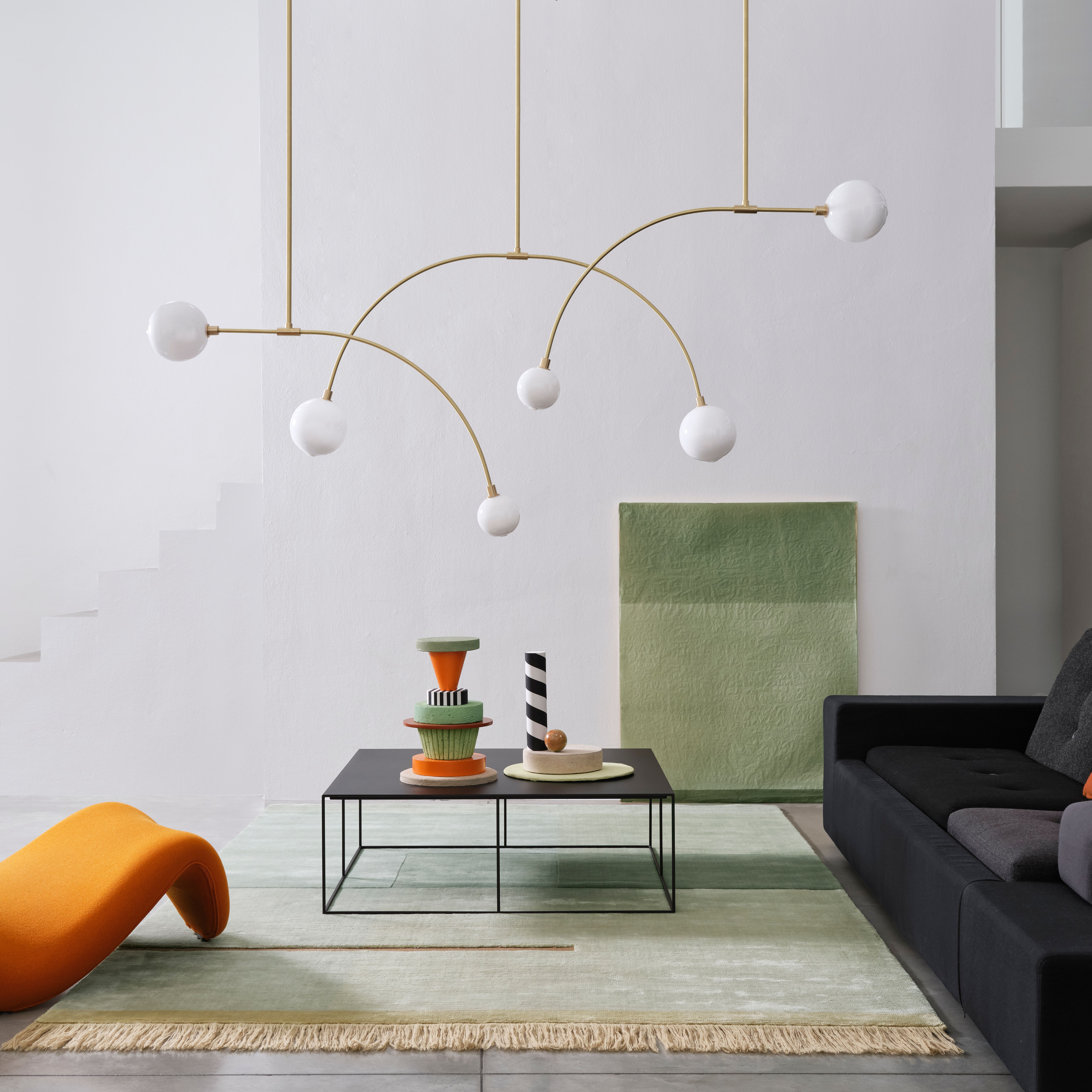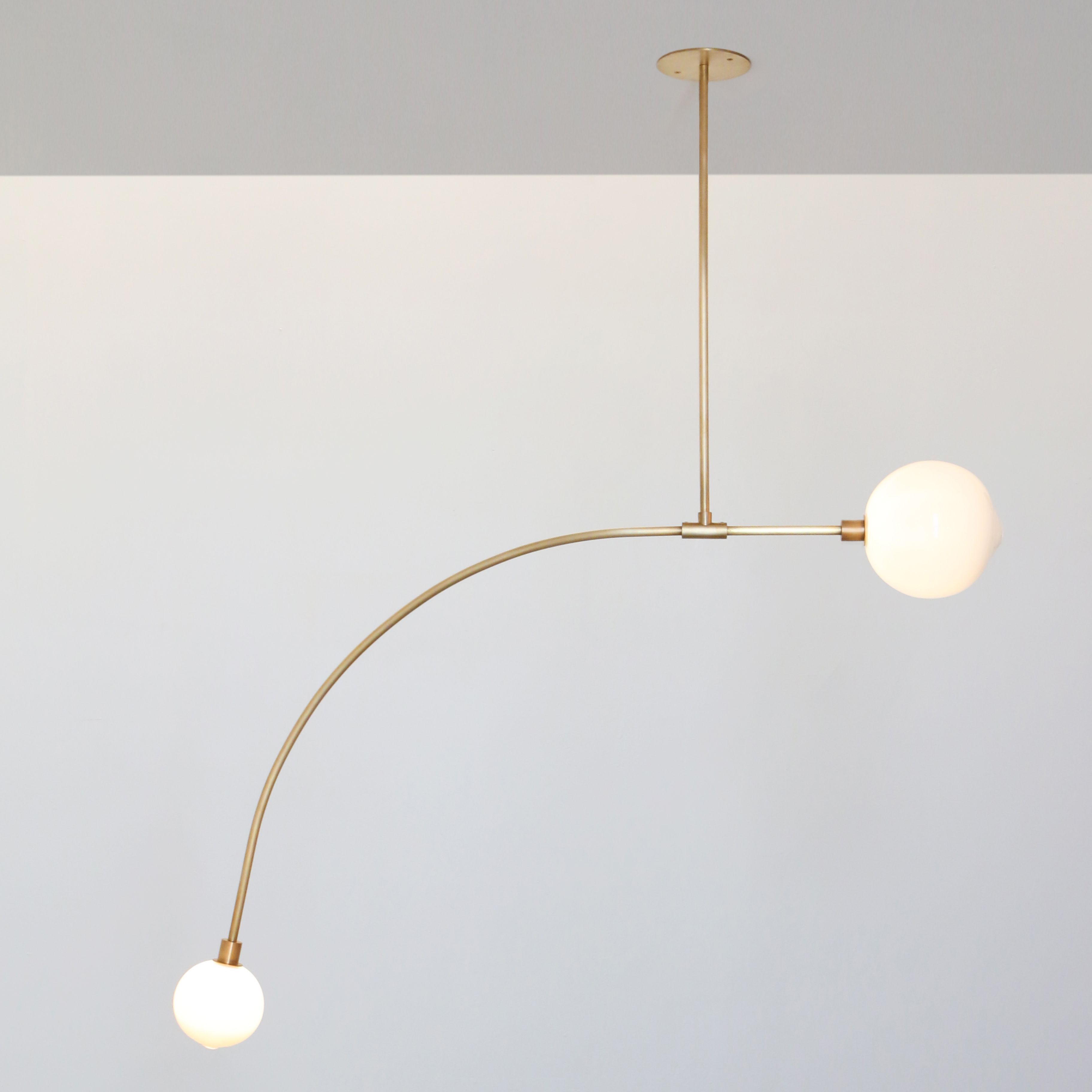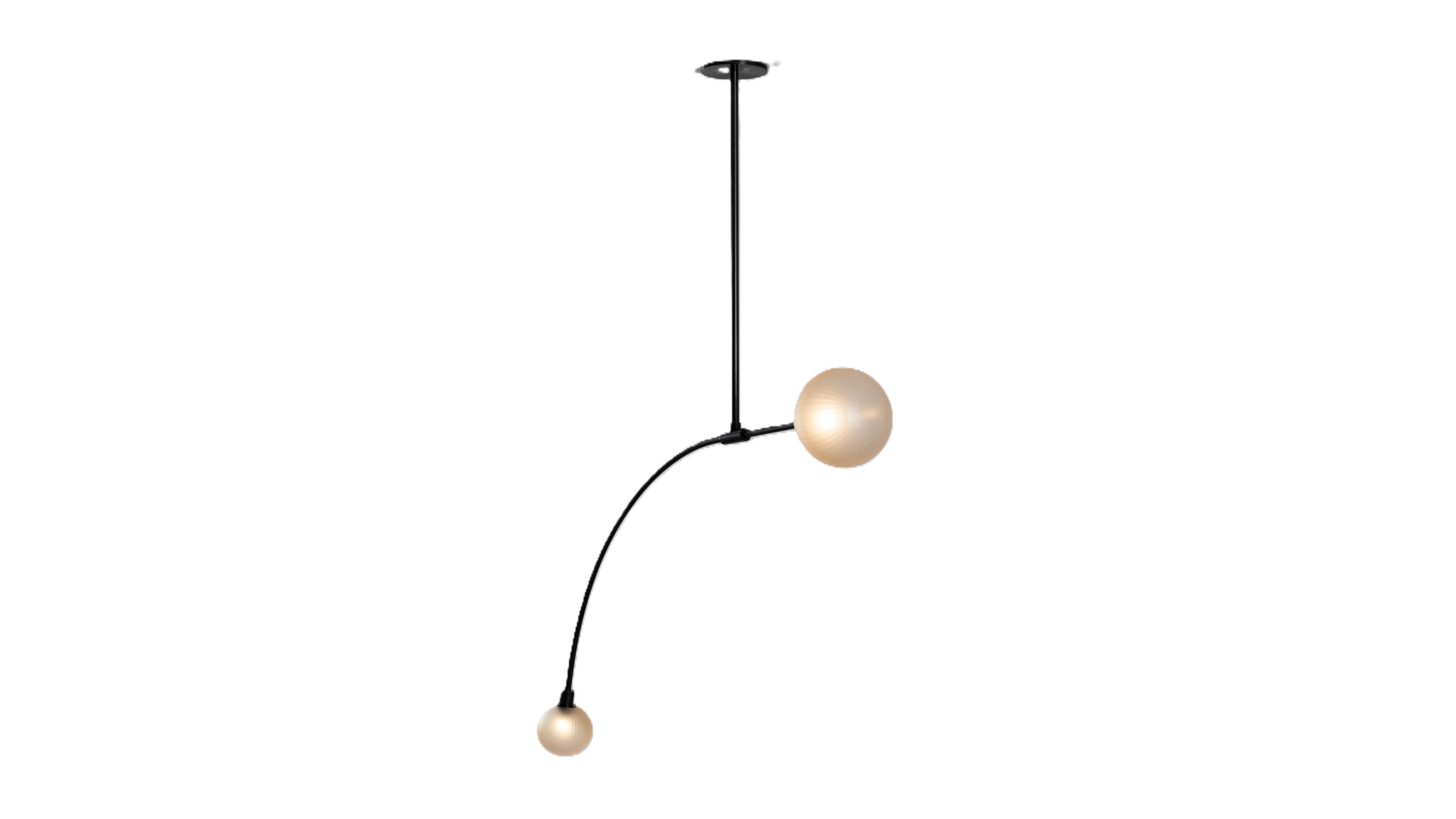 A minimal, sculptural suspended light composed of a larger, 180mm diffuser of handblown Czech glass on a short horizontal stem opposite a smaller, 110mm diffuser on a longer, downward arching stem. The glass diffusers are available in both “dipped” glass, featuring the SkLO double-dipped flame-polished mouth and “textured” glass, featuring a soft, frosted finish and subtle sculpted vertical ridges.