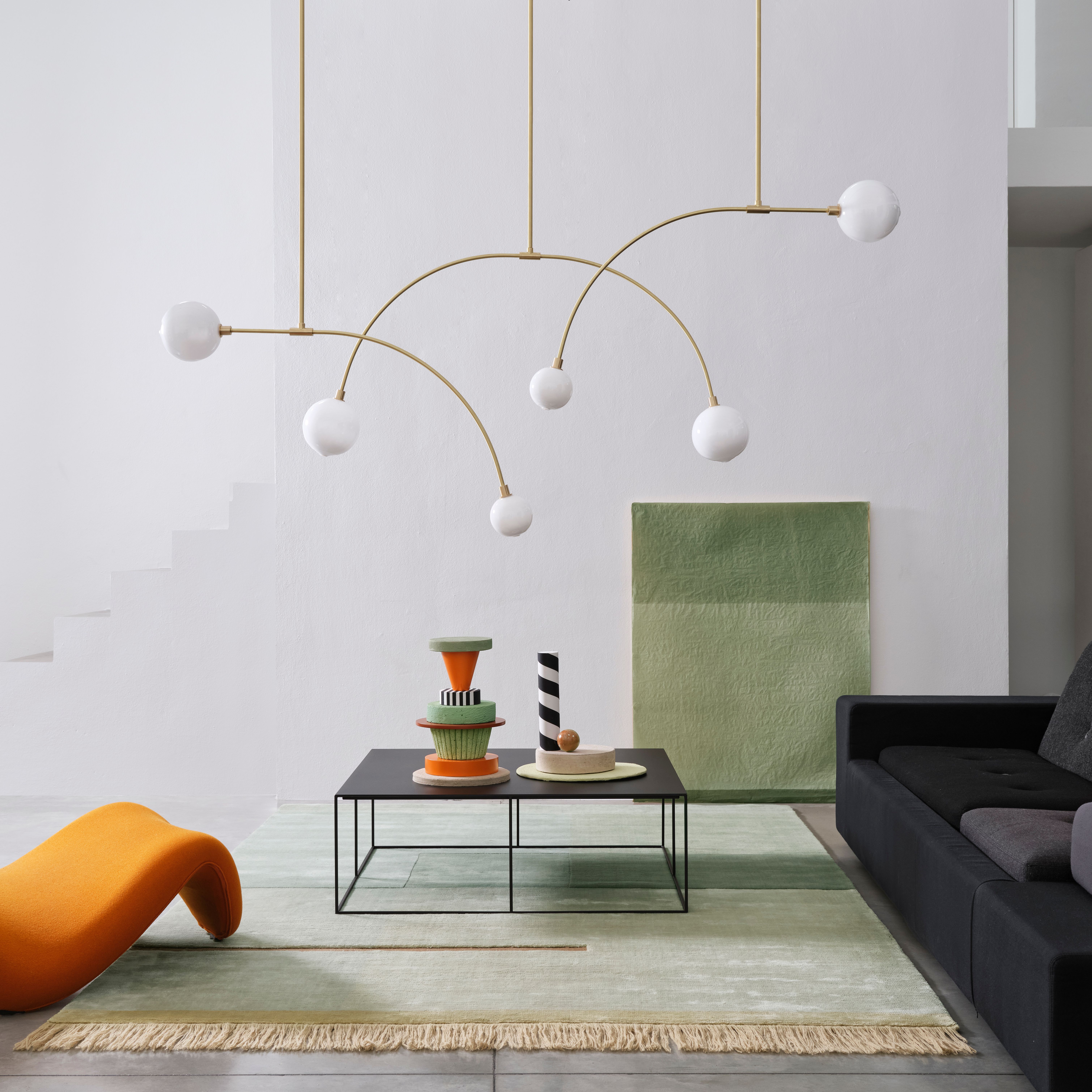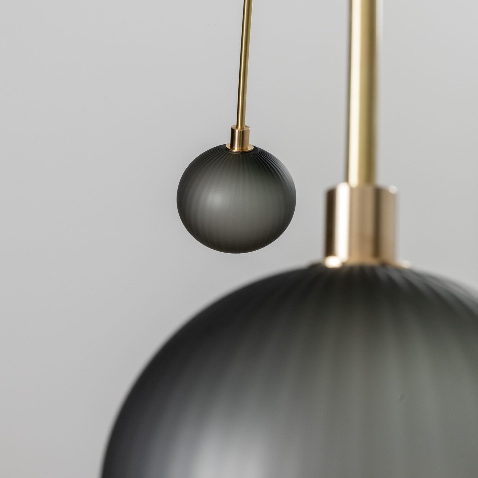 Symmetrical downward curving arms hold glass diffusers of handblown Czech glass. Suspended on a rigid brass tube stem. The glass diffusers are available in three shapes and in both “dipped” glass, featuring the SkLO double-dipped flame-polished mouth and “textured” glass, featuring a soft, frosted finish and subtle sculpted vertical ridges.