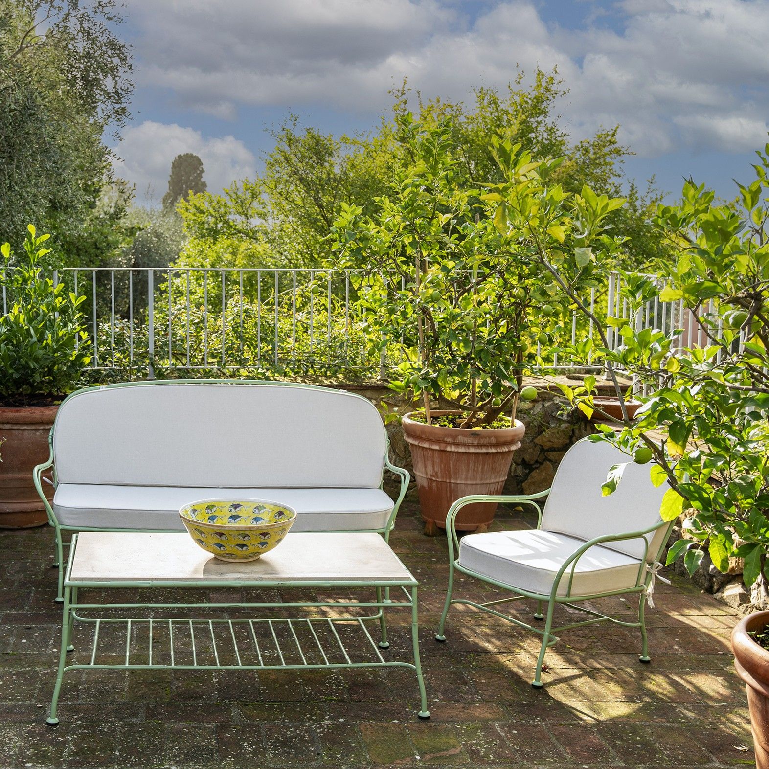 The steel is treated with zinc and varnished with powder to make it suitable for outdoor use, while the cushions for seat and back are upholstered with Sunbrella fabric.