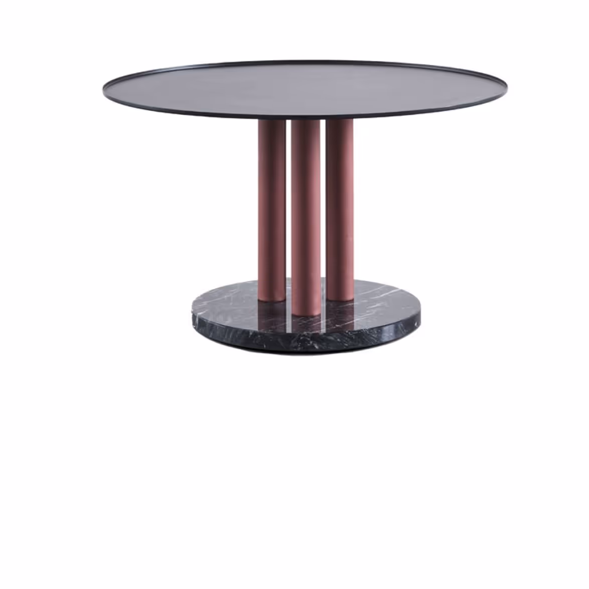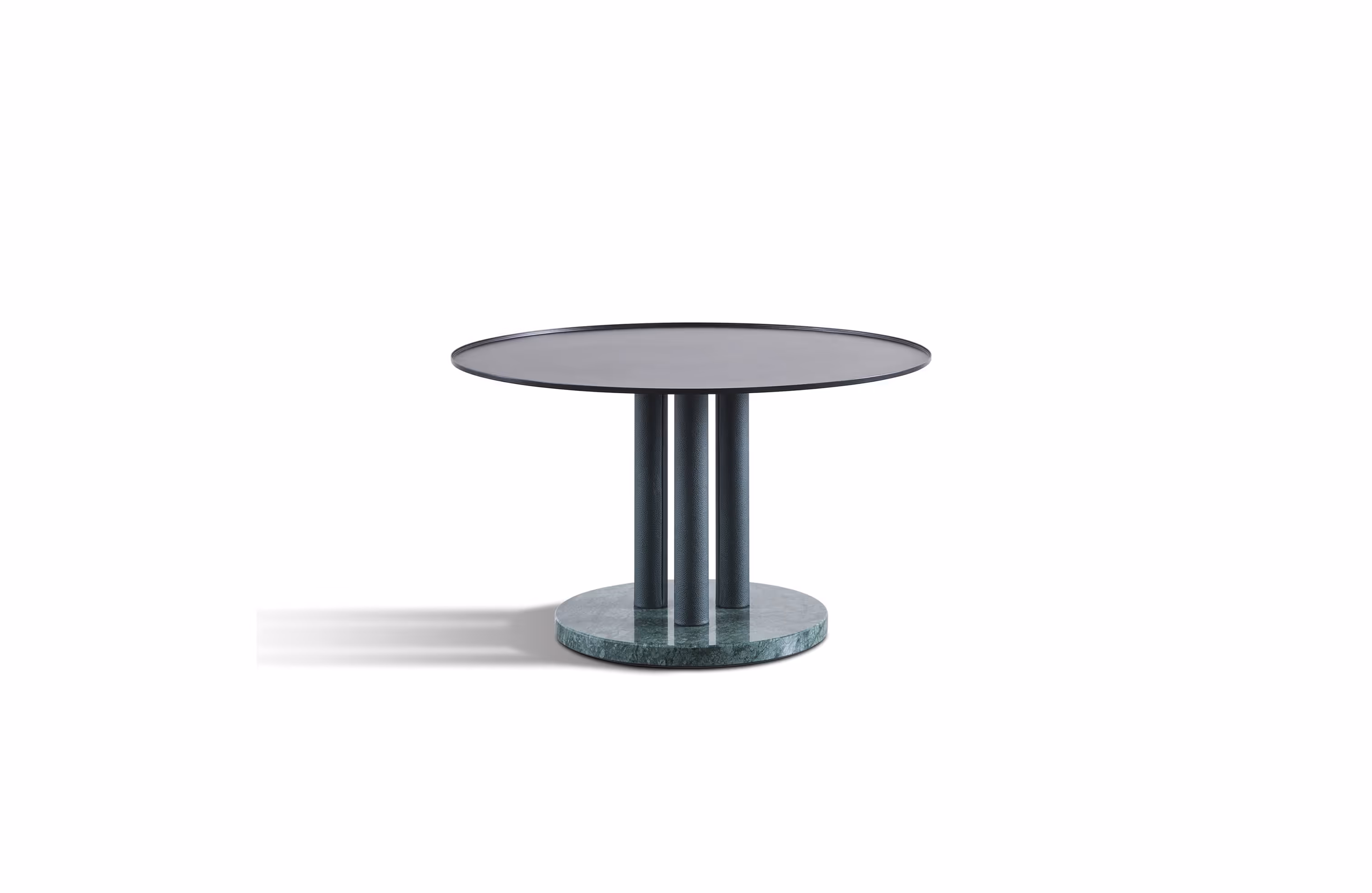 Next to a sofa, desk or bed, as well as in a closet space, it makes itself useful holding reading glasses, jewelry, electronic devices, a cup of tea or other things. In each case the base is a solid pedestal hewn from the highest-quality marble, from which slender powder-coated aluminum supports issue. On the tables, these rods – or batons to adopt the French nomenclature – are wrapped in leather throughout with the highest degree of precision.