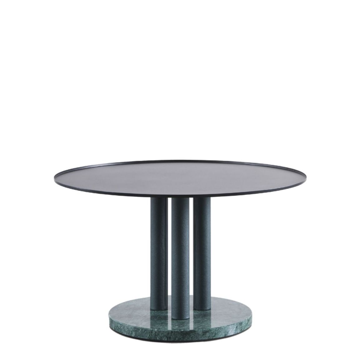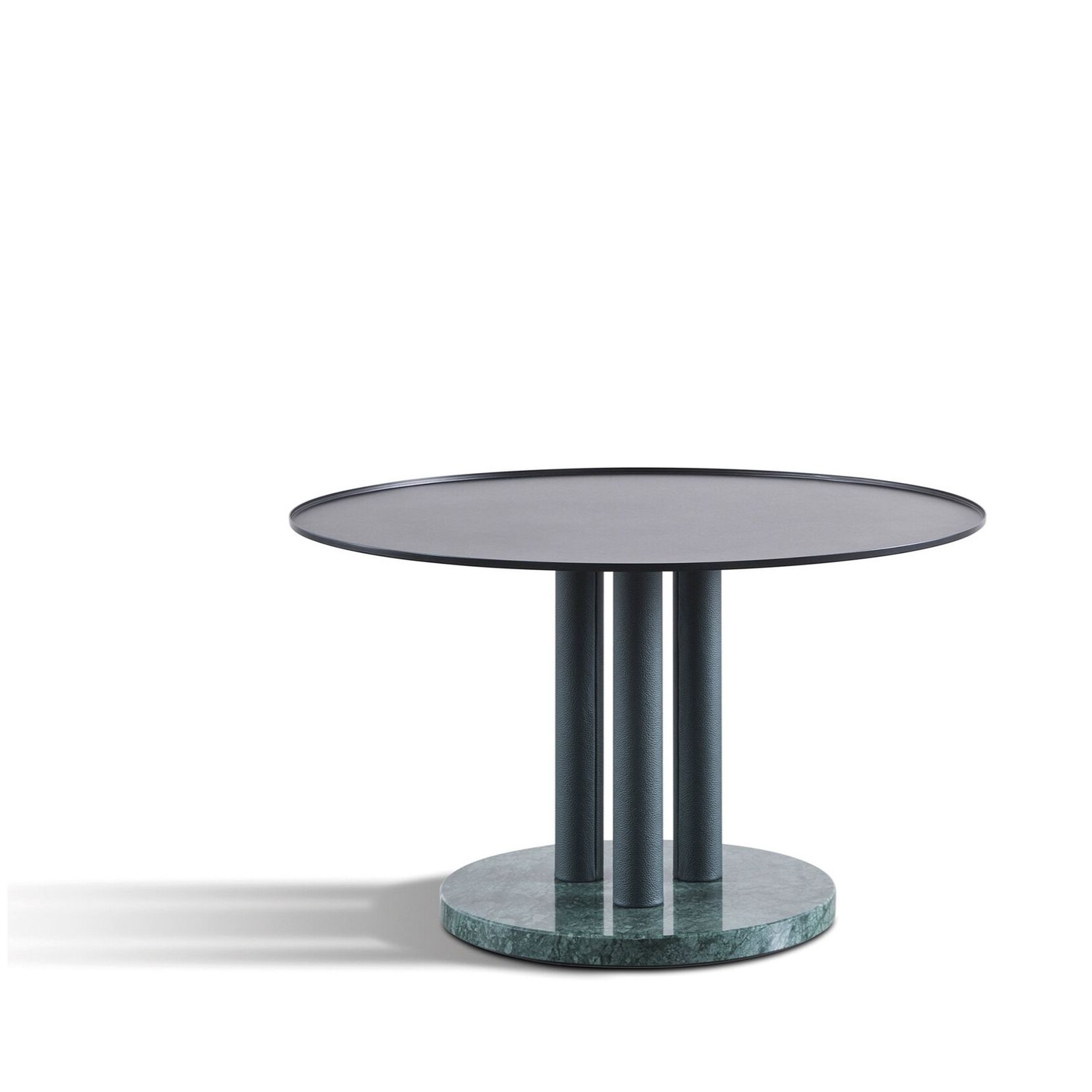 Next to a sofa, desk or bed, as well as in a closet space, it makes itself useful holding reading glasses, jewelry, electronic devices, a cup of tea or other things. In each case the base is a solid pedestal hewn from the highest-quality marble, from which slender powder-coated aluminum supports issue. On the tables, these rods – or batons to adopt the French nomenclature – are wrapped in leather throughout with the highest degree of precision.