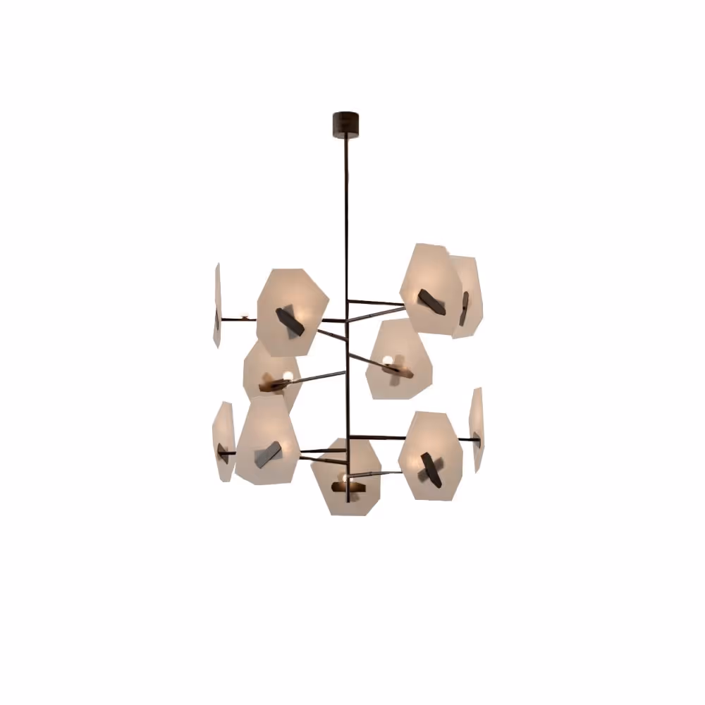Gem clusters along geometric structures. A huge arc or a vertical cascade. Gem lamps have infinite possibilities starting from a personalized metal structure to the density of the glass gems. Canopies also can be adapted to finishing and composition size.
