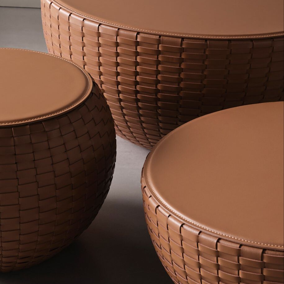 Bongo’s low table collection shows a new finish: the softness and strength of leather together with the skilful hand-woven manufacturing perfectly embrace the geometric shapes of this collection.