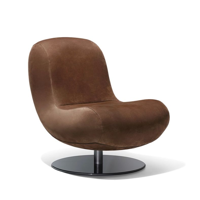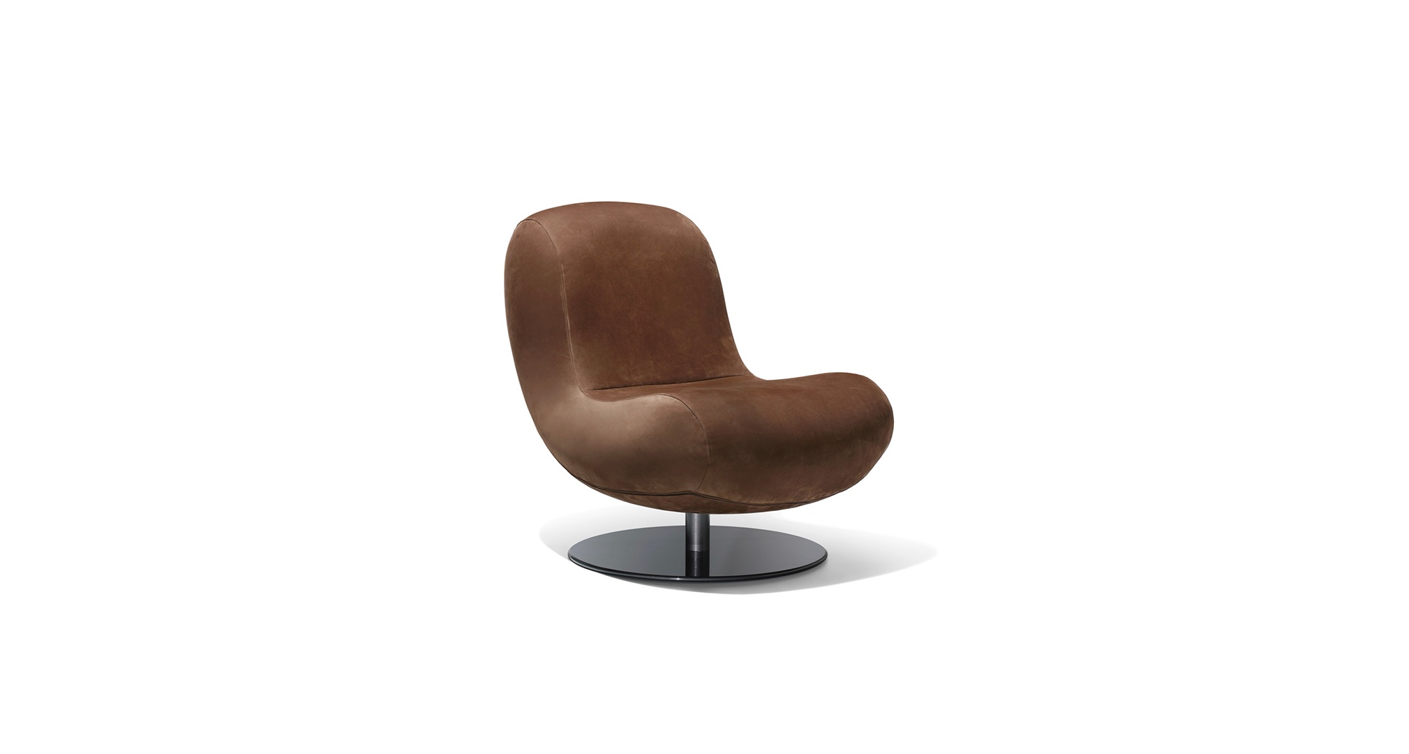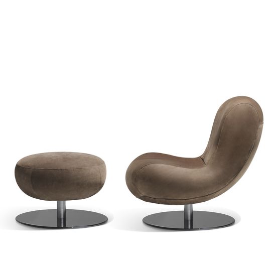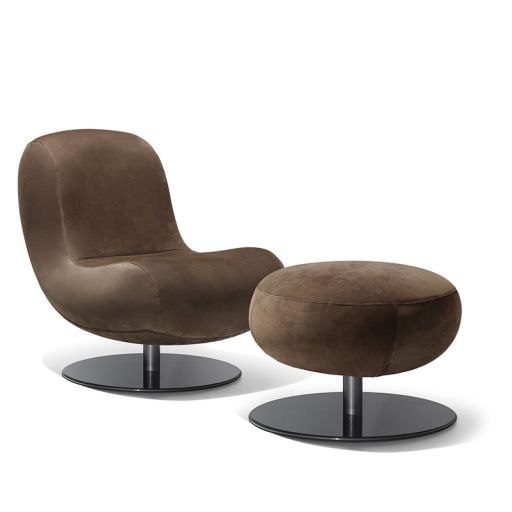 The inside structure is a metal frame with structure padding in flexible cold moulded polyurethane with a cover in bonded cotton-polyester fibre velveteen. The outer cover is removable.. The armchair swivel base is an aluminium disc featuring a central column and a steel fixing plate, with 360° swivel motion and automatic return, and feet in non-slip plastic. The pouf has a fixed base made of an aluminium disc featuring a central column and a steel fixing plate, with base finishes available in glossy pewter colour.