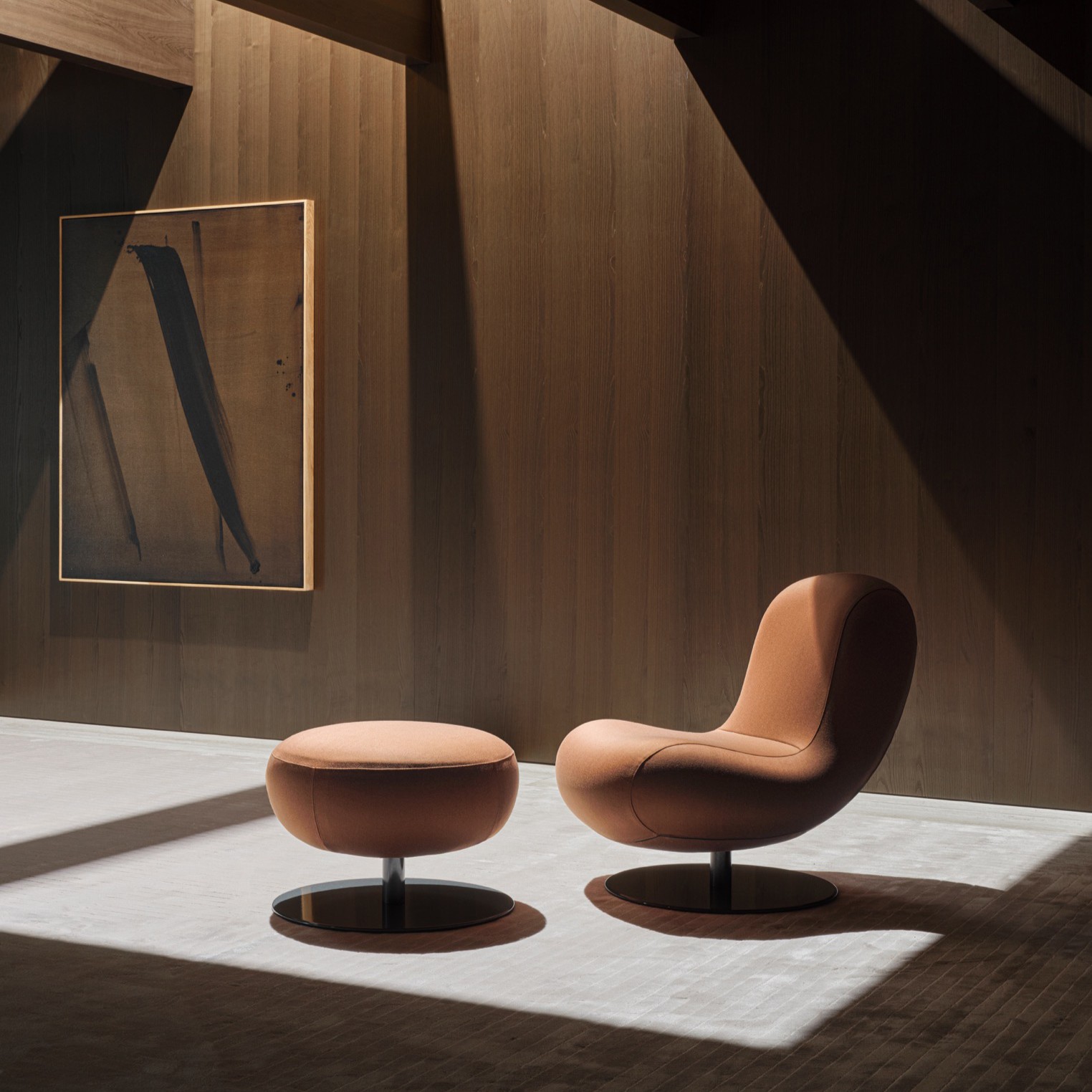 The Bosco armchair by Naoto Fukasawa is an armchair that invites the body to let go. Inspired by the gentle hills of Tuscany, its soft, generous volume and subtly divided contours, echo the rhythms of the landscapes. Its form is defined by generous volumes that support the body naturally, allowing the sitter to settle into the chair's embrace. The design favors continuity, shaping a compact silhouette that feels stable, protective, and calm within the space.