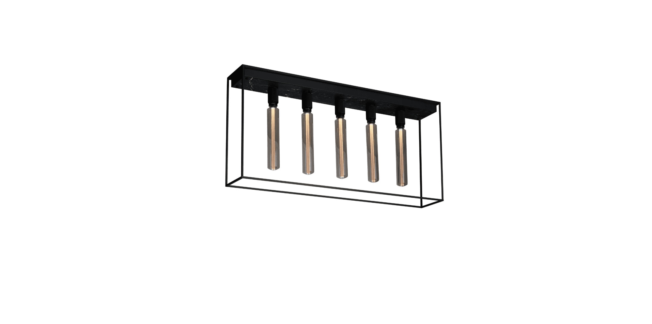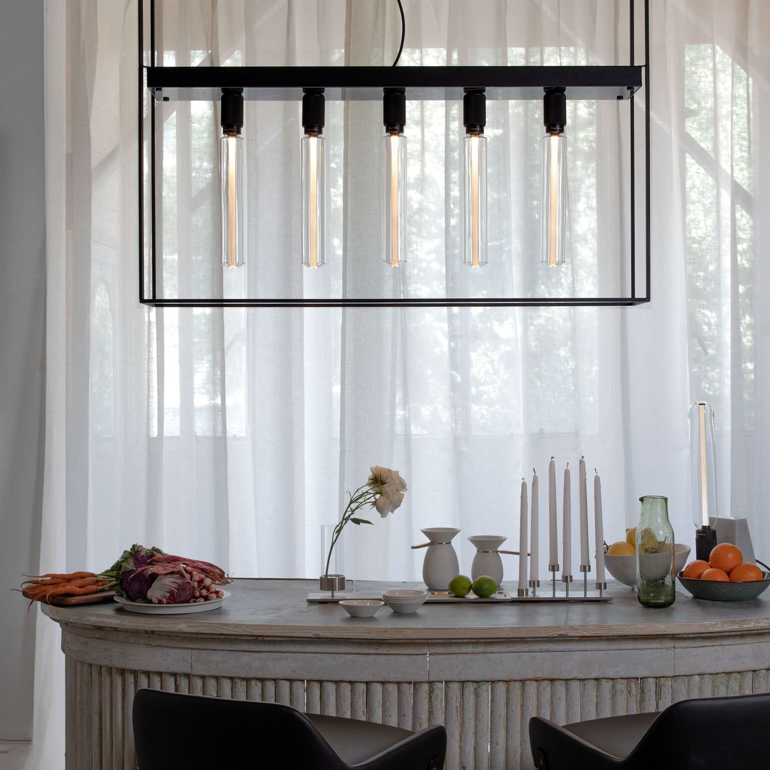 he 5.0 is a statement light that looks great over bars or dinner tables. The light can be surface mounted directly to the ceiling or elongated with an additional extension cage.
