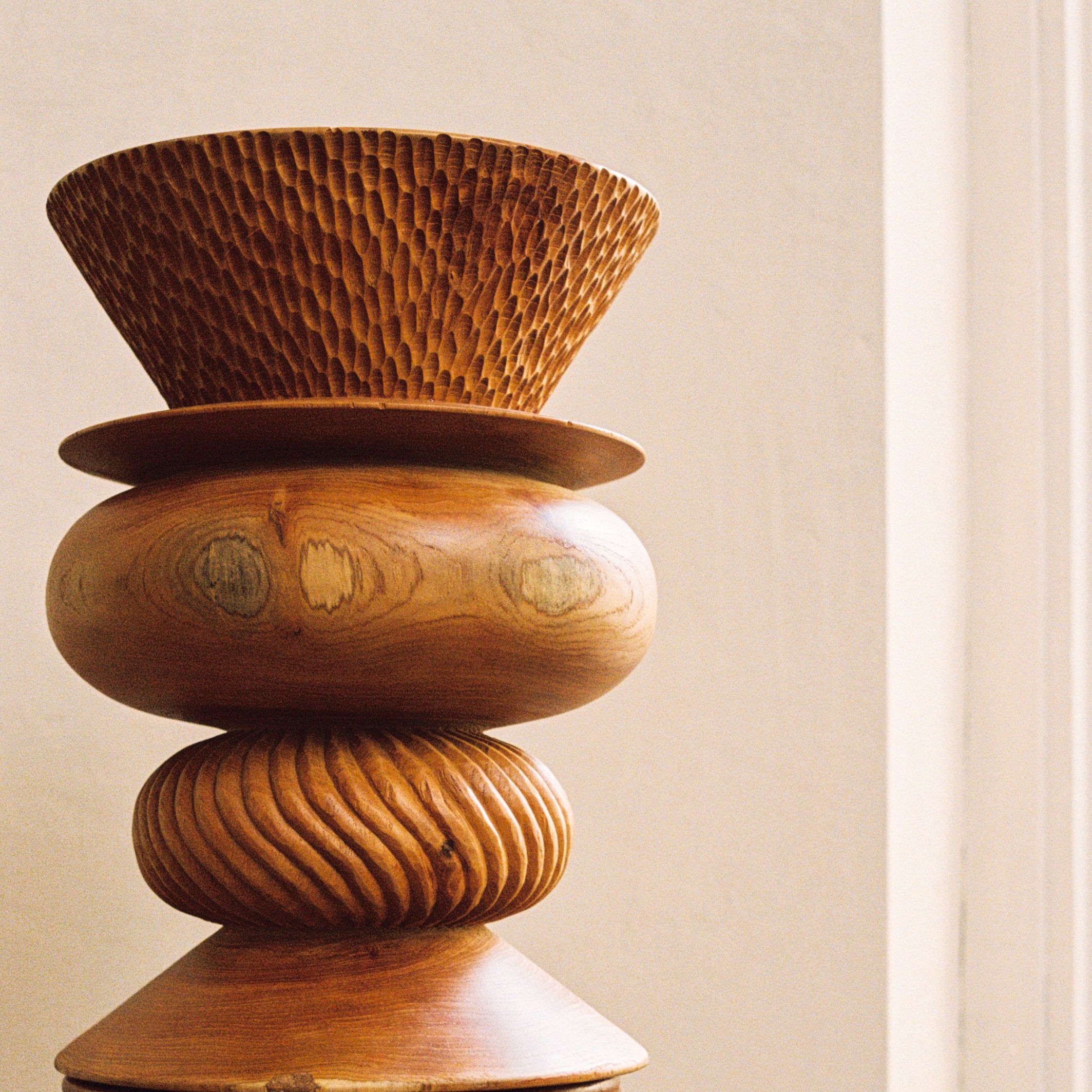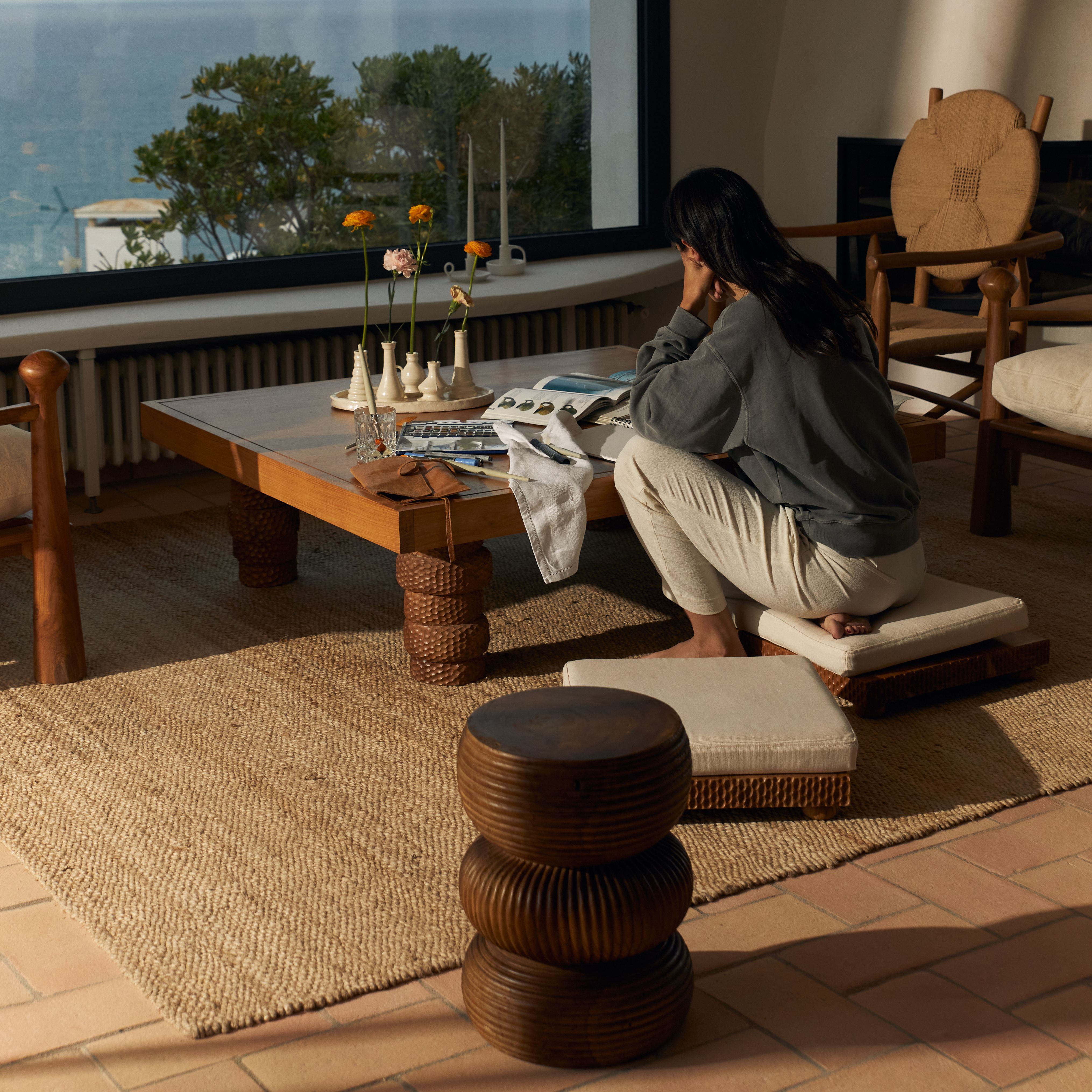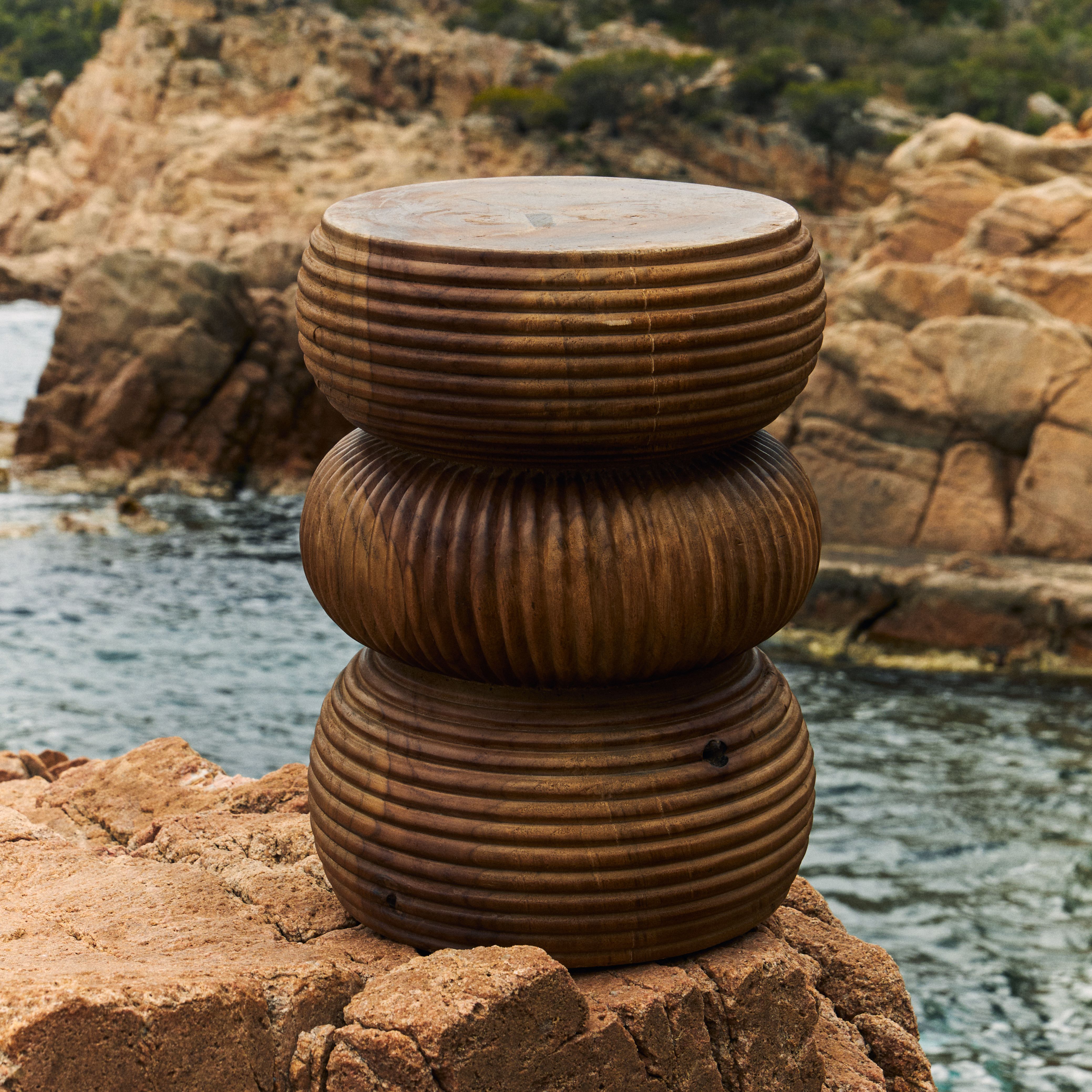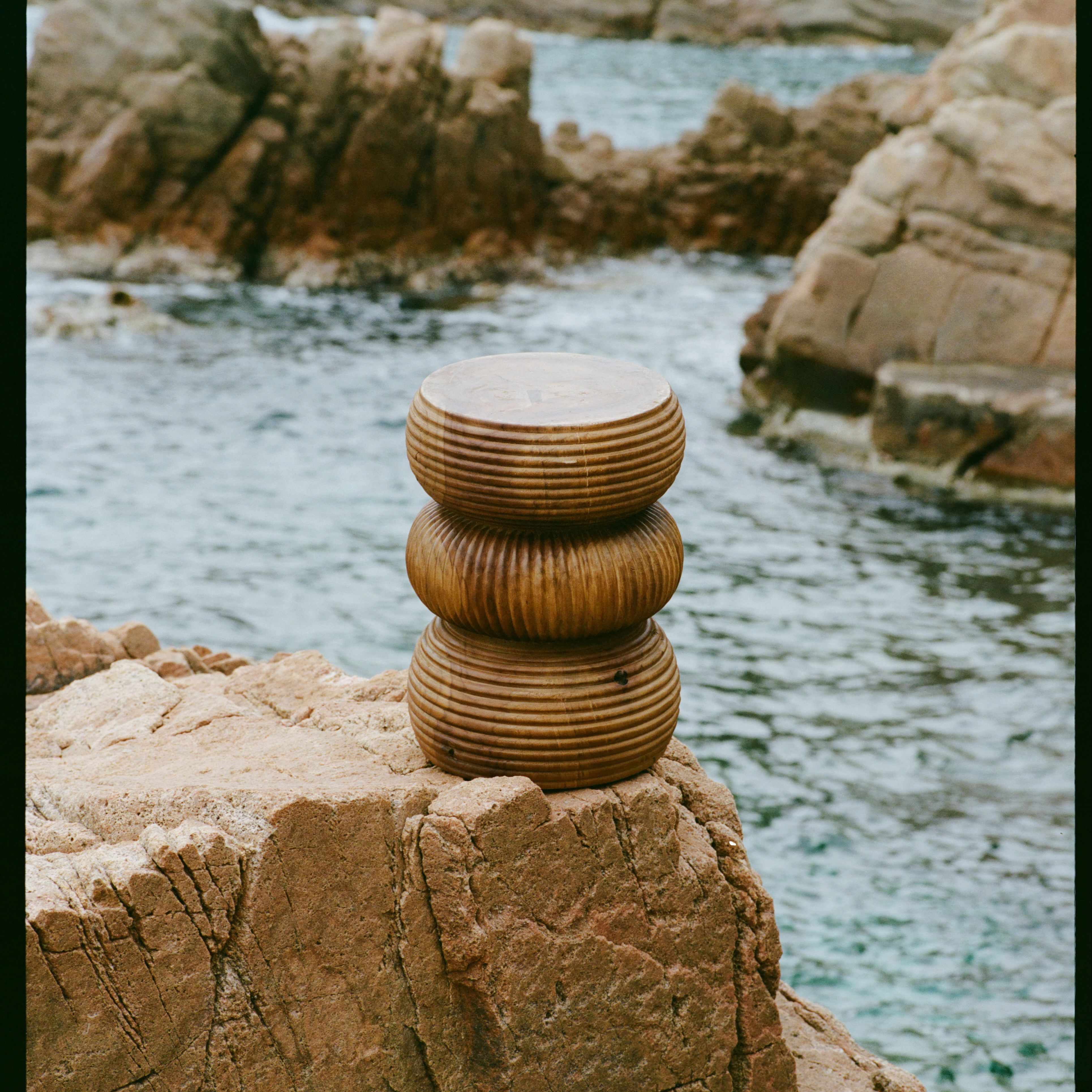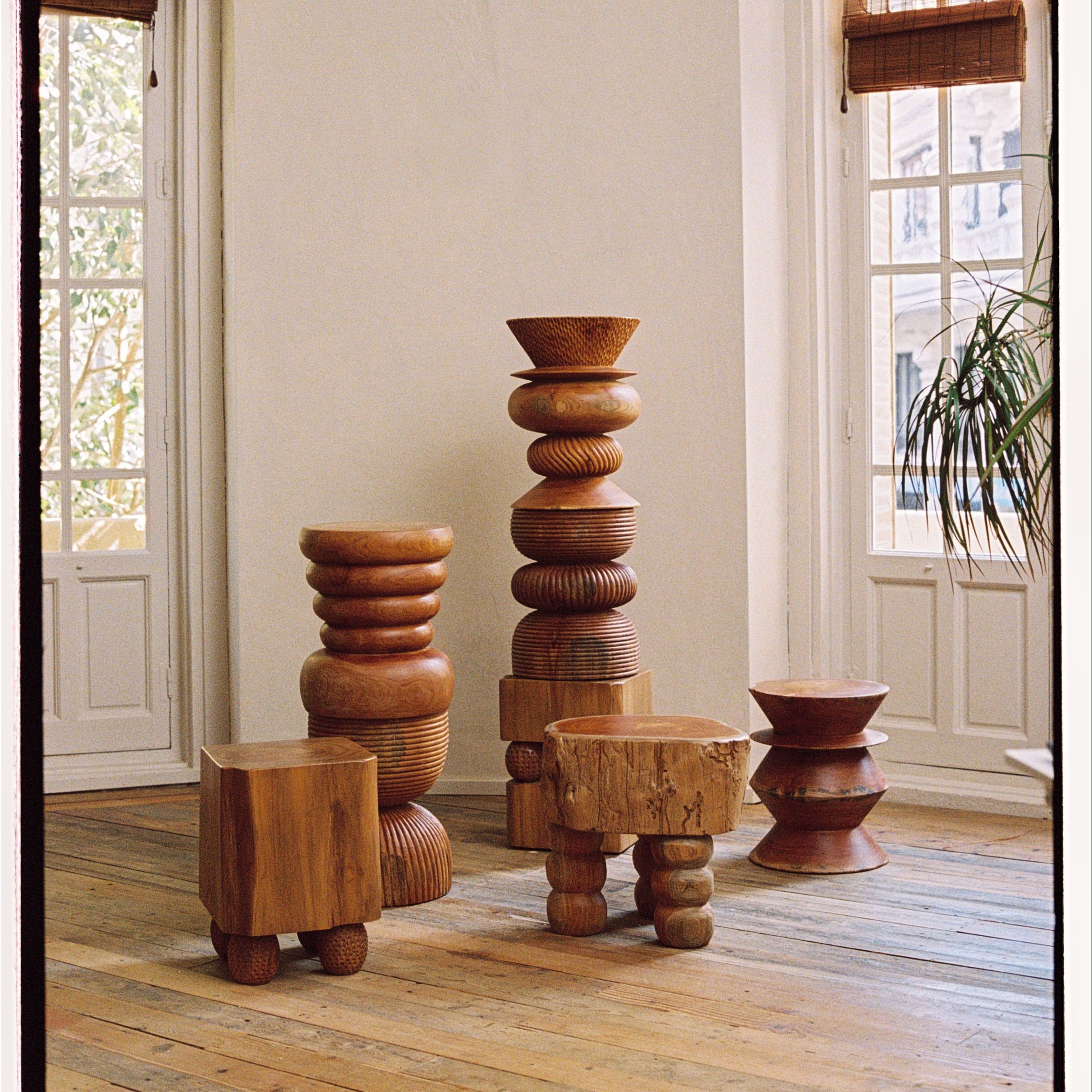 The stool is hand-carved from a single block of solid teak wood, inspired by the pleating process of Maison Lemarié with Atelier Lognon. It reflects craftsmanship and haute couture, drawing from fashion and artisanal sewing work.