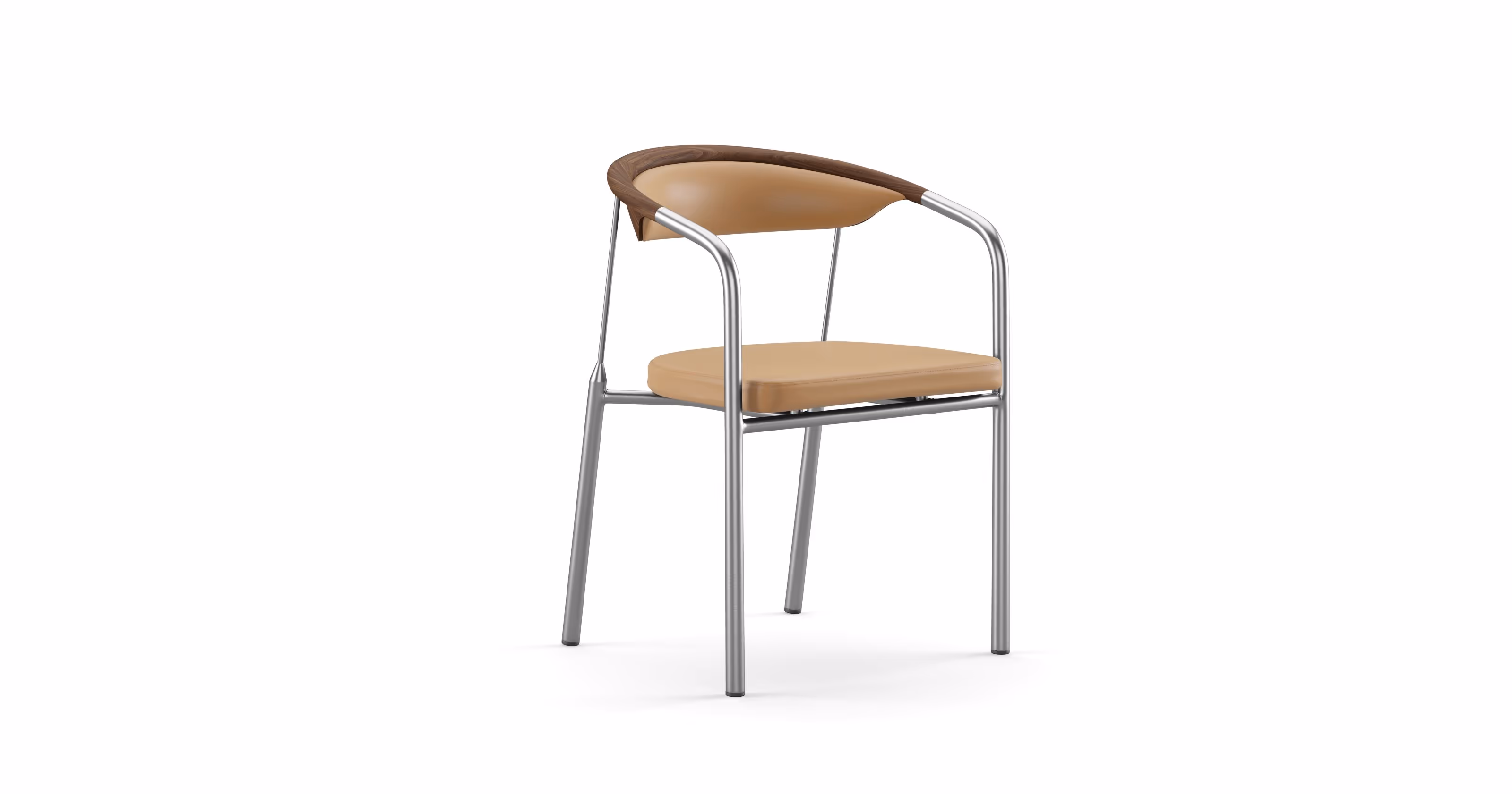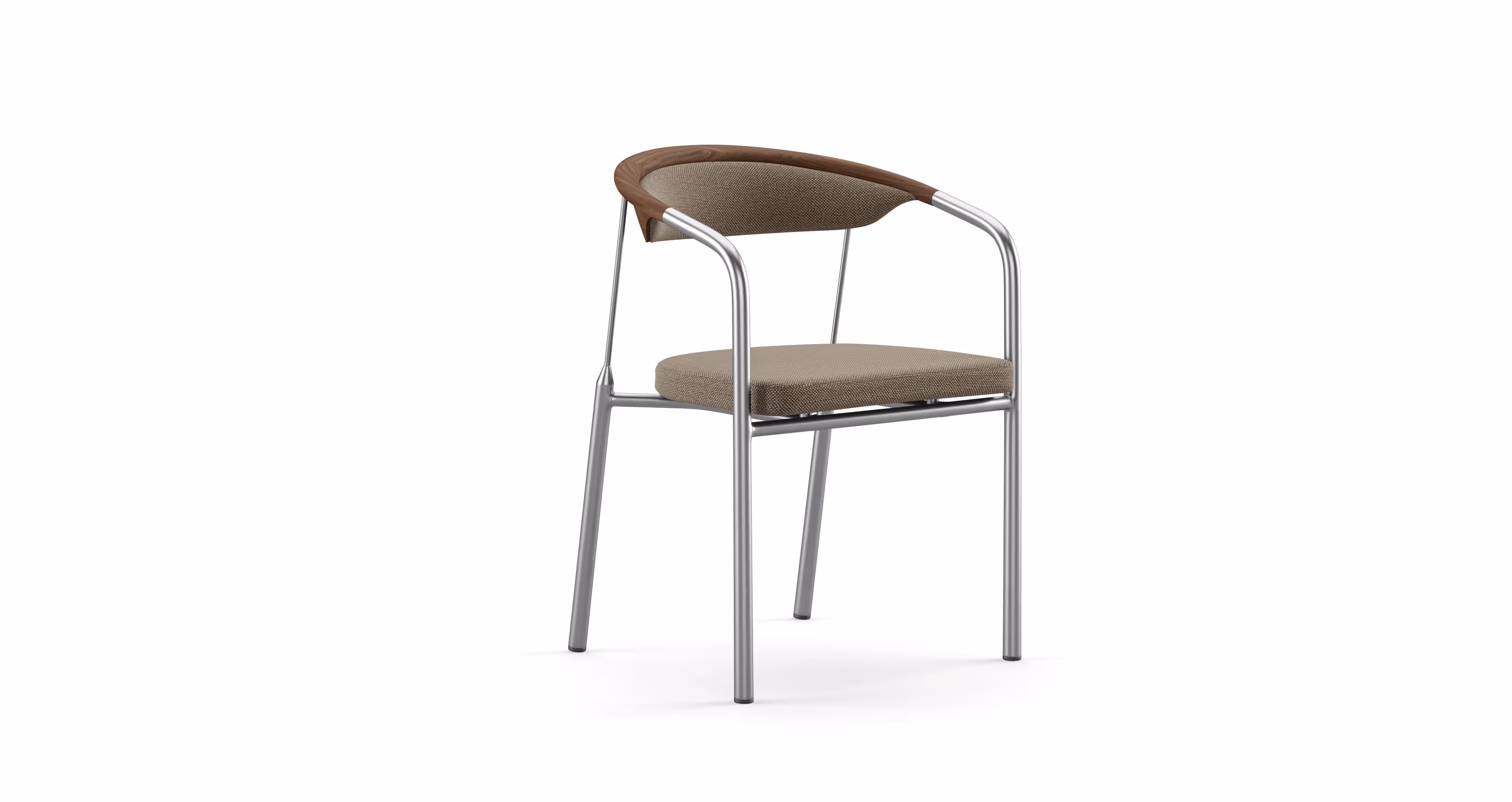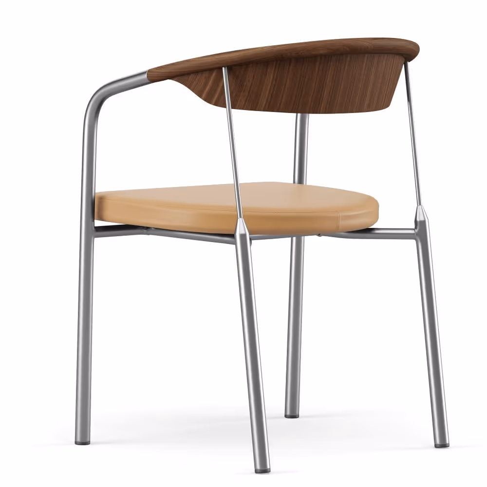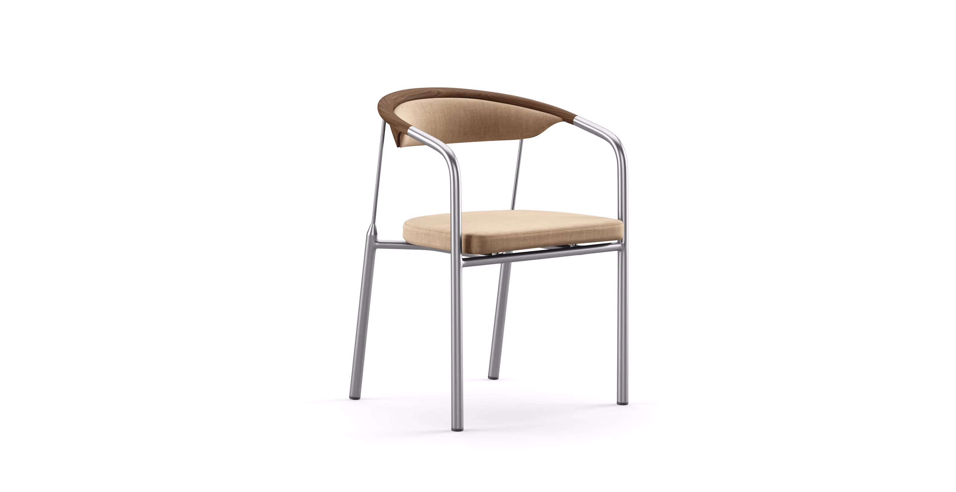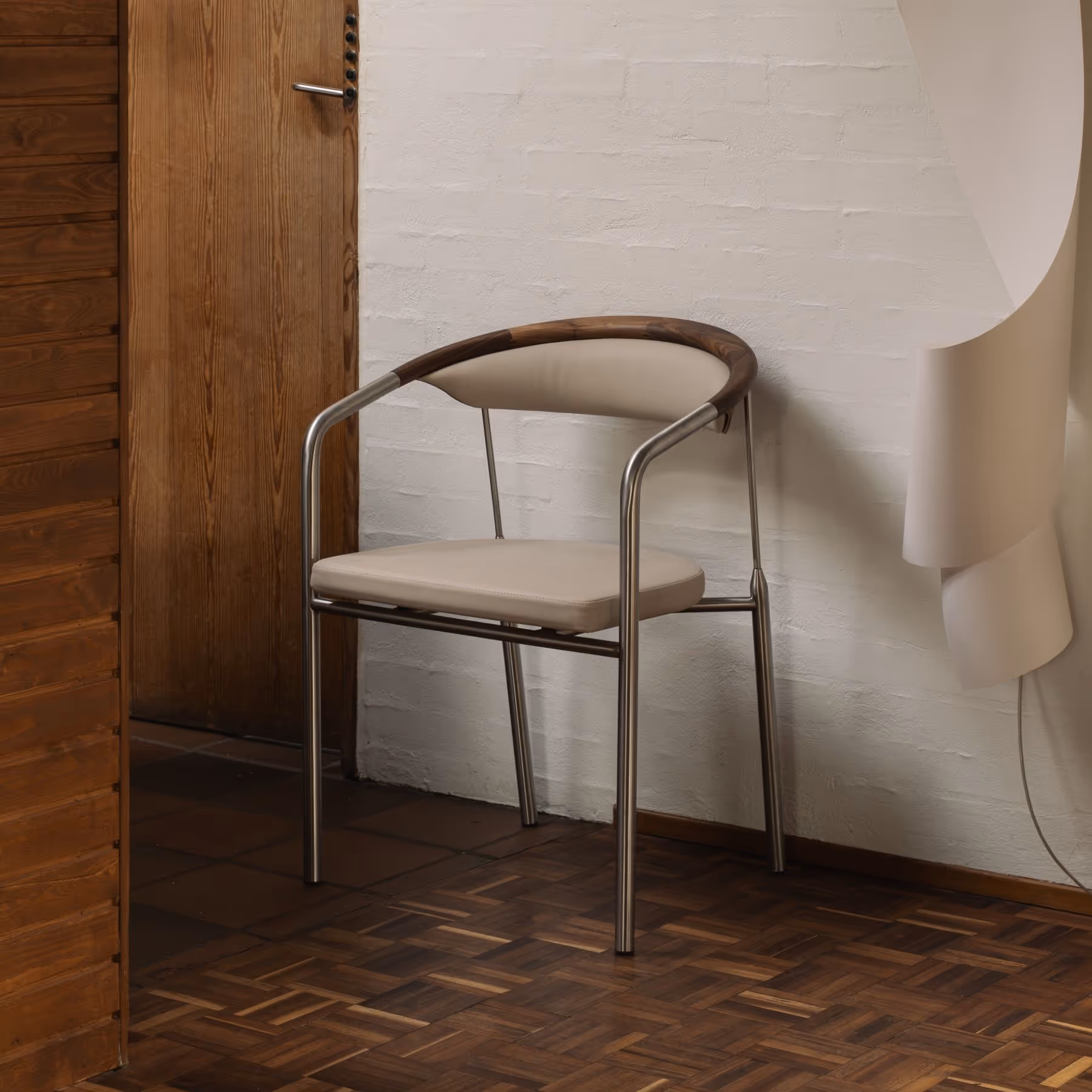The upholstered wooden backrest seamlessly merges with a black steel tube, functioning as an armrest and extending down to the floor. Available in oak or walnut with upholstery in textile or leather, the chair is suitable for both private homes and corporate settings.