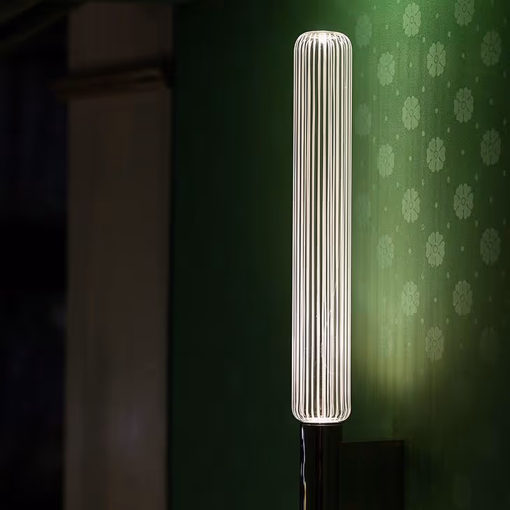 Cipher collection is a juxtaposition of heritage techniques and contemporary form. Its delicate hand-blown crystal cylindrical pieces are cut with clean, clear lines. Light emits only from connection points and the sources are ingeniously hidden to soften the overall effect.