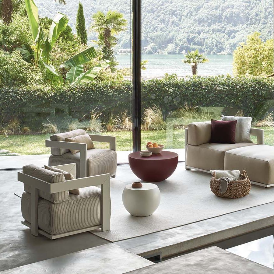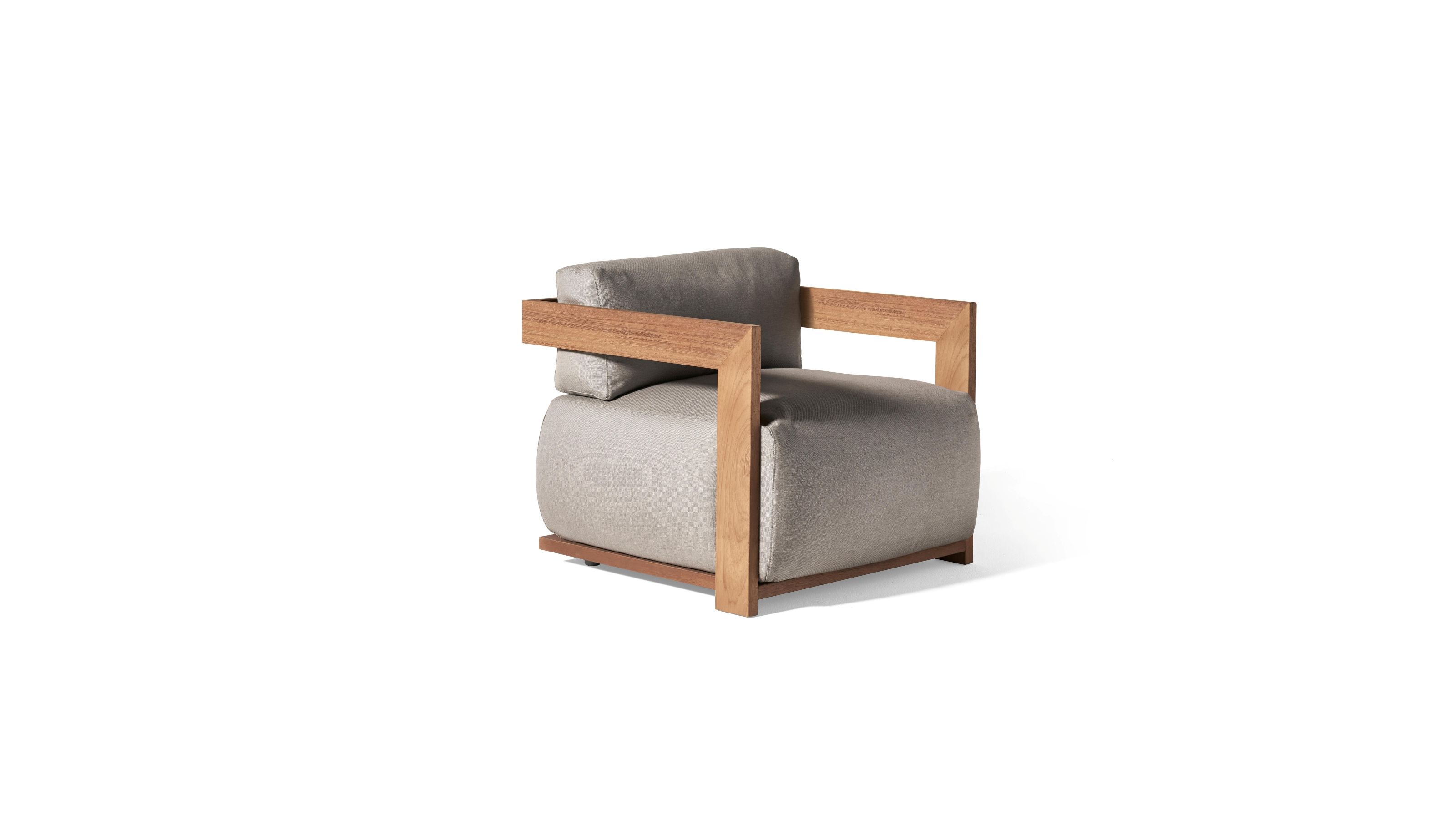 The Claud Open Air collection stands out for its minimal design and soft cushions. Sophisticated and resistant, these furnishings are made of solid iroko with protective varnishing. Precious materials and soft padding for a living room and an oasis of relaxation to live 'en plein air'.