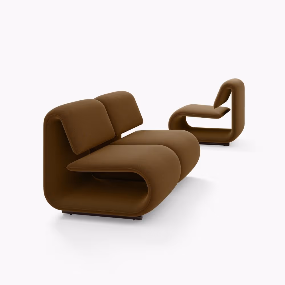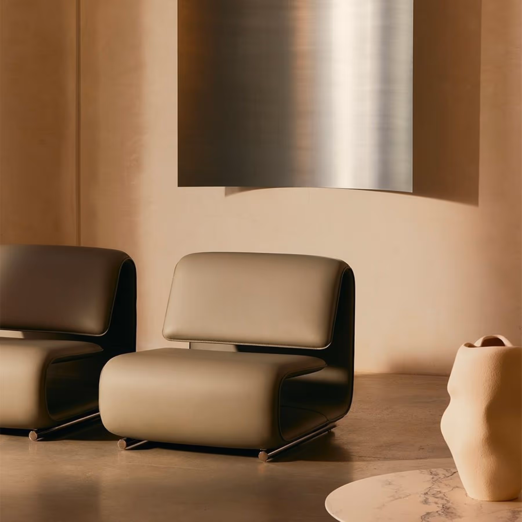 The armchairs elements are based on the perfect integration of upholstery and metal structure, with slender tubular frames that create a balance between solidity and suspension in space.