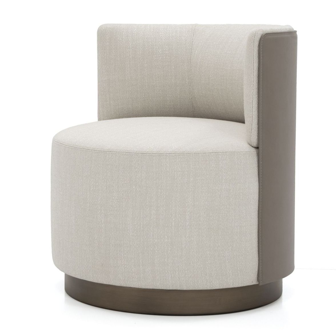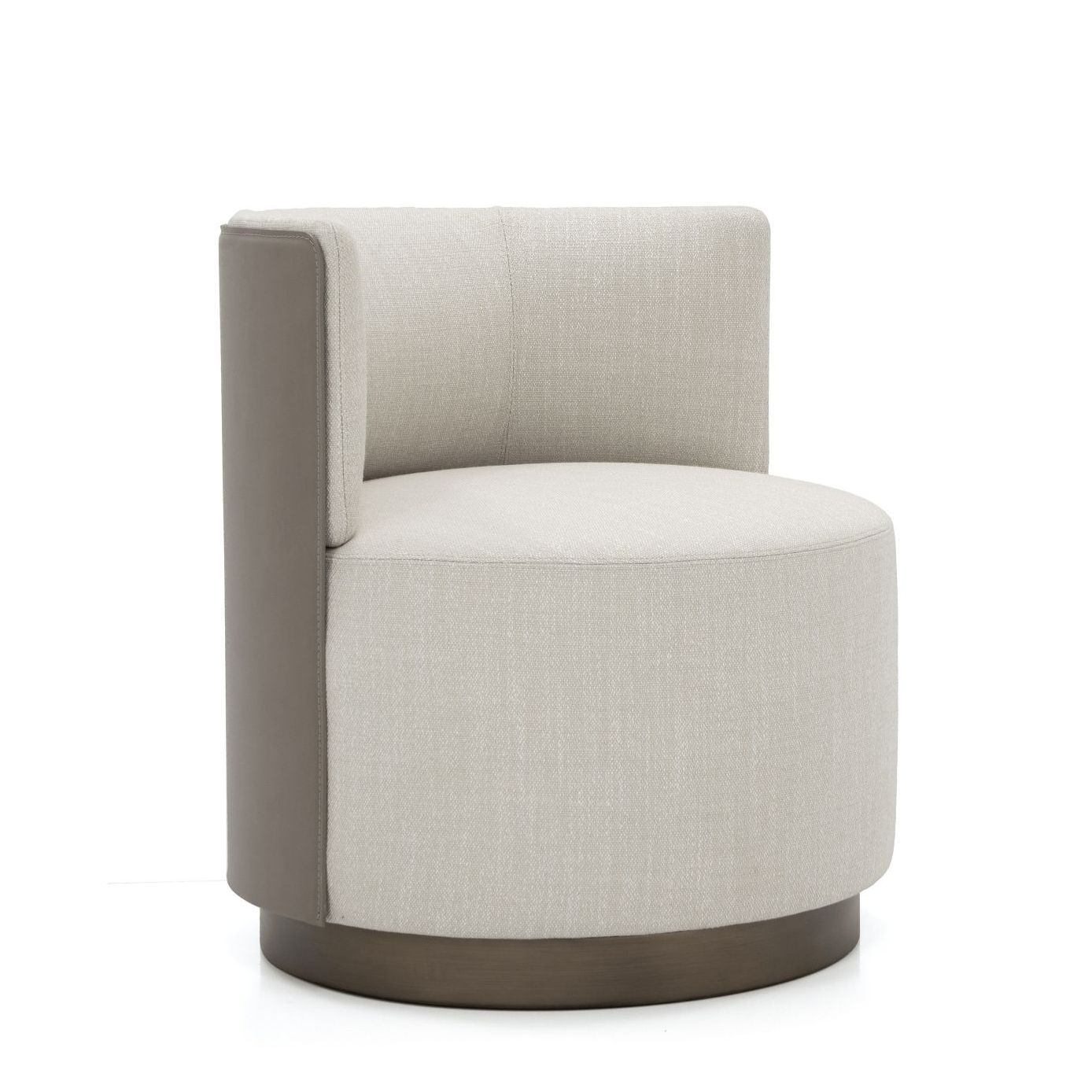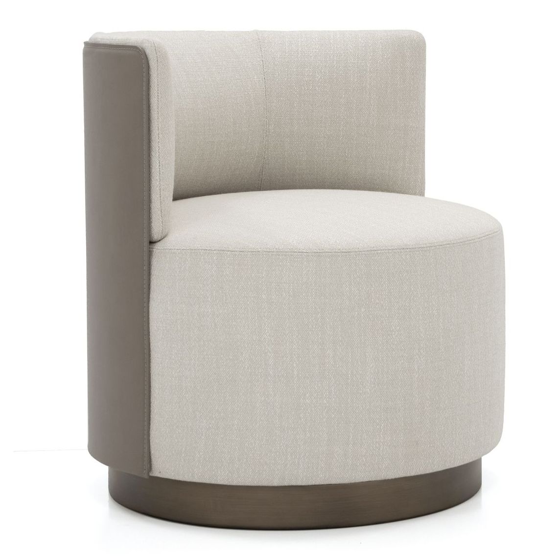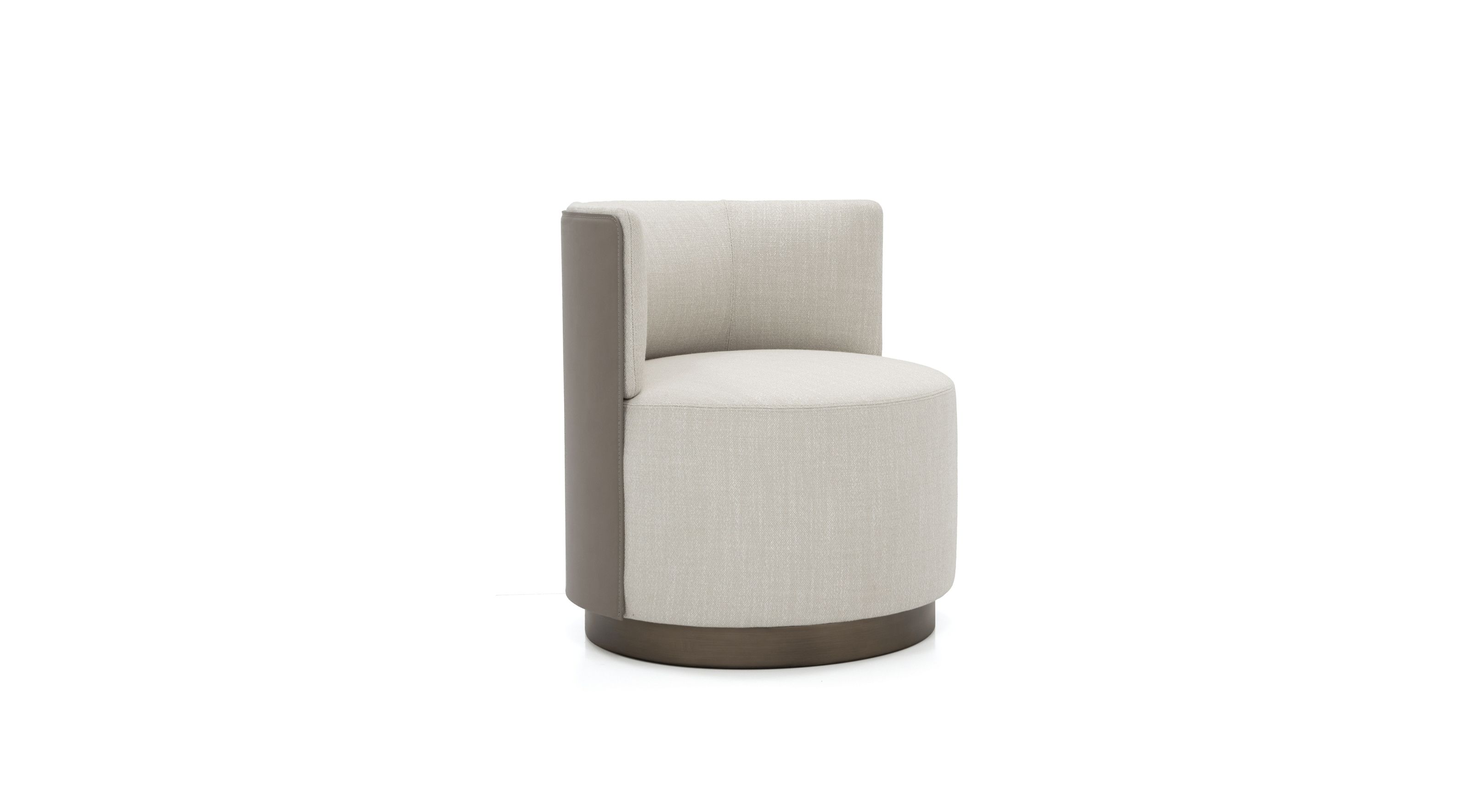 Dining armchair fully upholstered in leather of rabric monomaterial or bimaterial with different combinations . Swivel metal base with return, brushed brass or black finish.