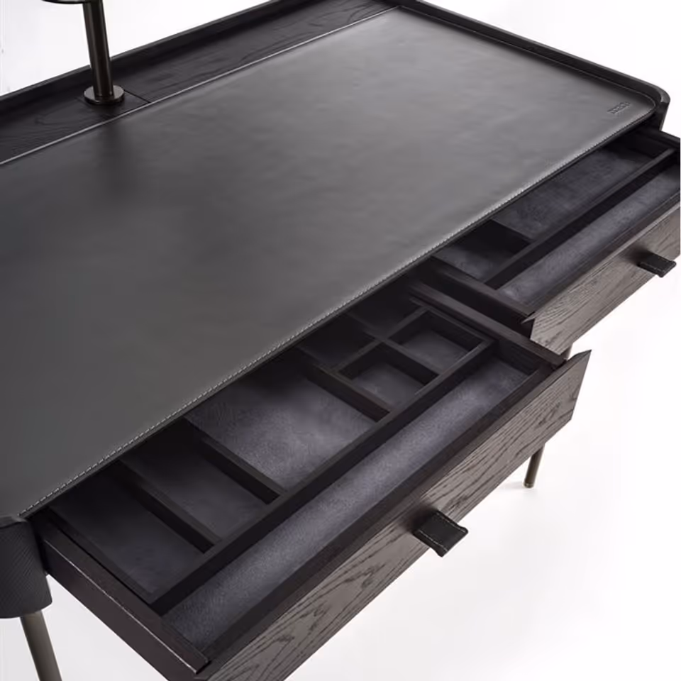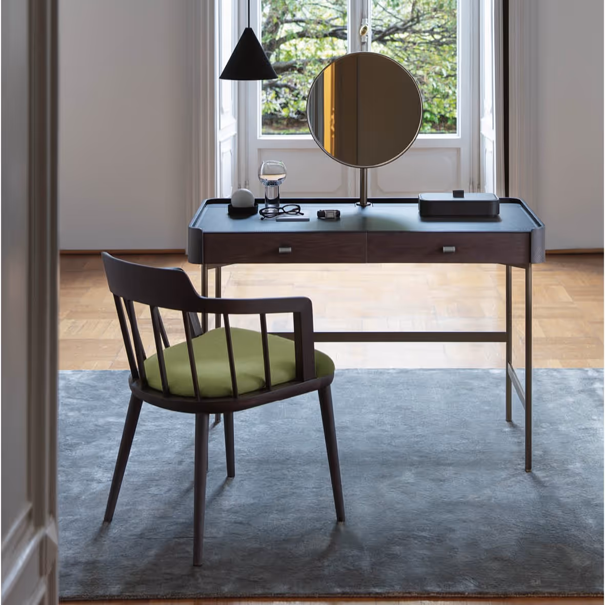 This modern piece has two storage drawers with leather handles and a bottom covered in microfiber, on the back side there are two compartments for cables management with a pull-push opening. Low or high boxes with leather tops and an adjustable mirror complete the design of this coiffeuse. With its enveloping and sinuous lines, marked by calibrated bevelled angles, Dafto fits perfectly with many other elements of the Porada collection, in particular the Serena chairs with armrests.
