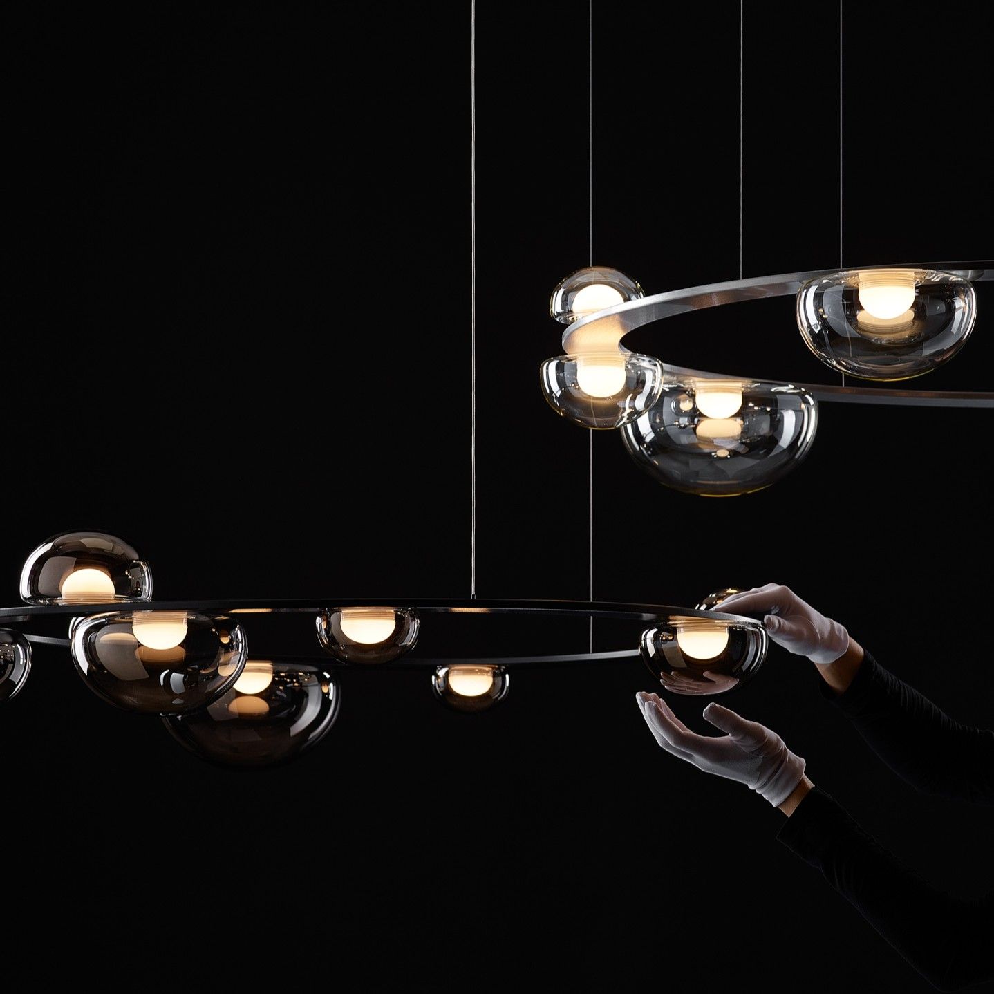 Dew Drops Circle transforms this poetic vision into a more monumental, spatial form: a ring that can be suspended above a dining table, kitchen island, or lobby area to create a striking, elegant lighting accent. The piece feels simultaneously technical and modern, yet gentle and graceful.