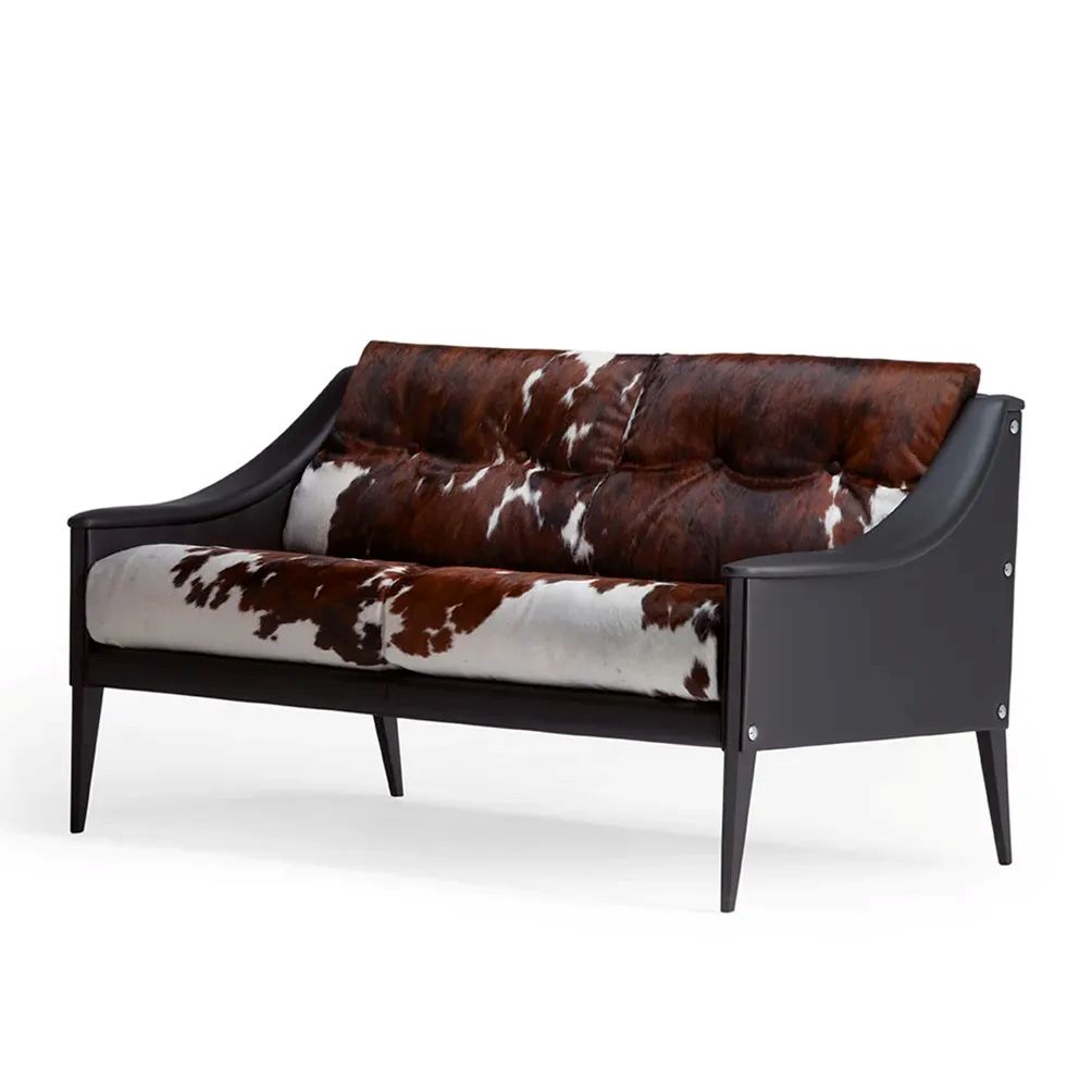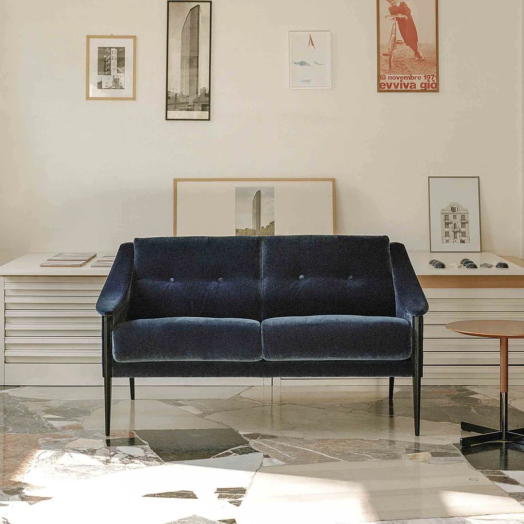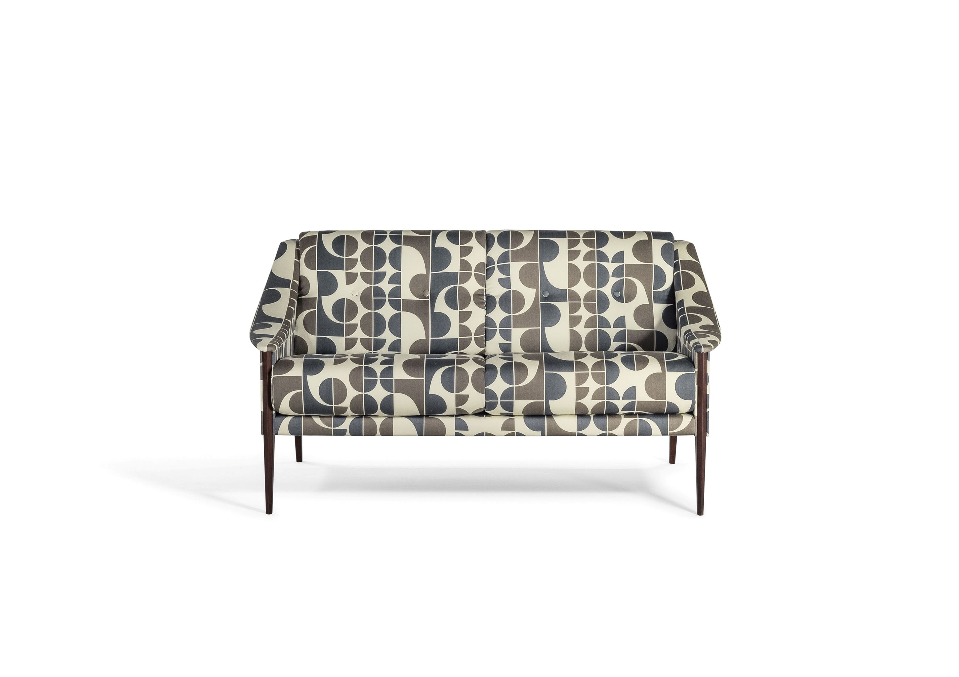 The historical Dezza two-seater sofa, designed by Gio Ponti, has a seasoned beech frame. The Dezza sofa is available with upholstery in Pelle Frau® leather, a leather/pony skin combination or fabric. Among fabrics, it comes the Redevance printed wool satin fabric, whose graphic pattern was designed by Ponti himself.