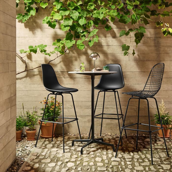 They are also optionally available with a seat cushion or full upholstery. With the Eames Plastic Stools RE, the black or chrome-plated four-legged base with a footrest comes in a choice of two heights: medium for standard kitchen counters and high for standing-height tables.
