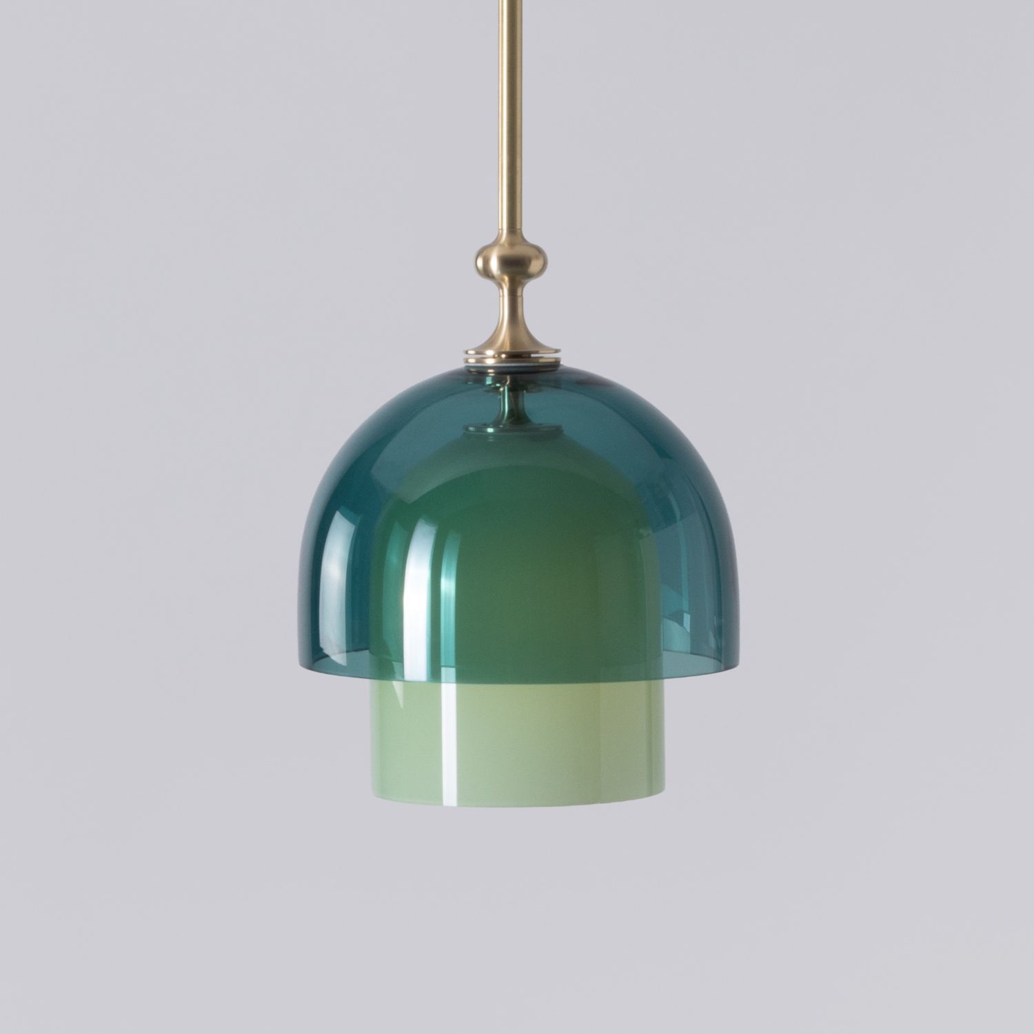 The Elizabeth lighting series combines glass shapes of different geometries within an outer transparent glass dome. The pendant stem transitions above the glass into a decorative metal profile. The Elizabeth II Pendant pairs a smaller elongated inner dome of lit opaque glass with its larger outer transparent glass dome.