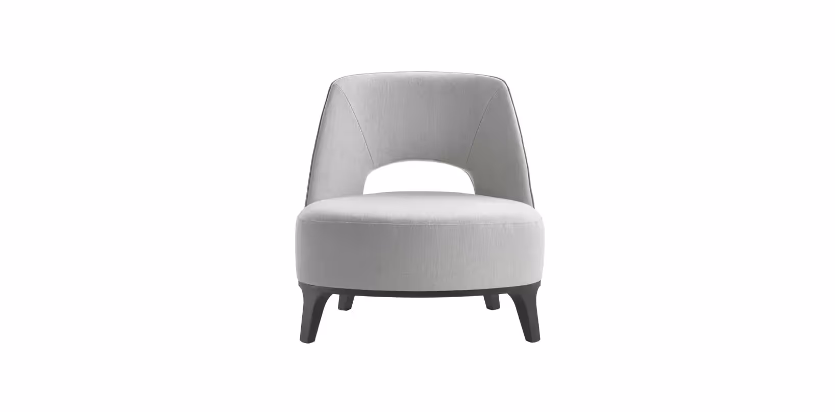 The enveloping upholstered seat back gains a lighter look thanks to an exquisitely sculpted opening above the seat. The graceful lines and vaguely retro charm of the Ermione armchair are also reflected in its base, made in cast aluminium or in solid wood in an array of sophisticated shades.