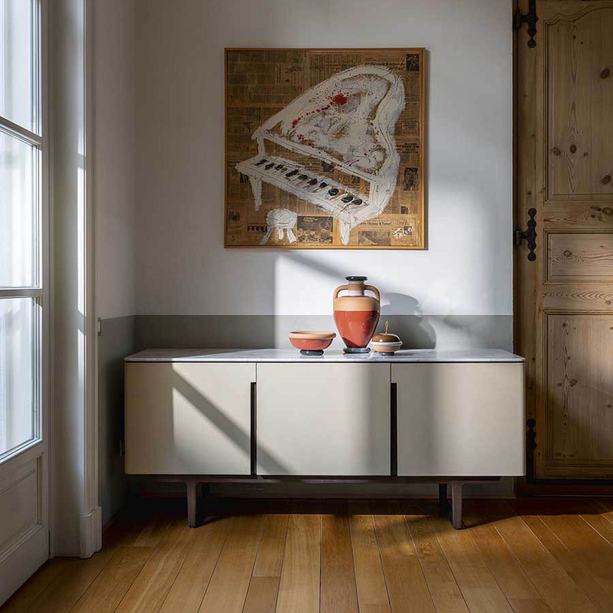 The Fidelio Low Cabinet is available in two variations, one larger and one smaller. The sideboard structure is solid ash wood and birch plywood veneered in ash. The inside frame is made of extra light maple. The sideboard is covered in leather on the sides and doors, while the top is in marble.