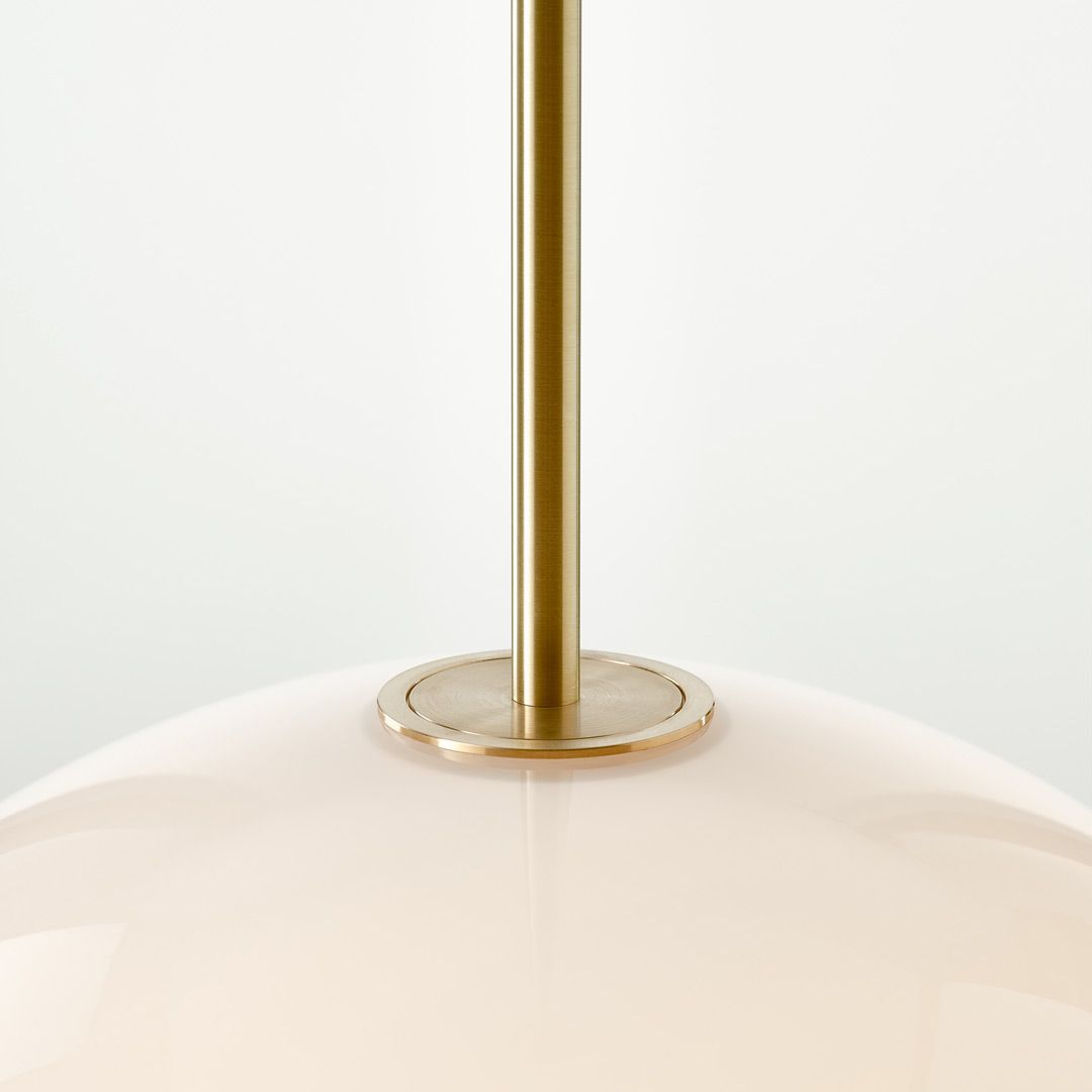 Symmetrical downward curving arms hold glass diffusers of handblown Czech glass. Suspended on a rigid brass tube stem. The glass diffusers are available in three shapes and in both “dipped” glass, featuring the SkLO double-dipped flame-polished mouth and “textured” glass, featuring a soft, frosted finish and subtle sculpted vertical ridges.