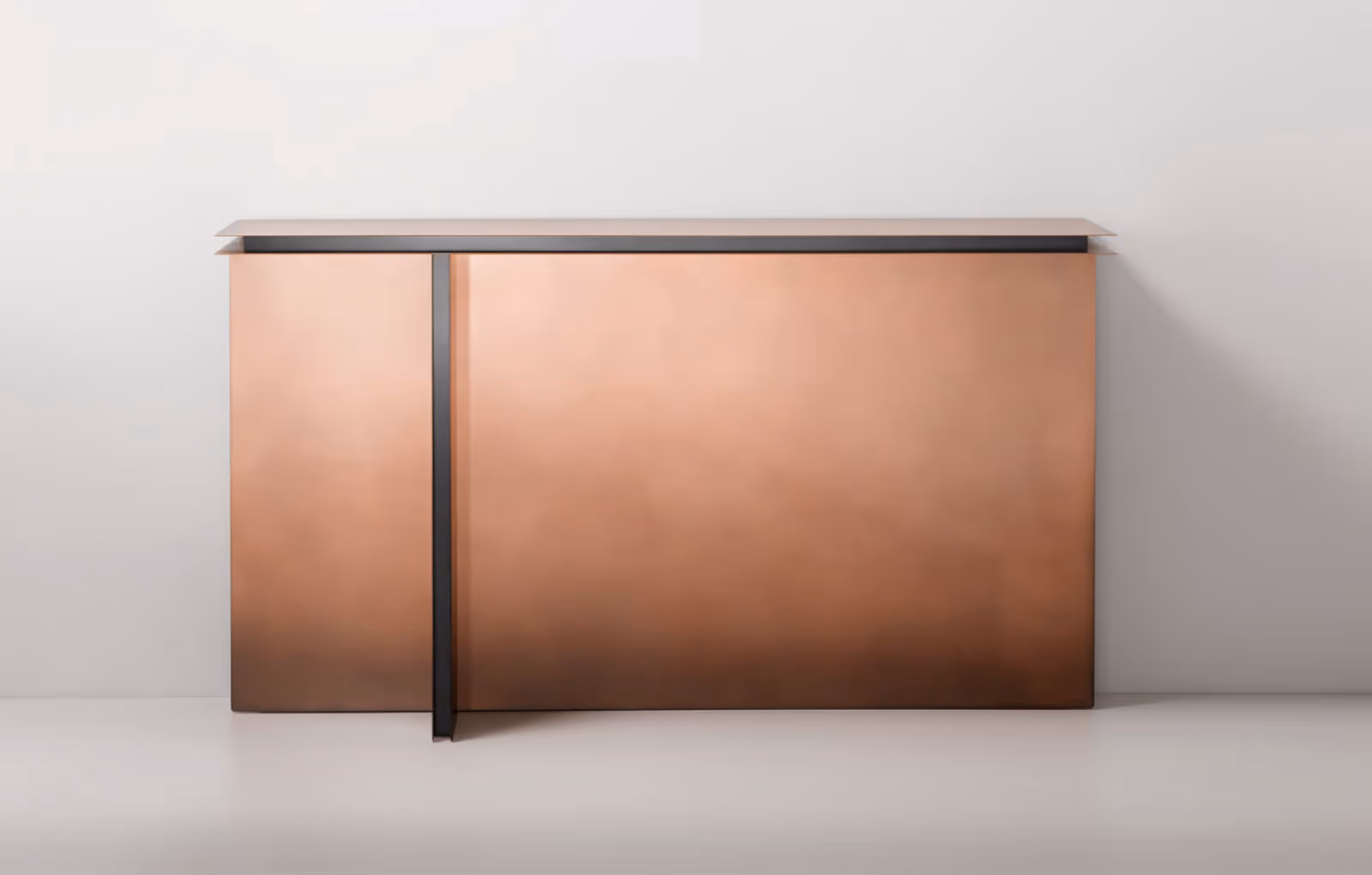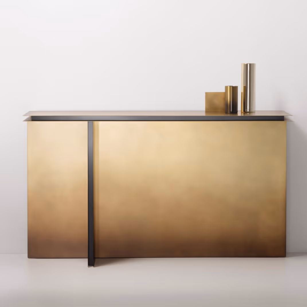 A dramatic, bold yet essential presence defines the Folio console, made of thick brass sheets placed on parallel planes. Exclusive design and style define the base and the top.