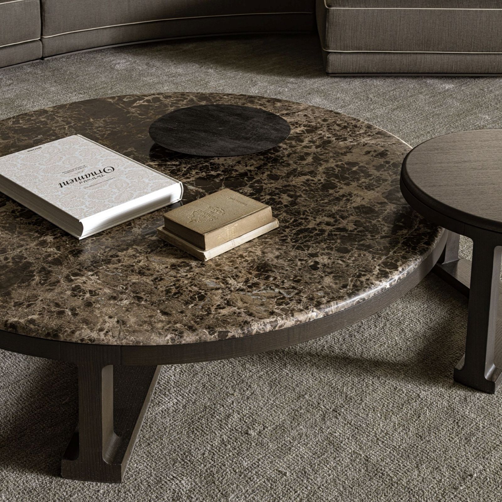 Fonte features three tables for three uses. Coffee table, lounge table and night table each rest on sturdy oak legs to support either a marble, essence, or black back-painted glass tabletop. The subdued color hues of each tabletop harmonize with the coffee and black oak base options to create a contemporary interplay of solidity and fluidity.
