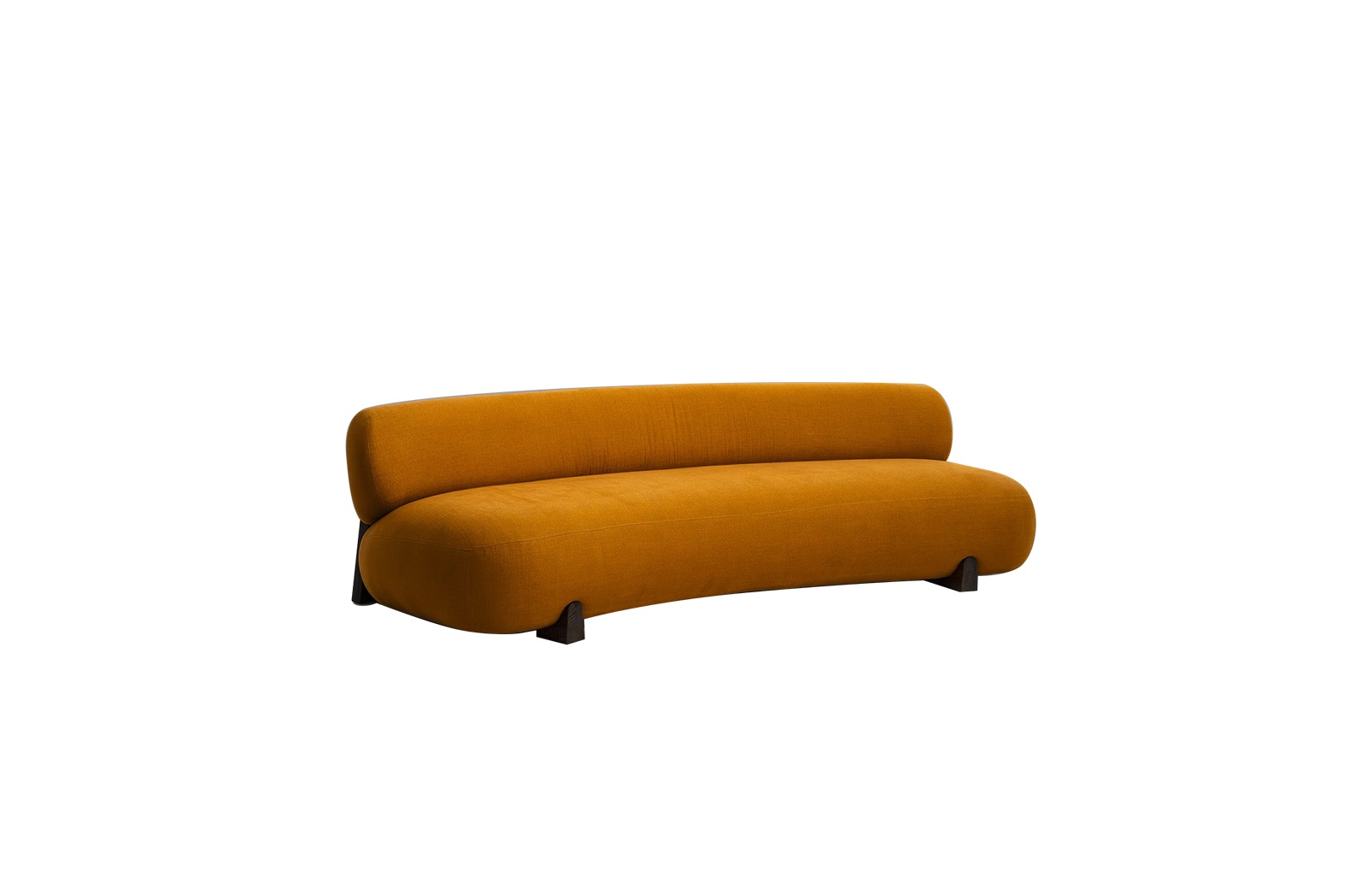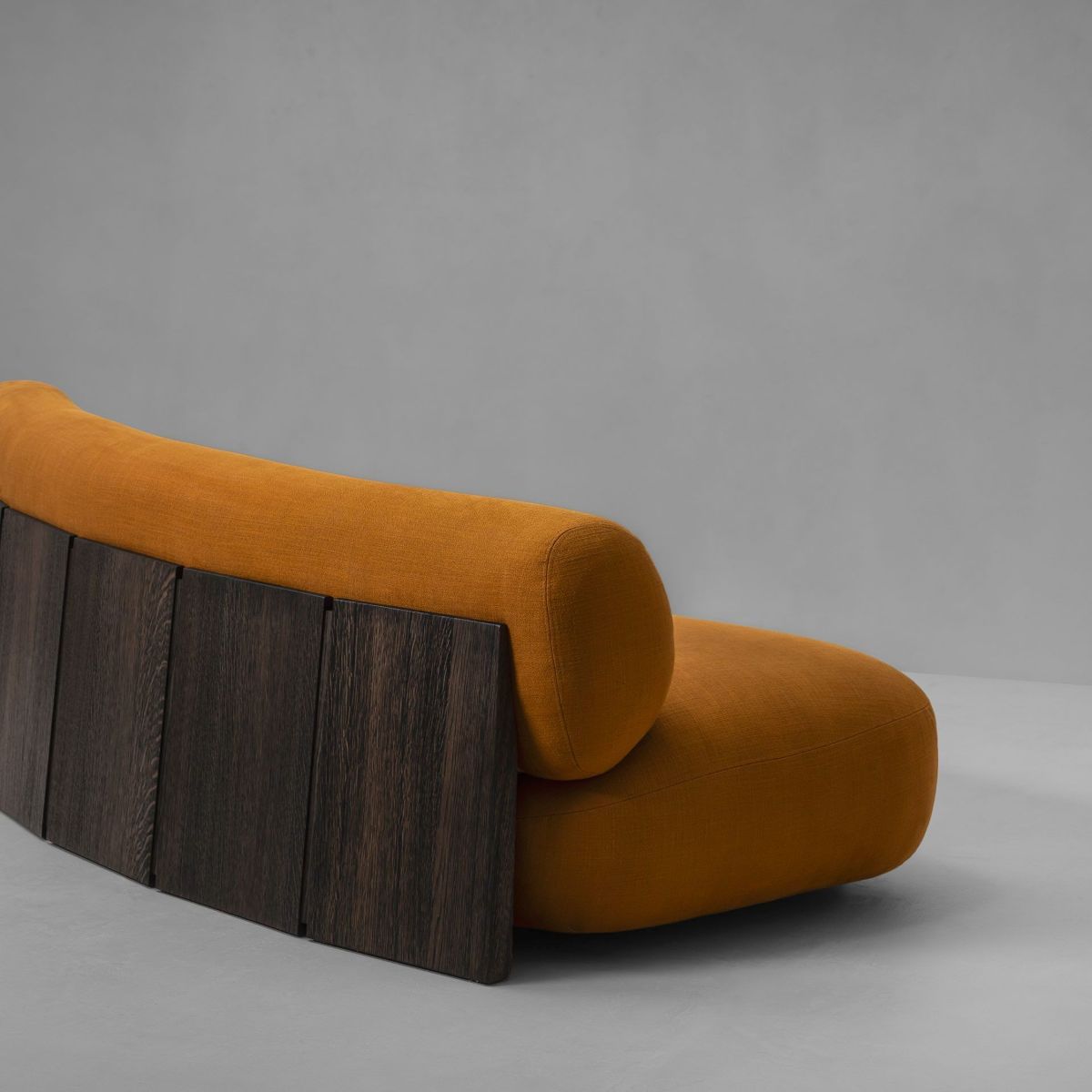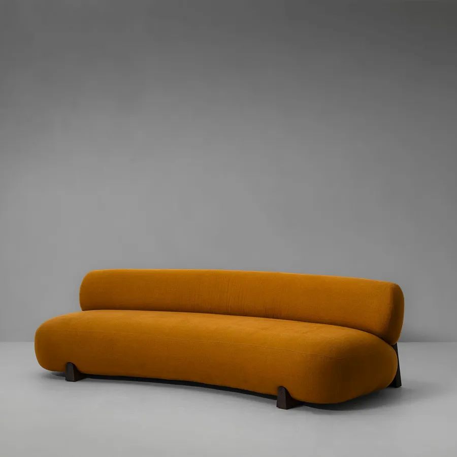 A lounge sofa with a low-slung profile, featuring a plush seat and delicately curved backrest that together provide ample support. It features a wooden frame with gently curved partitions that give a nod to fortified structures of the past.