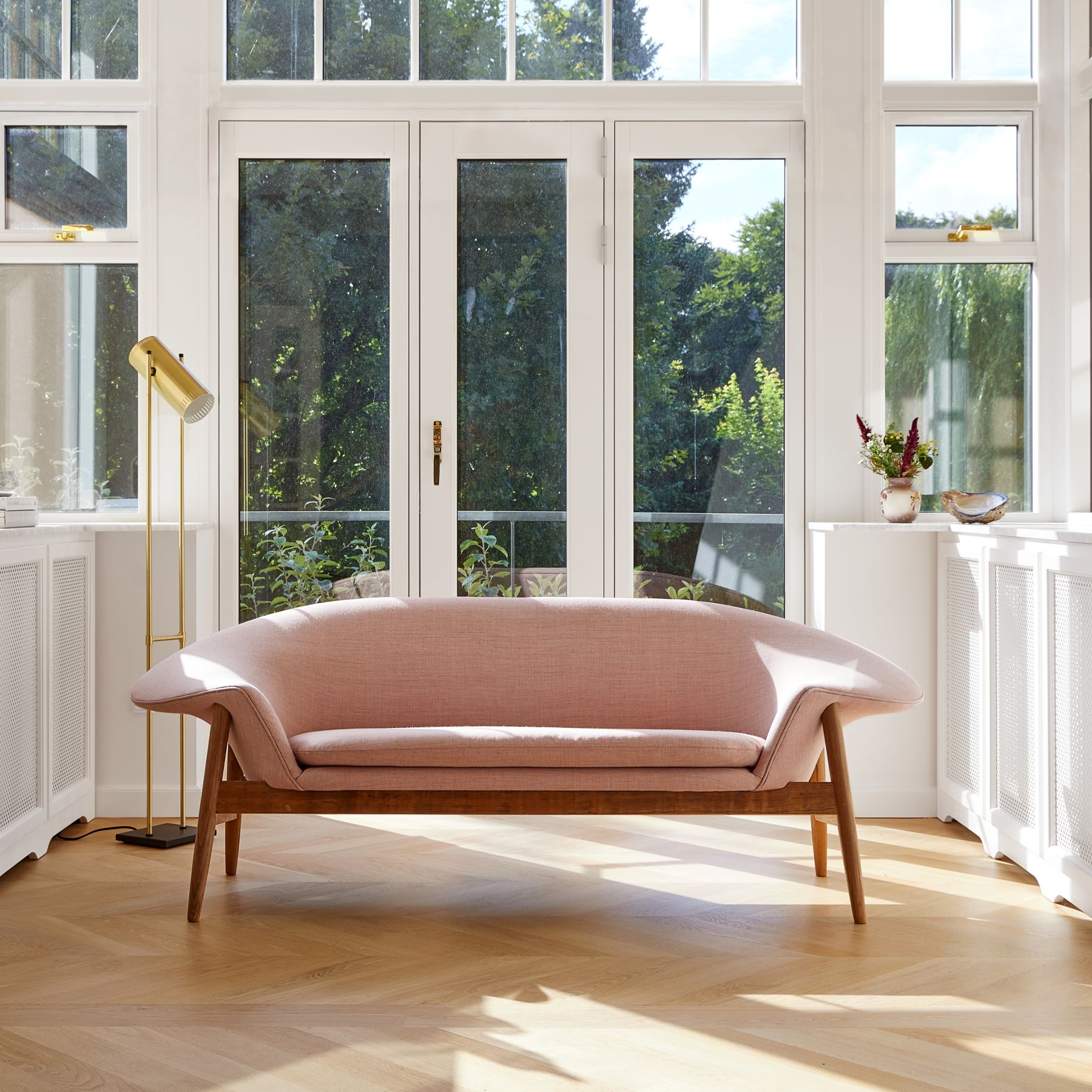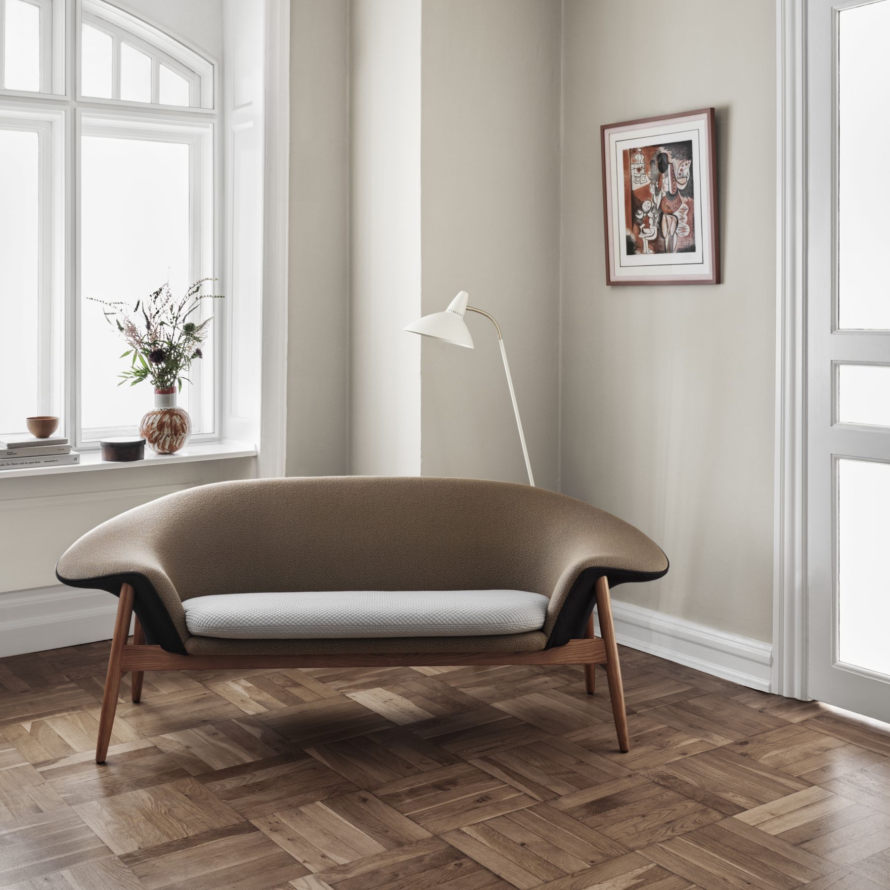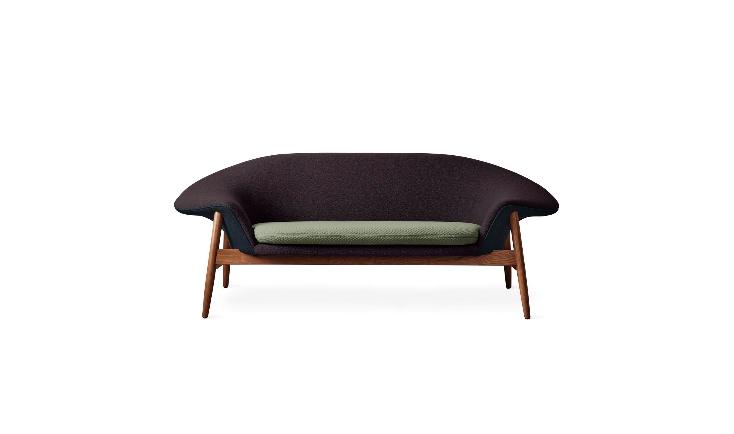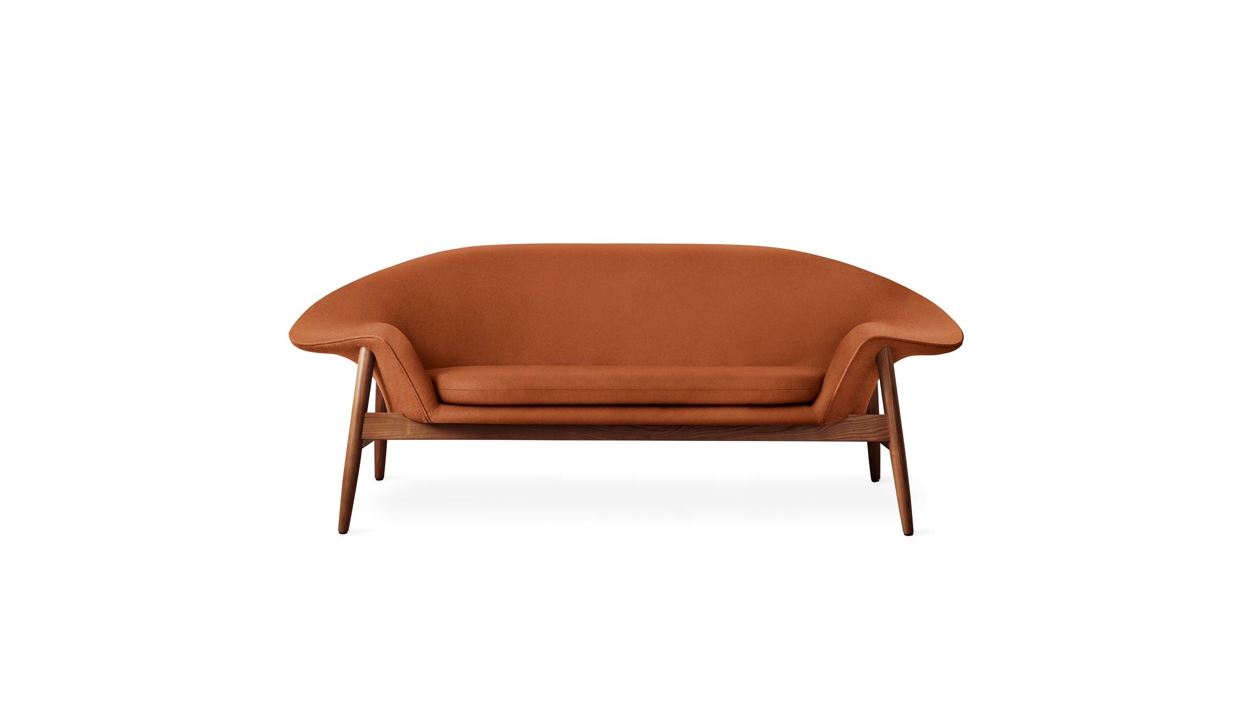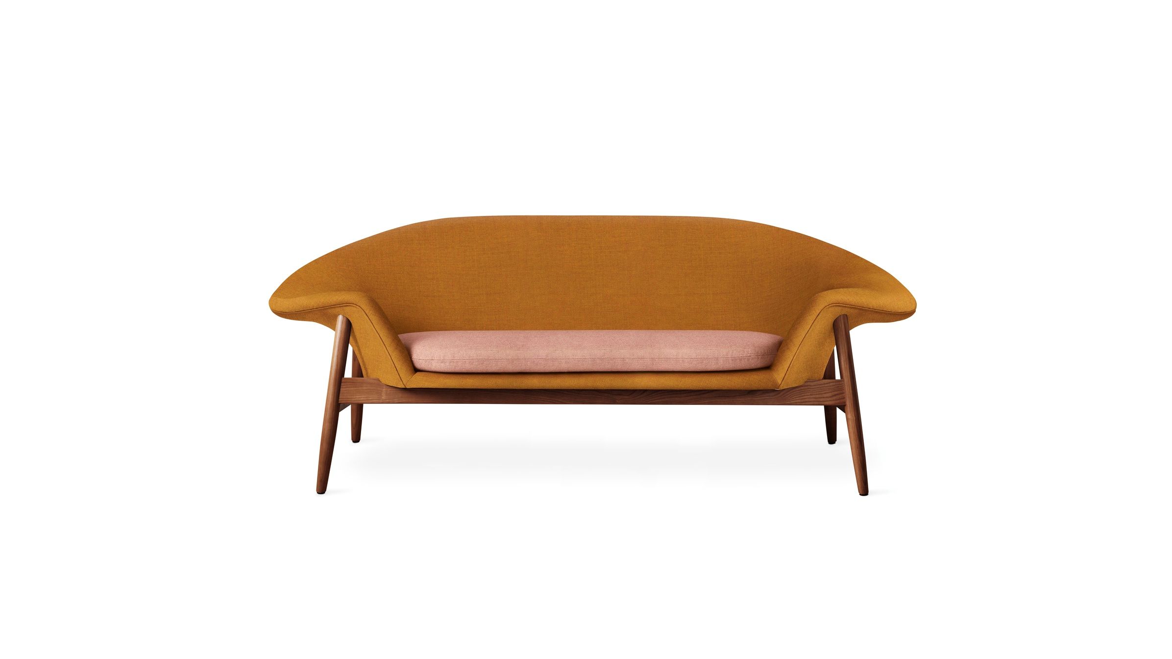 The idiom of the sofa is the same as that of the affectionately-nicknamed Fried Egg armchair, but brings together the playful lines in a friendly, well-balanced design. The two flat armrests open up to the world, inviting you to get cosy and recline in the sofa.