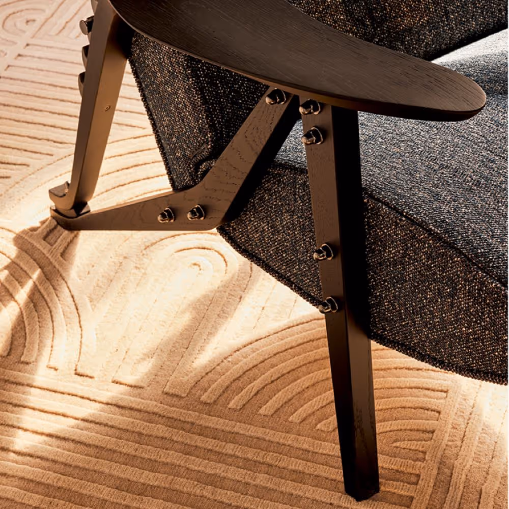 Details and elegance: shaped solid wood and a single element that joins the legs and the cozy armrest, similar to a leaf, large enough to hold a book or a pair of glasses.