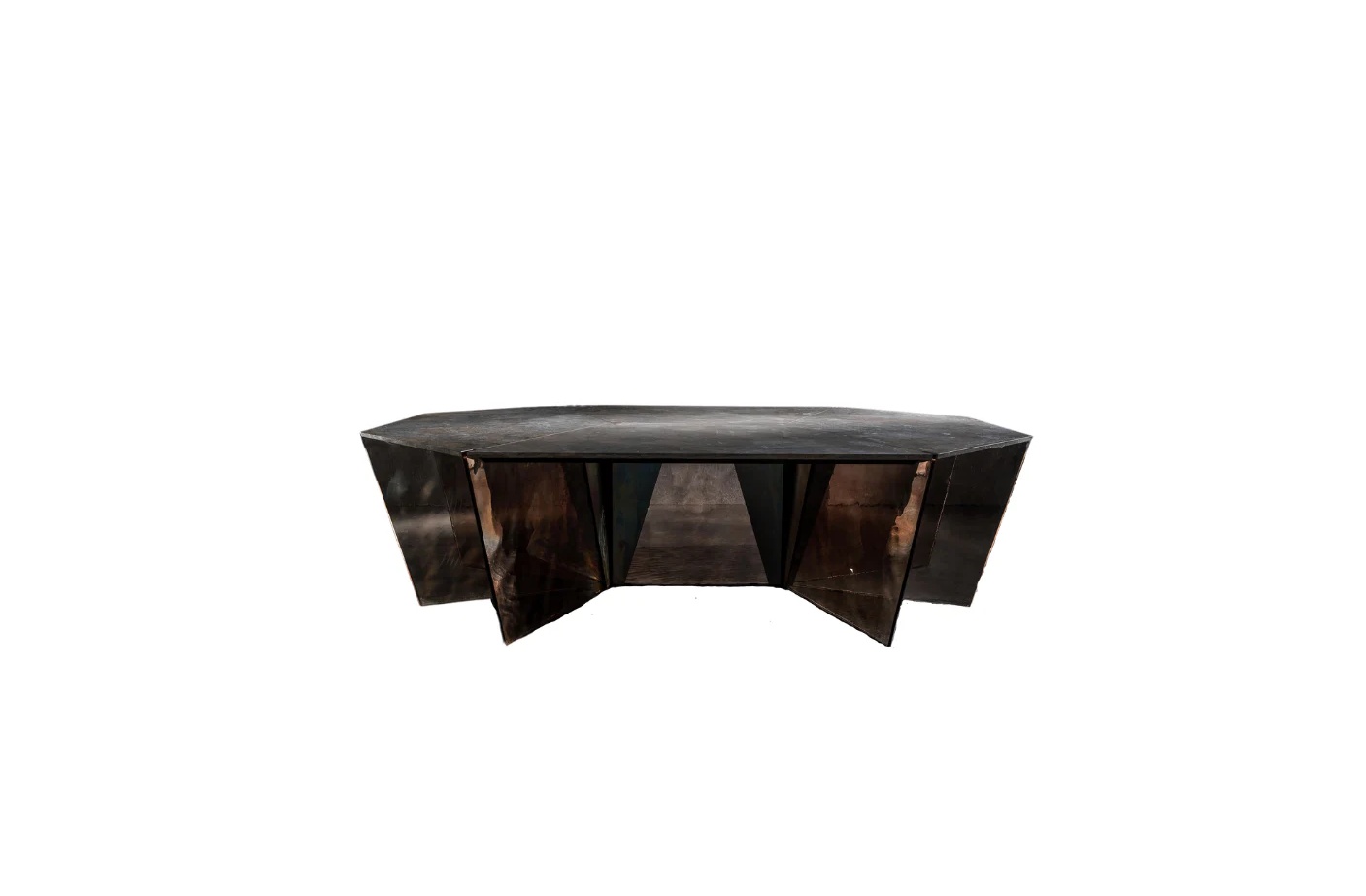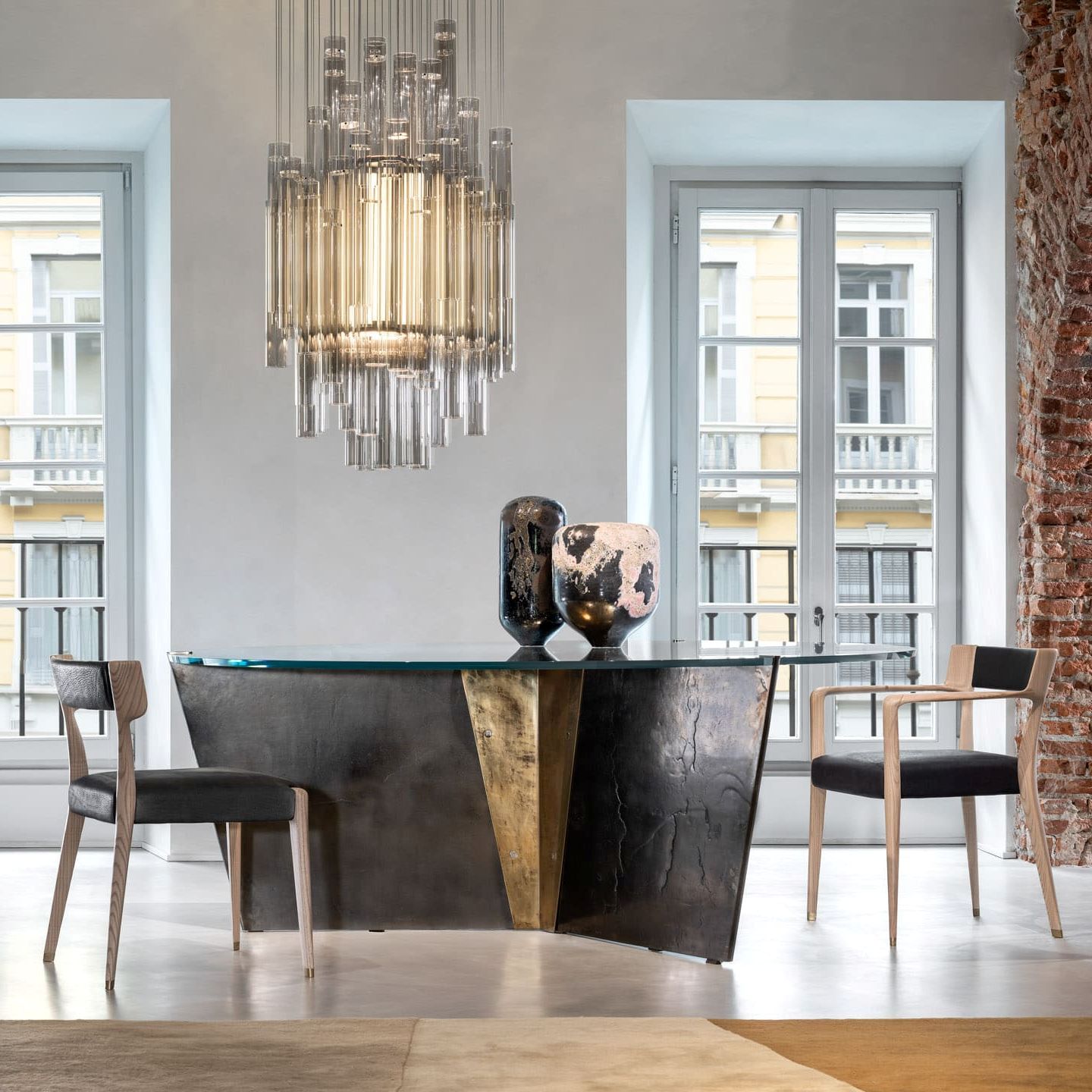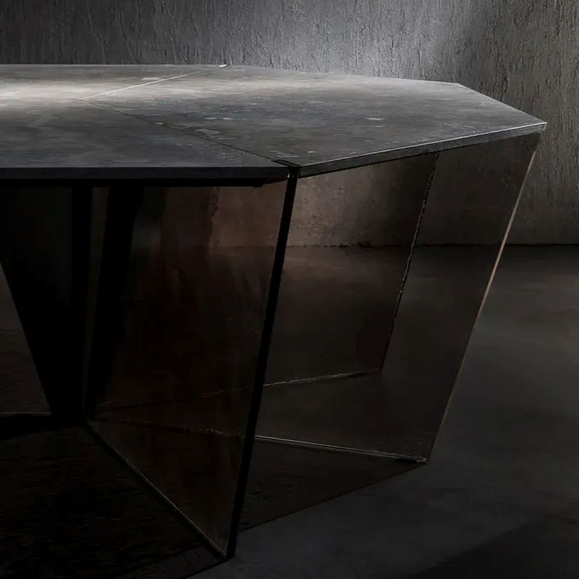 The Gotham table, an unexpected synthesis of solidity and lightness, combines a refined octagonal top in natural stone with slender triangular legs in cast glass. A diamond nestled among a corolla of evanescent shades.