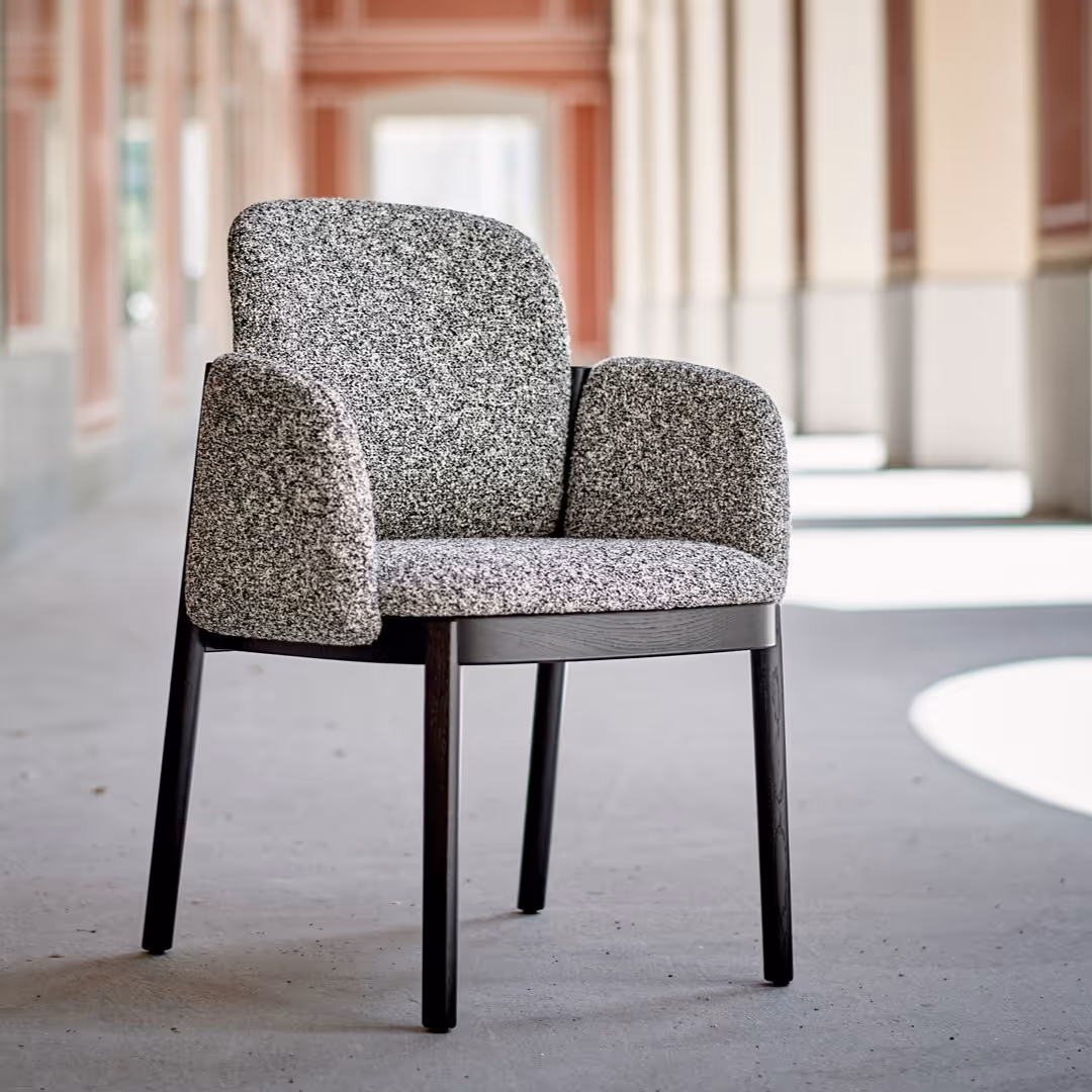 The soft upholstery of Sebastian Herkner’s Granville Bridge Chair reflects the serene grey skies of Vancouver while the hardwood structure imitates the suspension bridge itself with its supportive bent plywood back.
