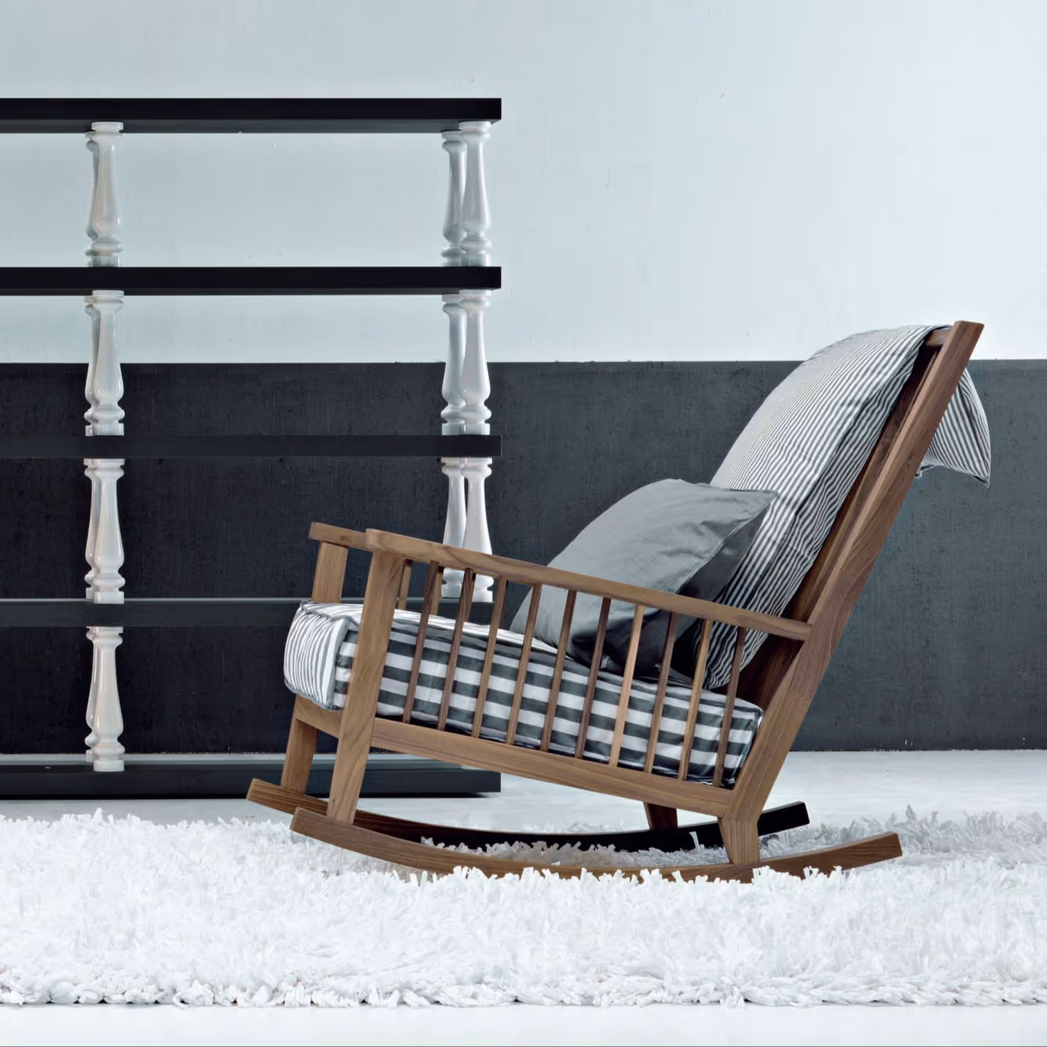 Rocking chair in wood, Gray 09 is characterised by a high backrest with visible slats on which a soft loose cushion rests. The structure, with a large and welcoming seat, is made of natural painted Canaletto walnut, bleached oak or white, grey, black, ocean, dove-grey, date, blueberry and ginger lacquered oak.