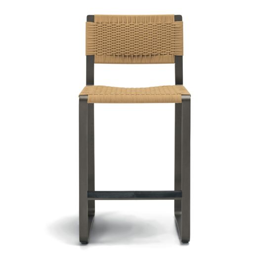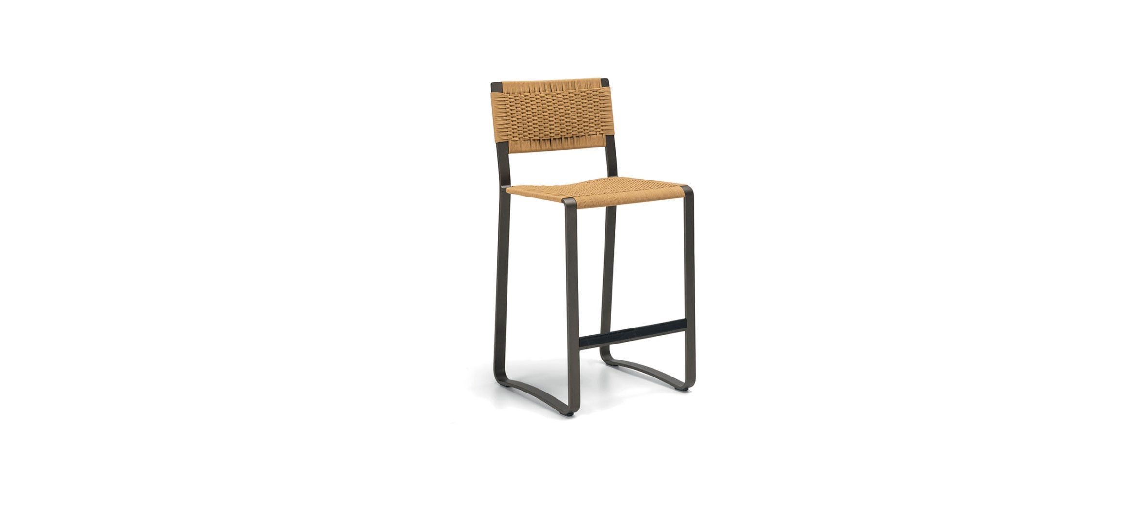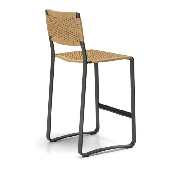 More compact in its seating dimensions, the stool from the Timeout Collection has a slender structure, characterised by a flat band in burnished painted aluminium with no corners. Seen in profile, the slender thickness of the band gives the stool a delicate, airy silhouette, contrasting with the dense, textured upholstery in the traditional weave pattern that characterises the entire Timeout Collection.