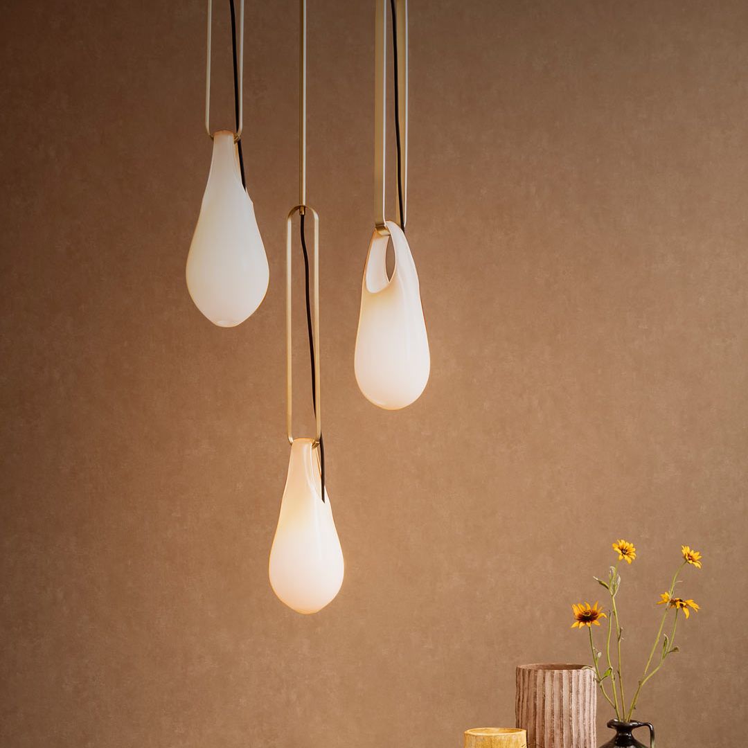 The brass socket is suspended on an exposed fabric-wrapped electrical cord from the top of the “pin” and suspends the light bulb within the opening at the top of the glass. The “pin” element is available in two lengths. Available in multiple glass color combinations, and brass hardware finishes. Part of the SkLO + AvroKO collection – a collaboration between SkLO and the AvroKO Partners.